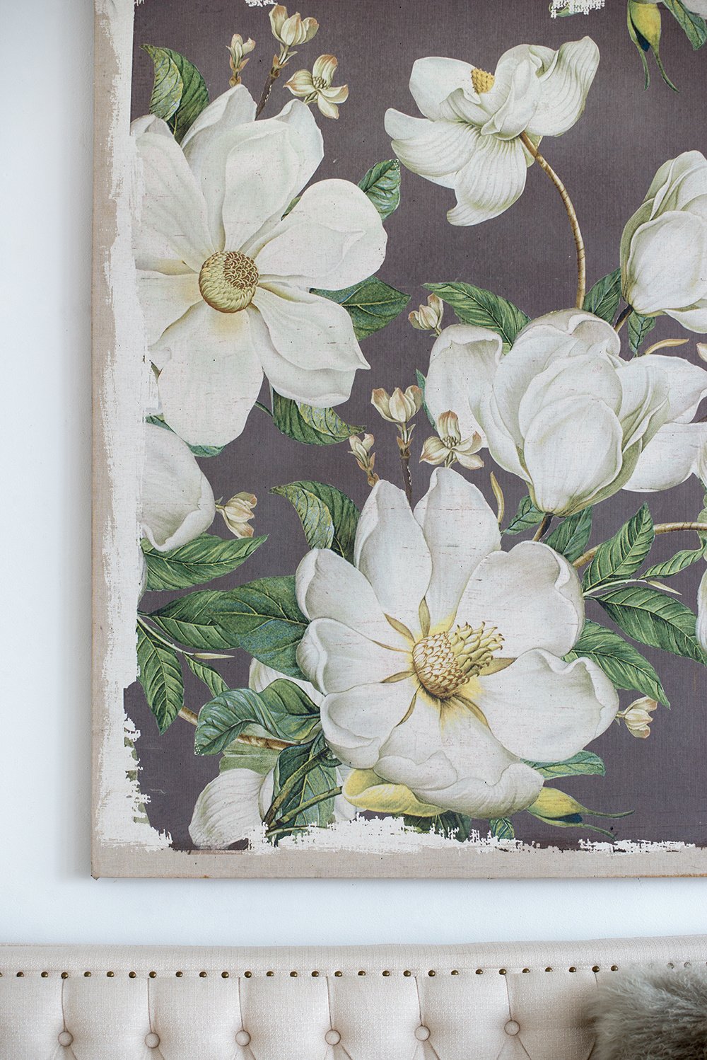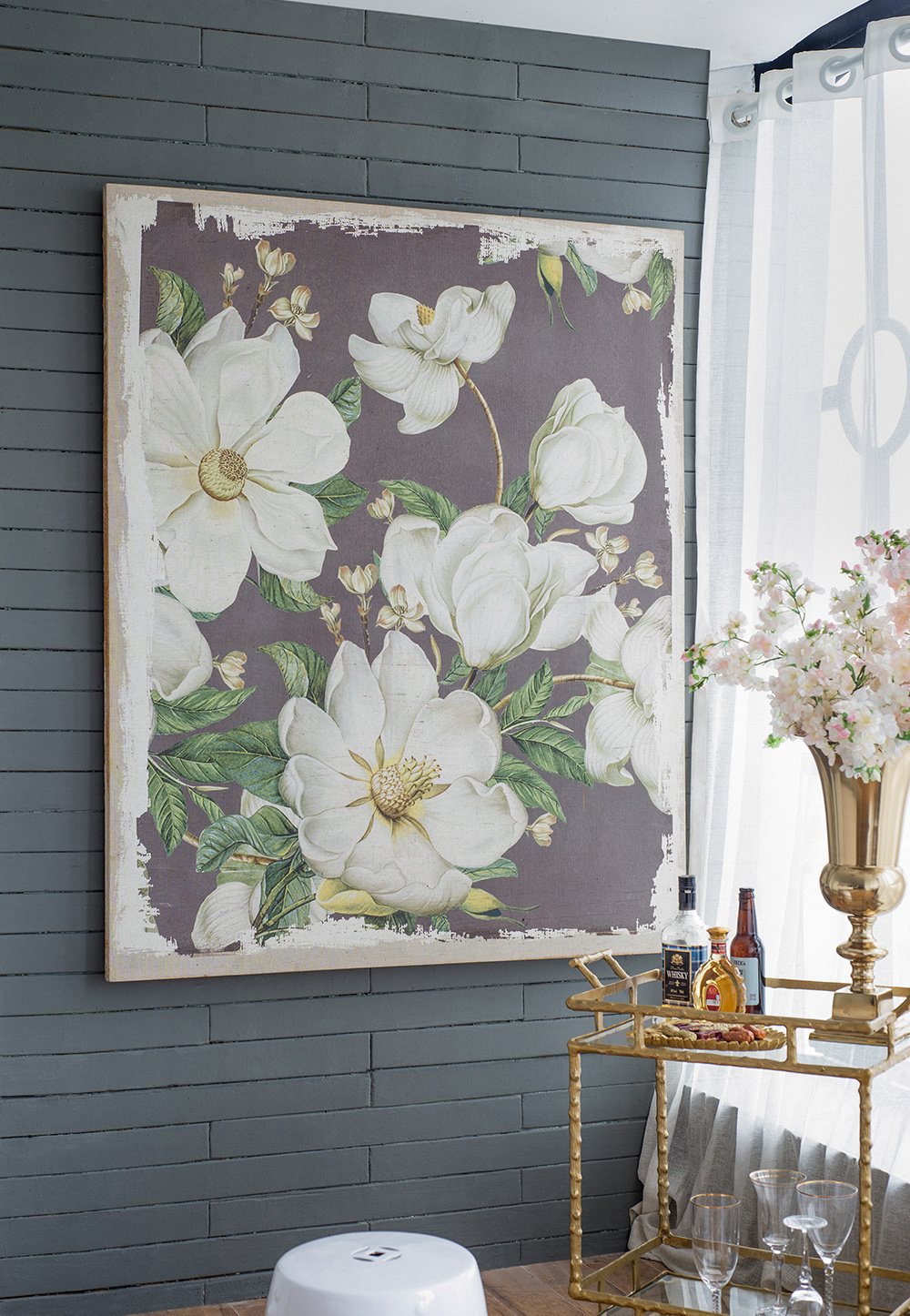 Featuring brilliant white flowers against a rich gray background, the Magnolia Blooms Canvas Print adds glamour and vintage style to your space. Transform a wall in your home with this stunningly detailed print. With its impressive size and opulent look, the Magnolia Blooms Print makes an elegant statement in a master bedroom, living room, or sunroom.