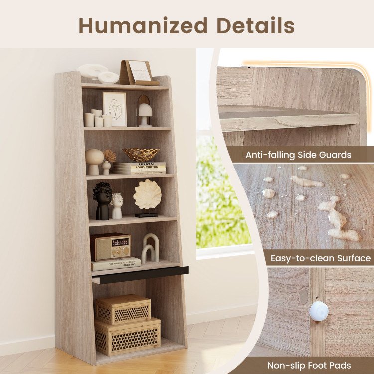4.Humanized Details: The stable ladder bookshelf is also equipped with an anti-tipping kit, which keeps it from wobbling or tipping over. In addition, with anti-falling side guards, the top shelf accommodates items and prevent falling accidents.