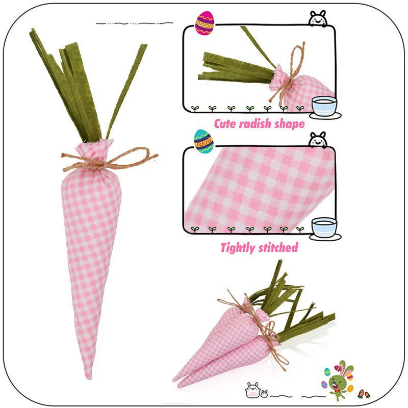 Carrots are decorated with dark green and lifelike radish leaves; bow knots and hemp ropes; which look vivid and lovely. Soft and durable; bright color; can serve you for a long time.