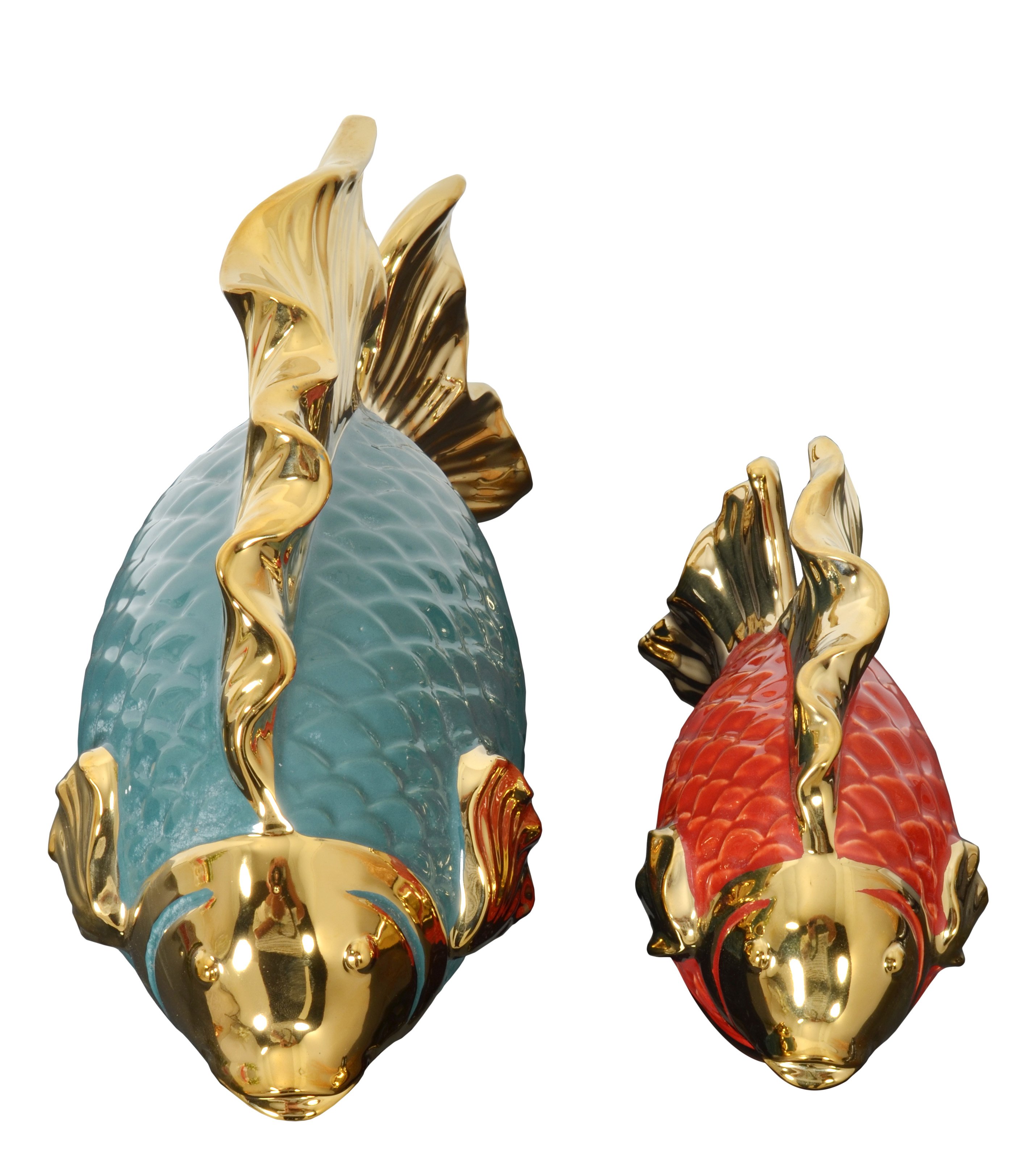 Fish Colorful Set of 2 features 2 hand cast porcelain Fish sculptures with vibrant colorful finishes and accent of gold plating. A perfect display for a coastal theme or anyone who appreciates the splendor of these cute fishes. No assembly Required.