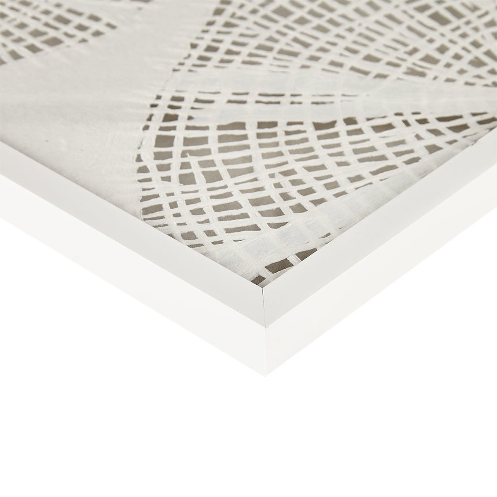 Contrasted against a soft linen and protected by glass and white shadow box frame