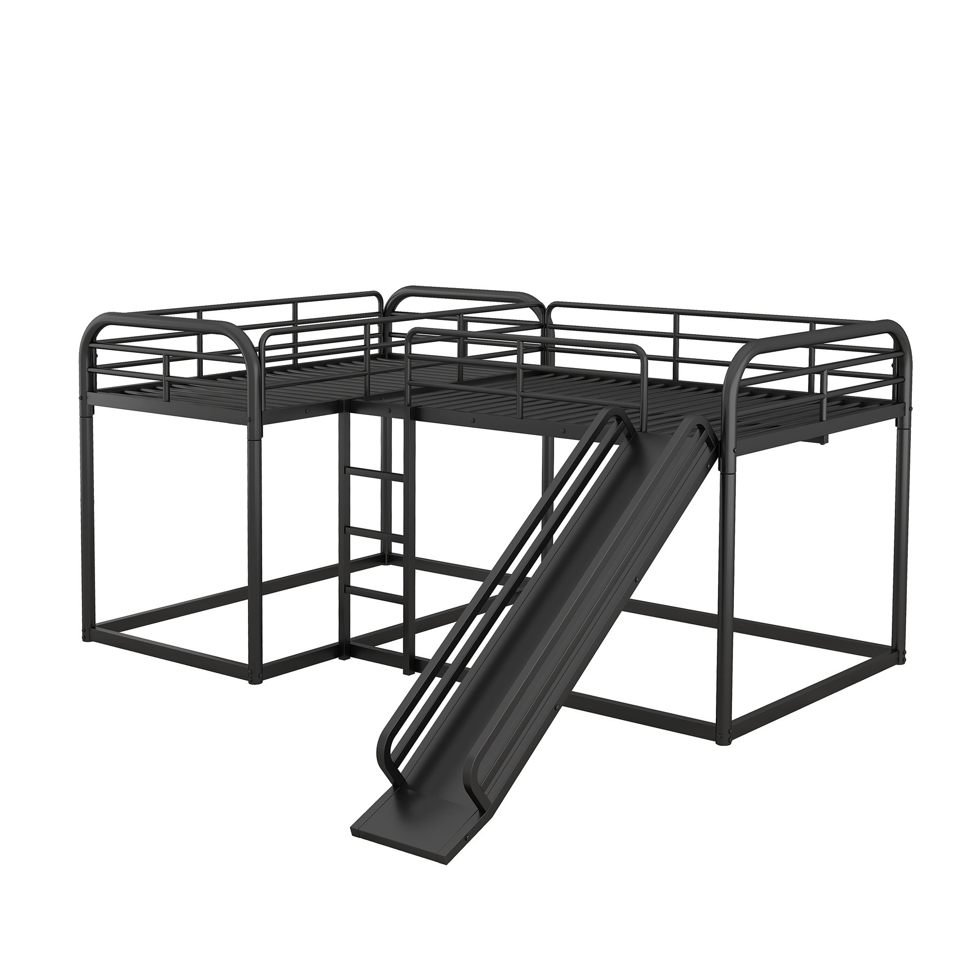 This functional L-Shaped bunk bed, constructed of metal, is both stylish and durable.These beds are perfect for your family, sleepovers or your extra guest sleeping at your lake house getaway. Solid metal frame ensures stability and durability for long-term use. Slat kit included so box springs are not required. This L-shaped bunk bed is designed with a clean silhouette. It suits all styles of home decoration, and completes the look of any bedroom.