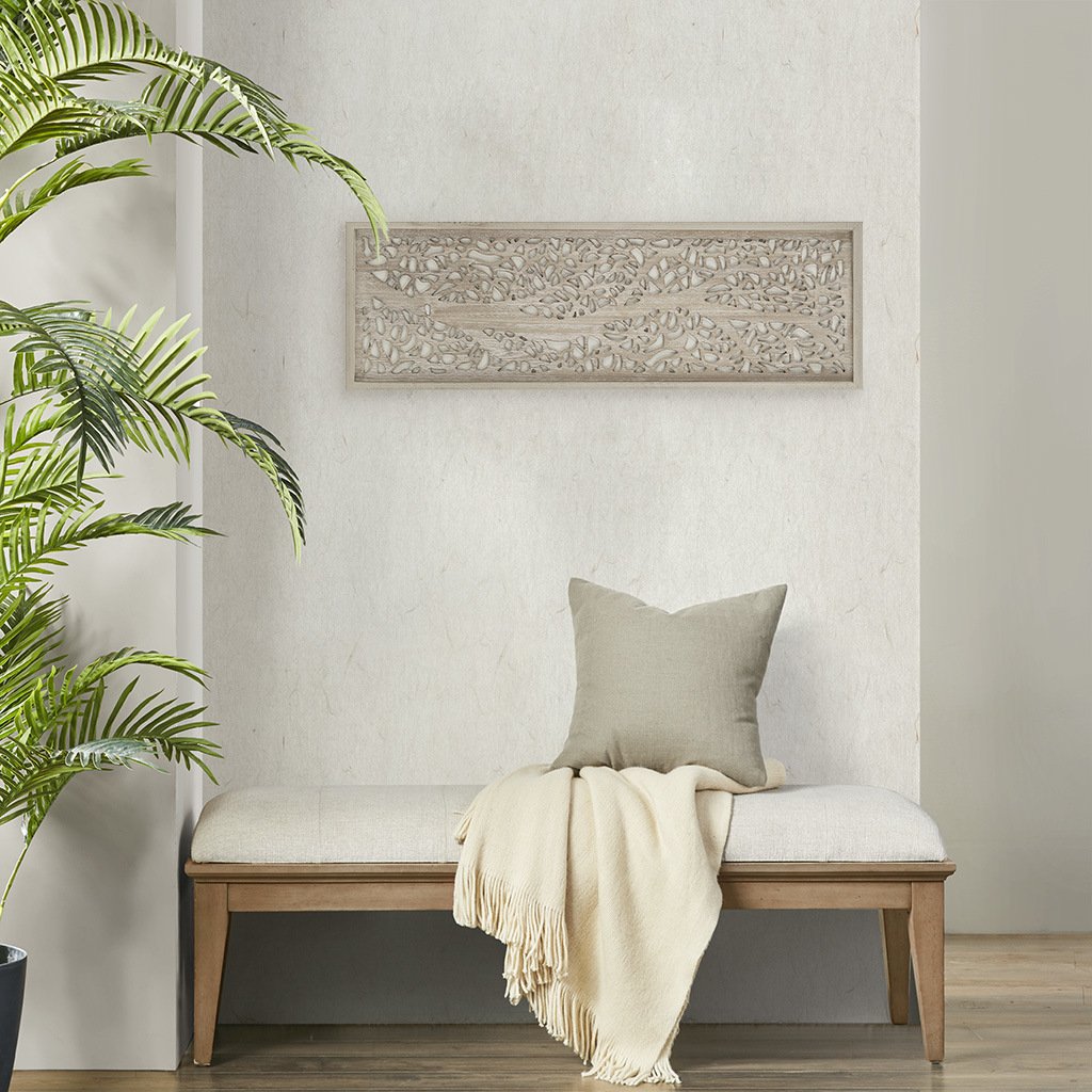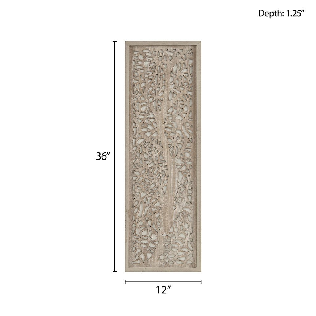 Revive your home with our Madison Park Laurel Branches Laser Cut Tree Framed Panel Wall Decor by Artist Emily Warne. This alternative wall art features a laser-cut MDF botanical branch design in a natural tone for a rustic and stylish touch, while the 100% fir wood frame adds a natural and modern update. Measuring 12x36" and featuring 4 D-rings on the reverse, easily hang this piece both vertically or horizontally for a beautiful botanical addition to any room or decor.