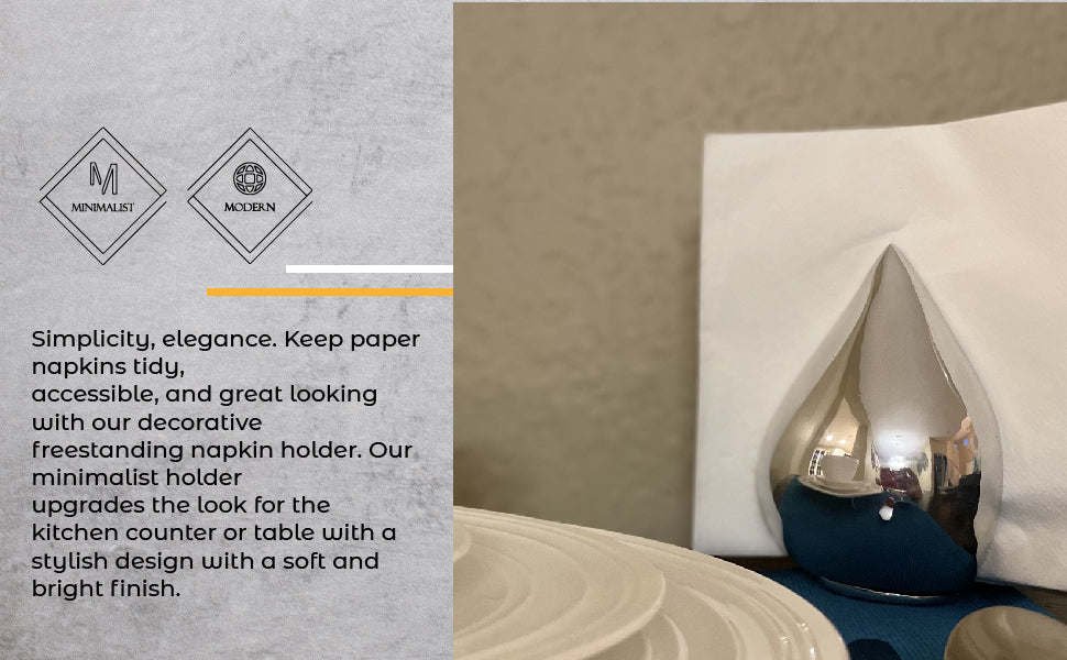 Simplicity; elegance. Keep paper napkins tidy; accessible; and great looking with our decorative freestanding napkin holder. Our minimalist holder upgrades the look of the kitchen counter or table with a stylish design with a soft and bright finish.