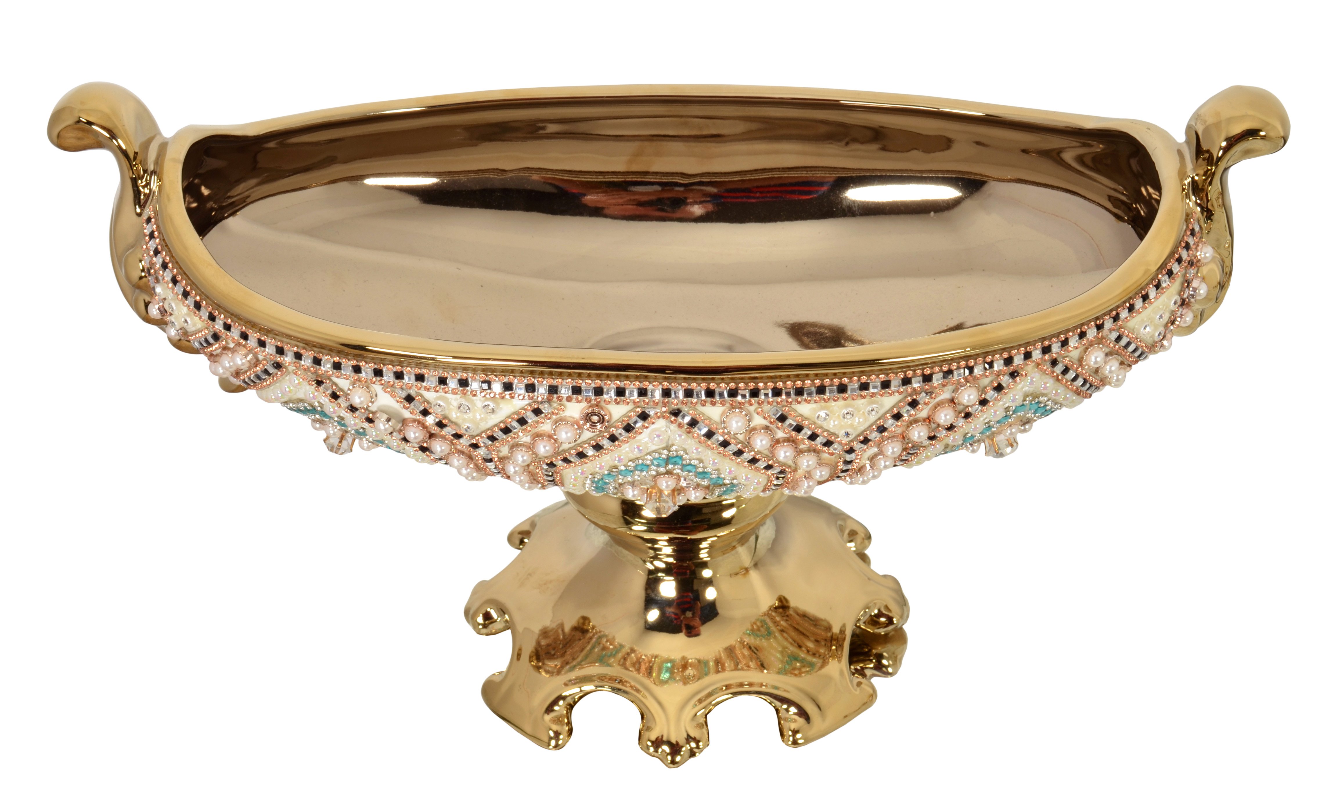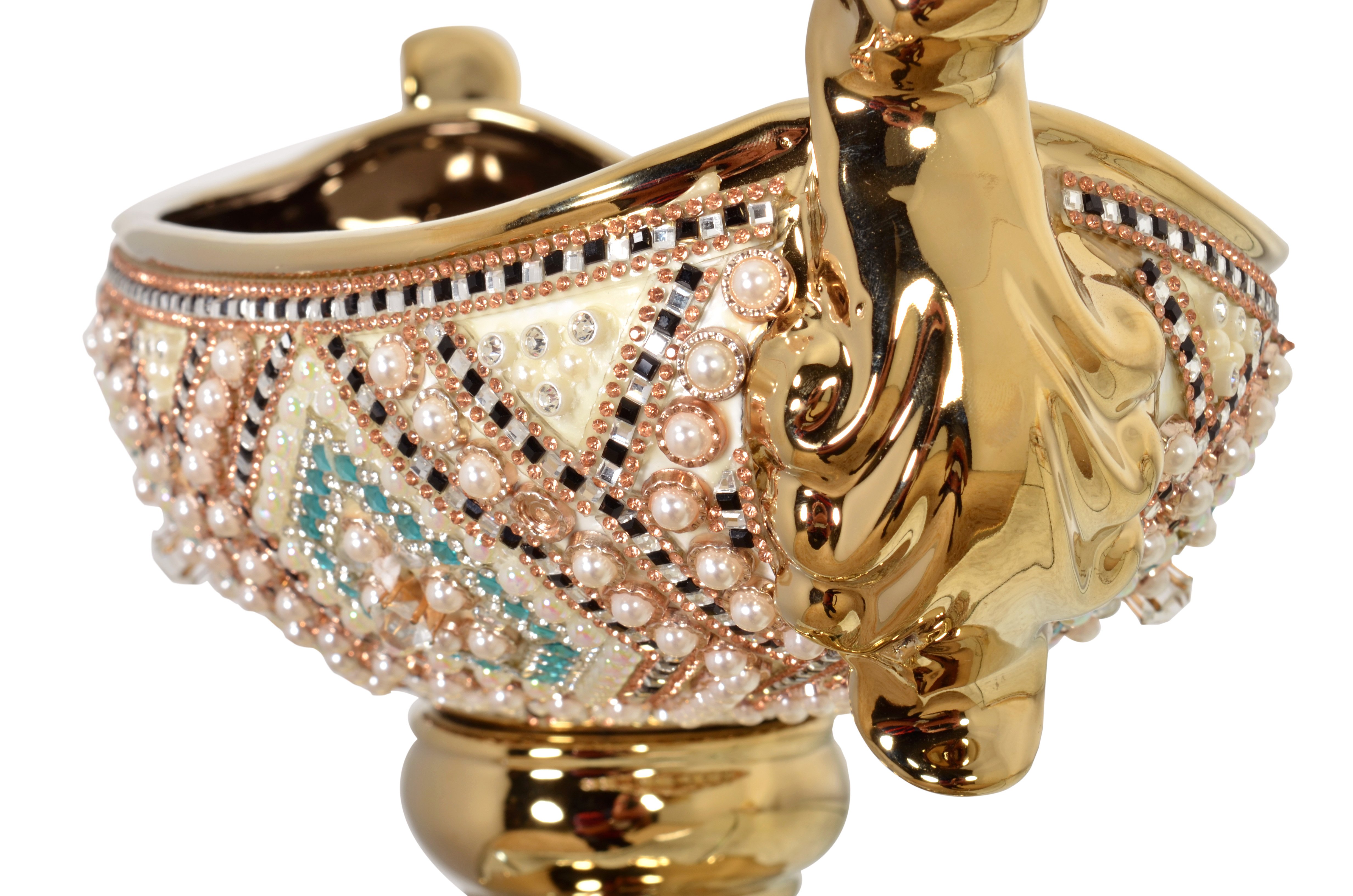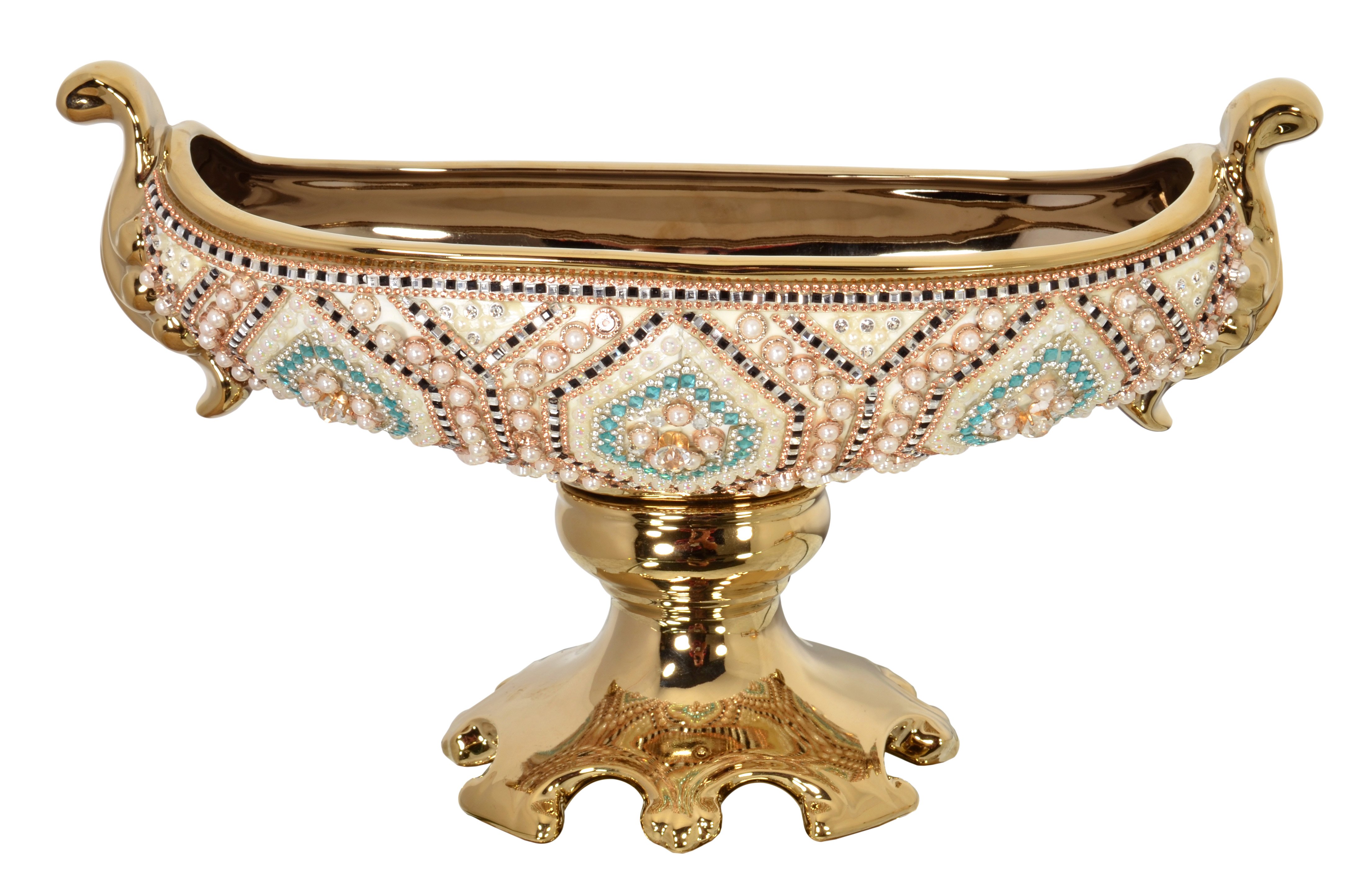 A 15.5 inch wide contemporary designed Moroccan Pedestal Tureen or Center Bowl. The color combination is rich looking. It is a fresh and pleasing combination offering a modern vibe to traditional elements of design. Hand Cast in porcelain with Gold Plating. The Vase is adorned with hundreds of hand applied Rhinestone crystals and faux pearls arranged in striking colors of ivory, blue, clear, further contrasted by black accents and a striking gold base. Consider balancing this centerpiece with a pair of Moroccan Chalice Vases or other items from the new Moroccan Series. No Assembly Required.