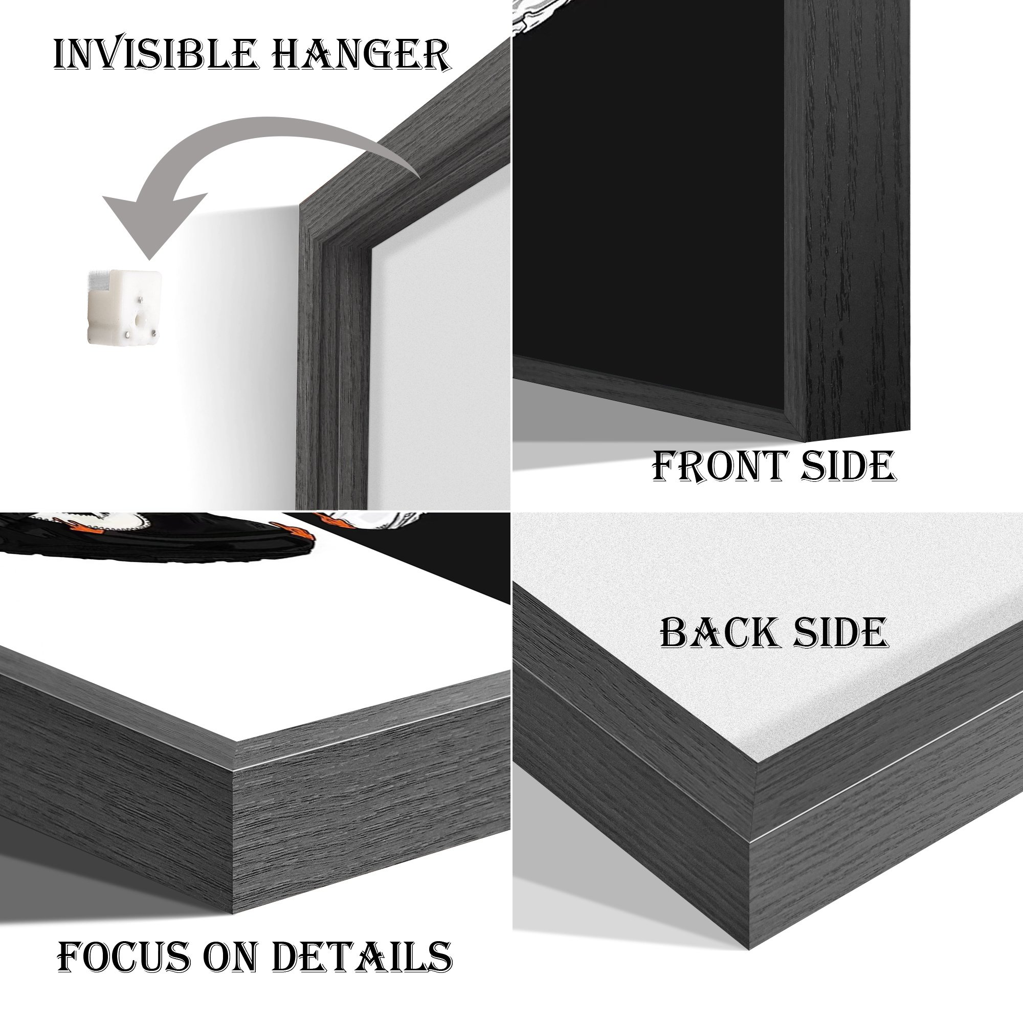 [Picture Frame]Solid wood frame; Wood texture; Not easily deformed; Impermeable dust and corrosion resistance. Hidden metal anti slip hook; We also provide you with unmarked wall studs. Can be installed quickly.