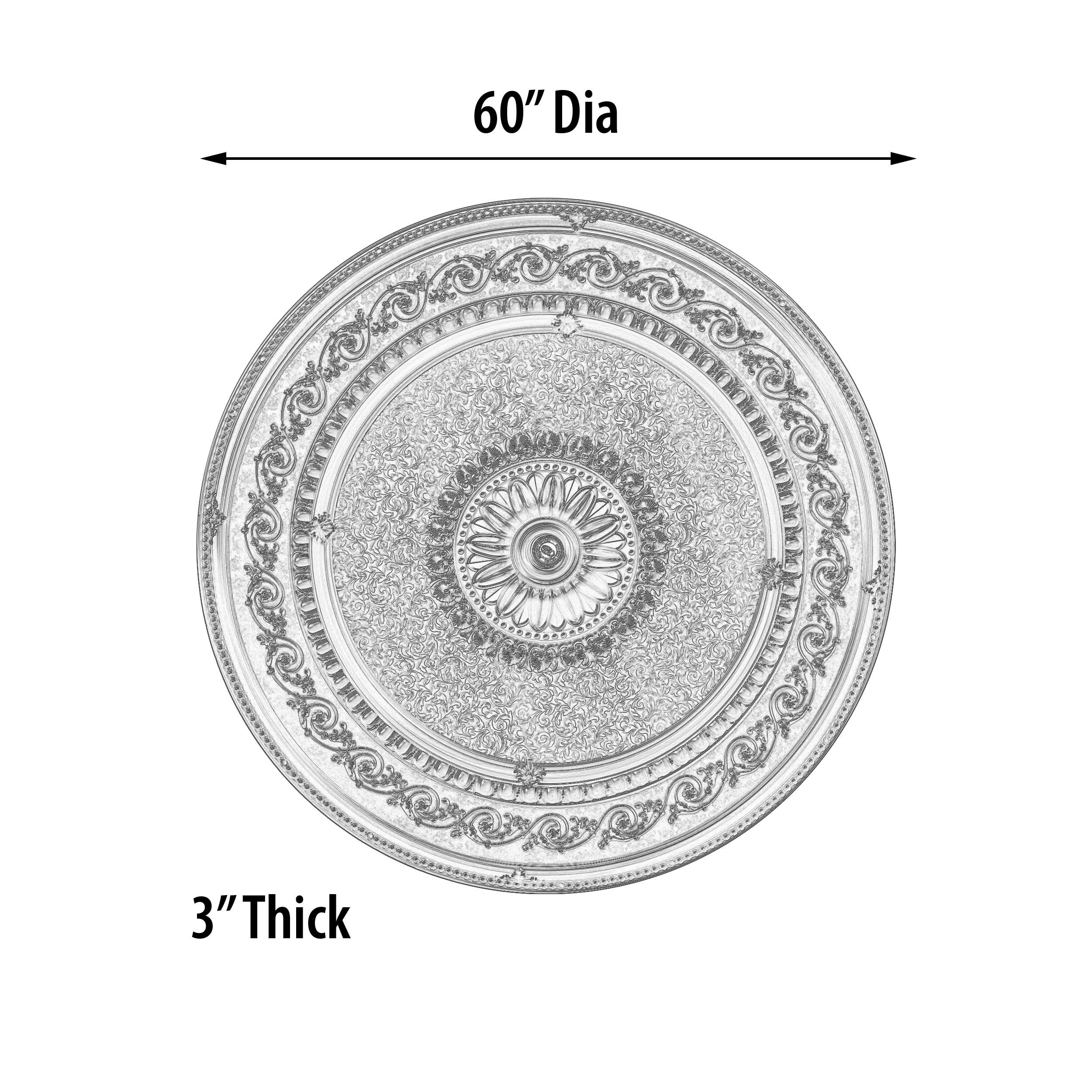 The Golden Dream Round Chandelier Ceiling Medallion 60 Inch Diameter is a fully assembled and intricately finished Ceiling Medallion. This creation comes prefinished in beautiful Gold and Antique White Border surrounding a recessed center panel with a slightly raised scroll motif created in a Shimmering Gold Finish. This completely finished Architectural Ceiling Medallion creates instant 3 dimensional detail to an otherwise boring plain ceiling. Also a crowning Elegance to a Chandelier Installation, which is often a good time to install your selected Medallion. The item comes fully finished out of the package and is Hand Cast in a lightweight Polystyrene that will never shrink, split or crack. Prior to Masterpiece Moldings creation of this Collection by AFD Home, the only way to have had an advanced ceiling with this level of design would have been a very expensive addition and an owner willing to take on an elaborate installation project, requiring carpenters, finishers, and in some instances even artists. One of the best parts about this item is that installation could not have been made easier, as the outer ring is created with a cabochon design allowing intermittent spaces specifically created as locations for your screws or hollow wall anchors, matching decorative caps are even provided that will cover the screw heads of your anchors and offer a complete professional looking install. A 1.5 inch center hole is provided for the installation of chandeliers and fans. The overall measurements are 60.00 x 60.00 x 3.00. Hollow wall anchors or installation screws are available at your local hardware store, as your need will vary depending on your ceiling.