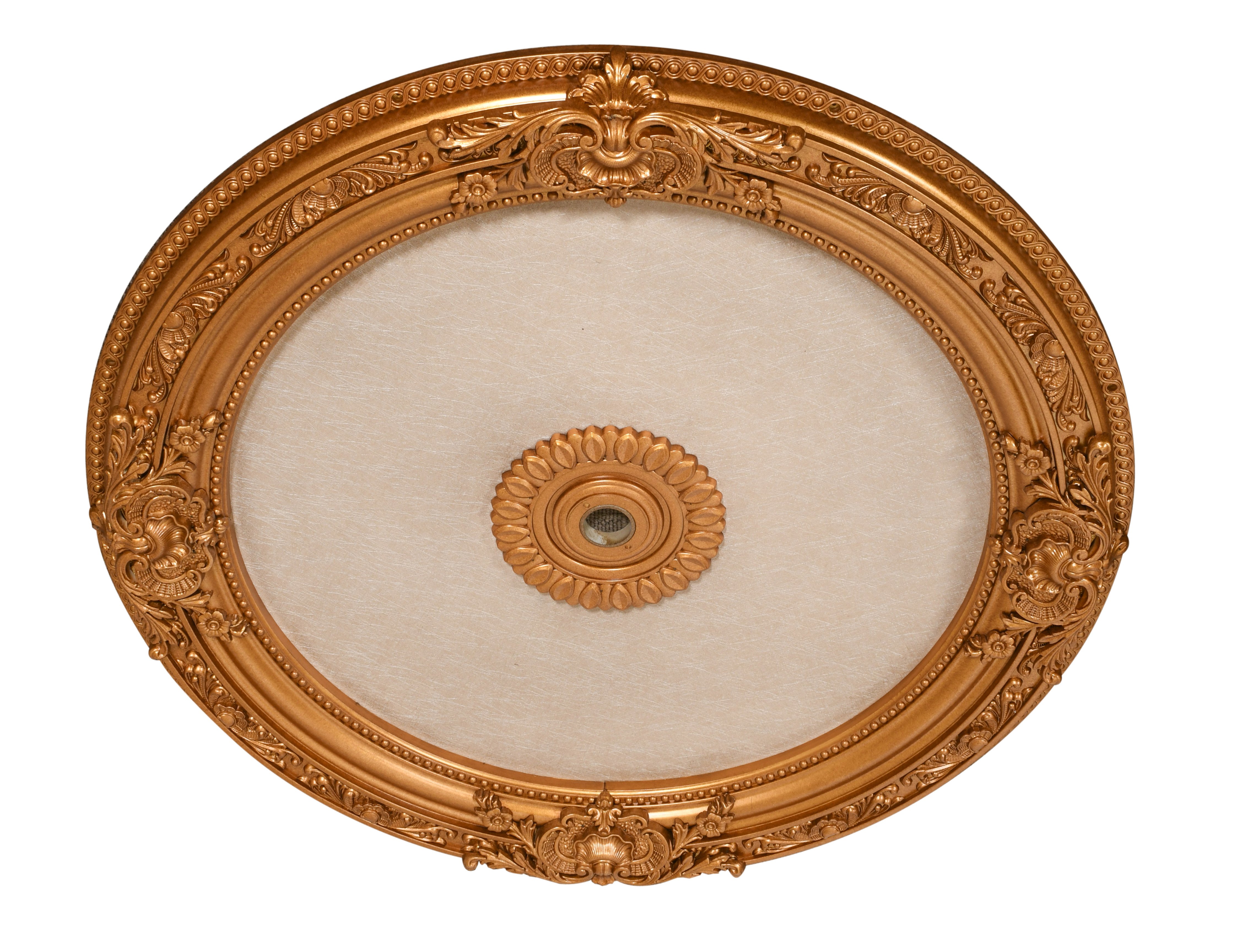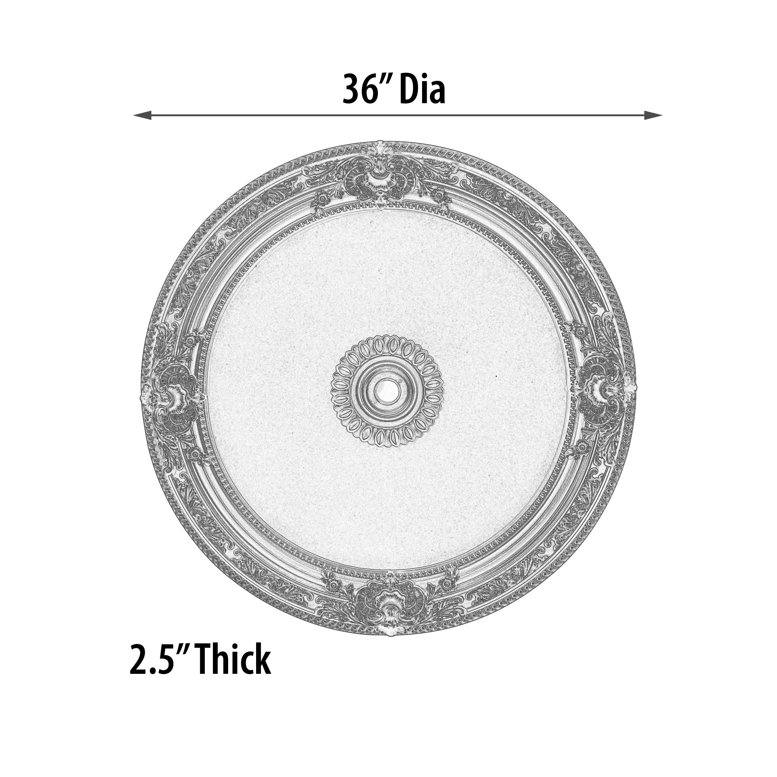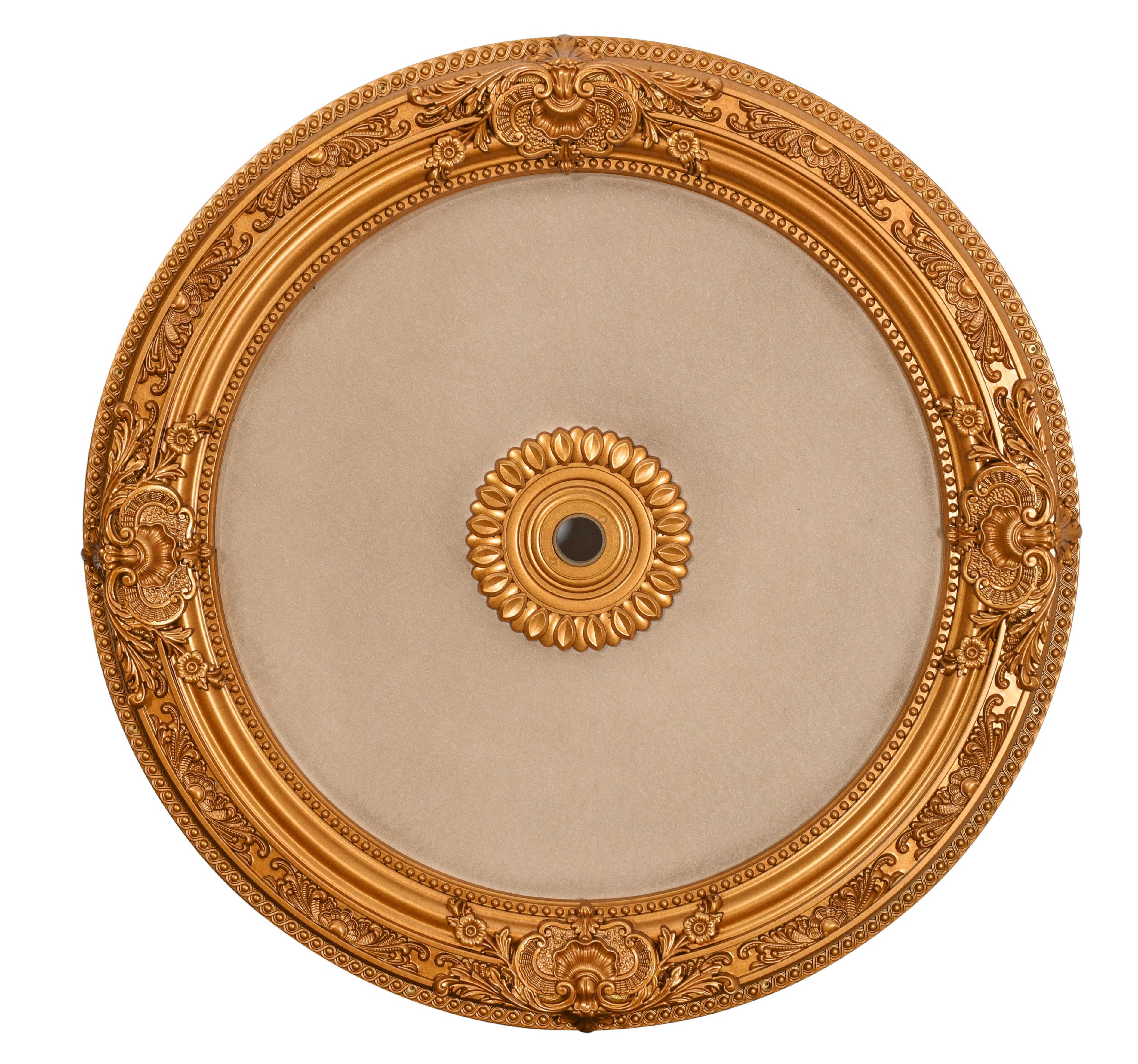 The Gold Beige Round Ceiling Medallion 36 Diameter is a favorite sized, fully assembled and intricately finished Ceiling Medallion. This medallion has a very placeable, classically inspired design and finishes featuring a soft gold with a neutral field. This completely finished Architectural Ceiling Medallion creates instant 3 dimensional detail to an otherwise boring plain ceiling. Also a crowning Elegance to a Chandelier Installation, which is often a good time to install your selected Medallion. The item comes fully finished out of the package and is Hand Cast in a lightweight Polystyrene that will never shrink, split or crack. Prior to Masterpiece Moldings creation of this Collection by AFD Home, the only way to have had an advanced ceiling with this level of design would have been a very expensive addition and an owner willing to take on an elaborate installation project, requiring carpenters, finishers, and in some instances even artists. One of the best parts about this item is that installation could not have been made easier, as the outer ring is created with a cabochon design allowing intermittent spaces specifically created as locations for your screws or hollow wall anchors, matching decorative caps are even provided that will cover the screw heads of your anchors and offer a complete professional looking install. A 1.5 inch center hole is provided for the installation of chandeliers and fans. The overall measurements are 36 x 3 x 36. Hollow wall anchors or installation screws are available at your local hardware store, as your need will vary depending on your ceiling.
