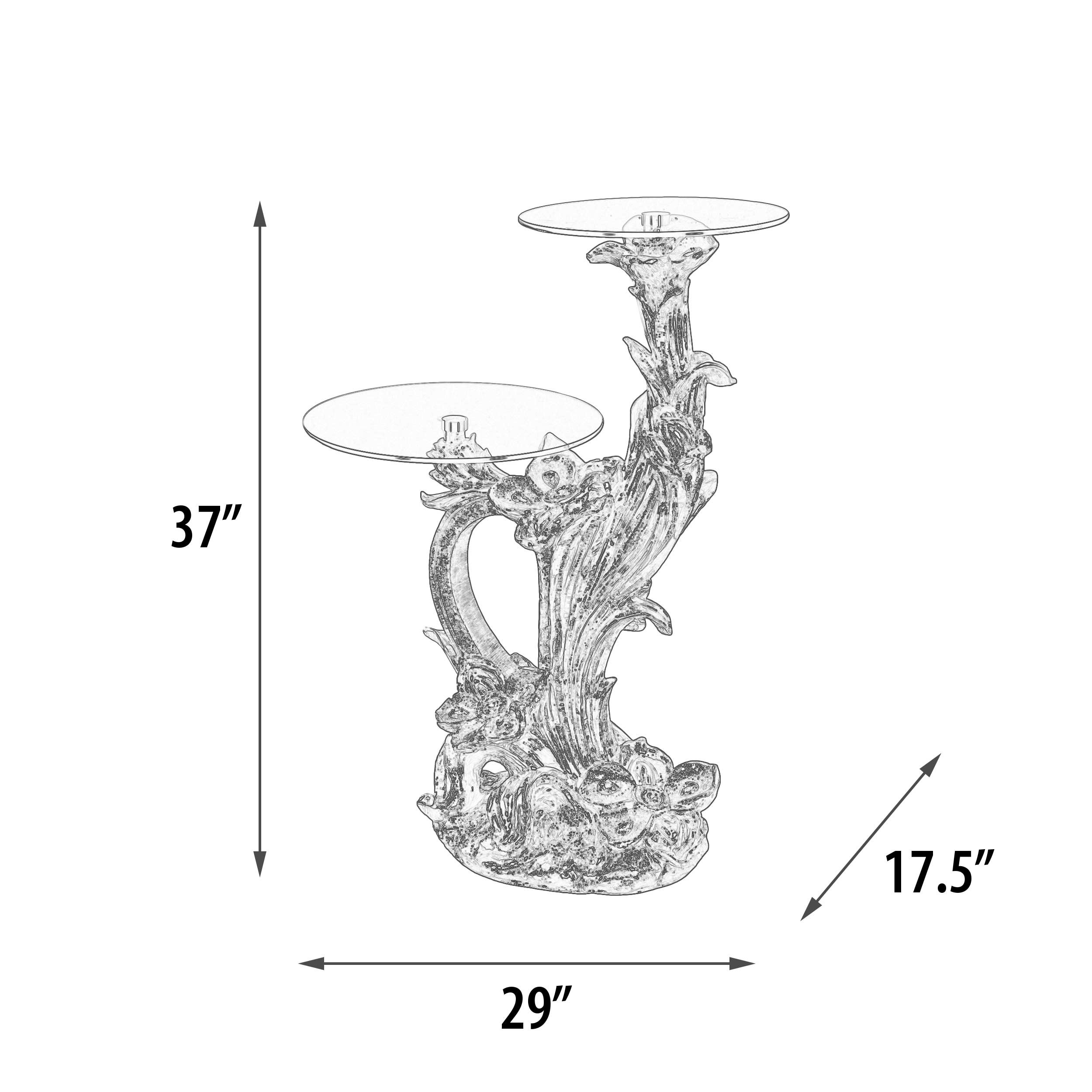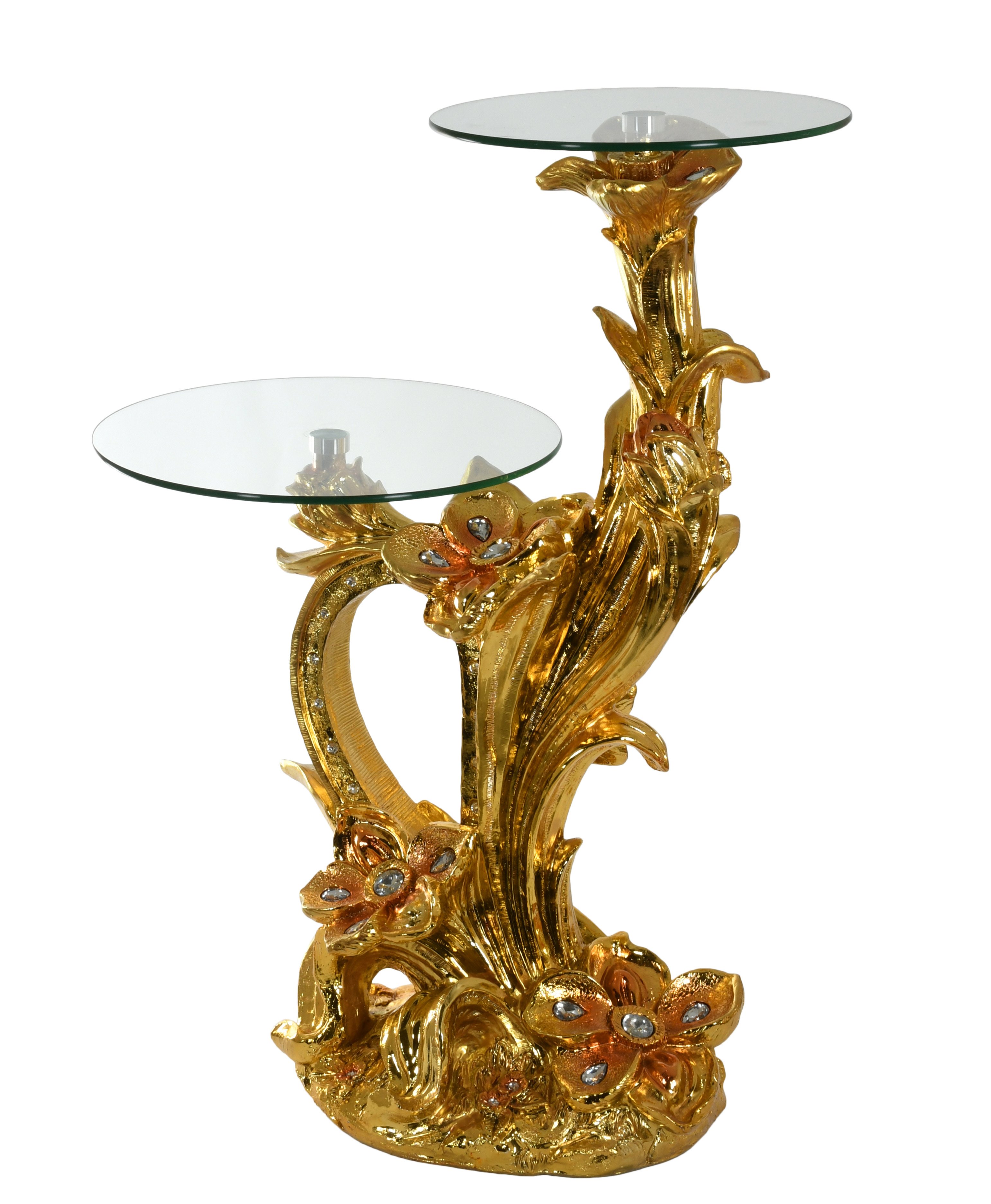 The European Elegance Golden Floral Accent Table is a stunning piece adorned with sculpted floral designs covered in gold and accented with rhinestone crystals. This two-tier display table features glass tops on both tiers, providing a unique and elegant way to showcase your special pieces. Elevate your decor with the allure of European elegance and let this exquisite accent table become a standout focal point that adds a touch of sophistication to any room. Perfect for displaying your cherished items in style and grace.