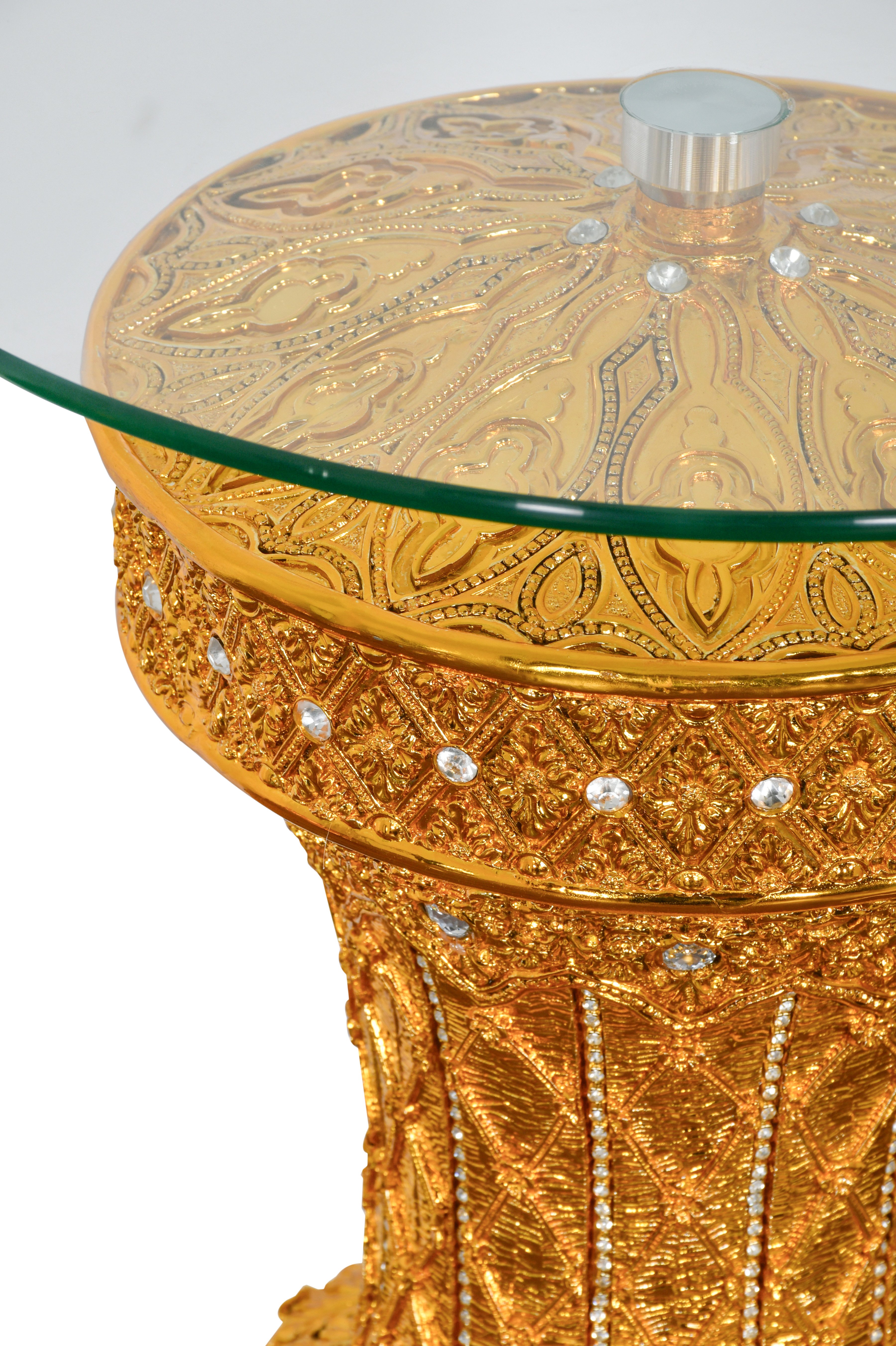 The European Elegance Golden Crystal Pedestal Accent Table is a high-end masterpiece, exuding elegance and luxury. Standing at a height of 35 inches, this table is adorned with gold rhinestone crystals, adding a touch of opulence to its design. The rounded pedestal features faberge-inspired details, making it an exquisite piece for the finest homes in the world. Elevate your decor with the allure of European elegance and let this stunning accent table become a focal point that adds sophistication and grandeur to any space. Perfect for use as a pedestal to showcase treasured items or as an elegant table for everyday use in the most discerning homes.