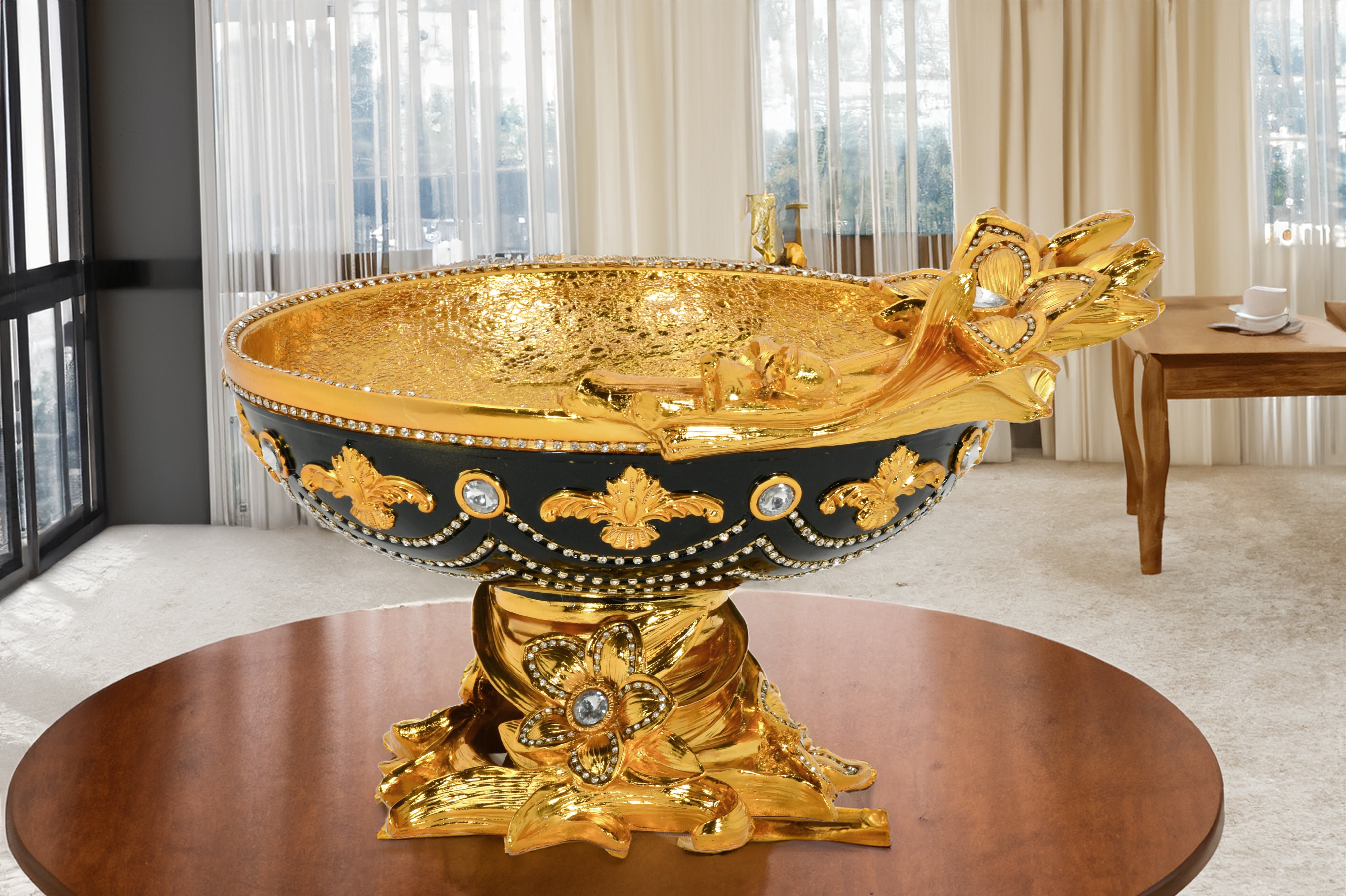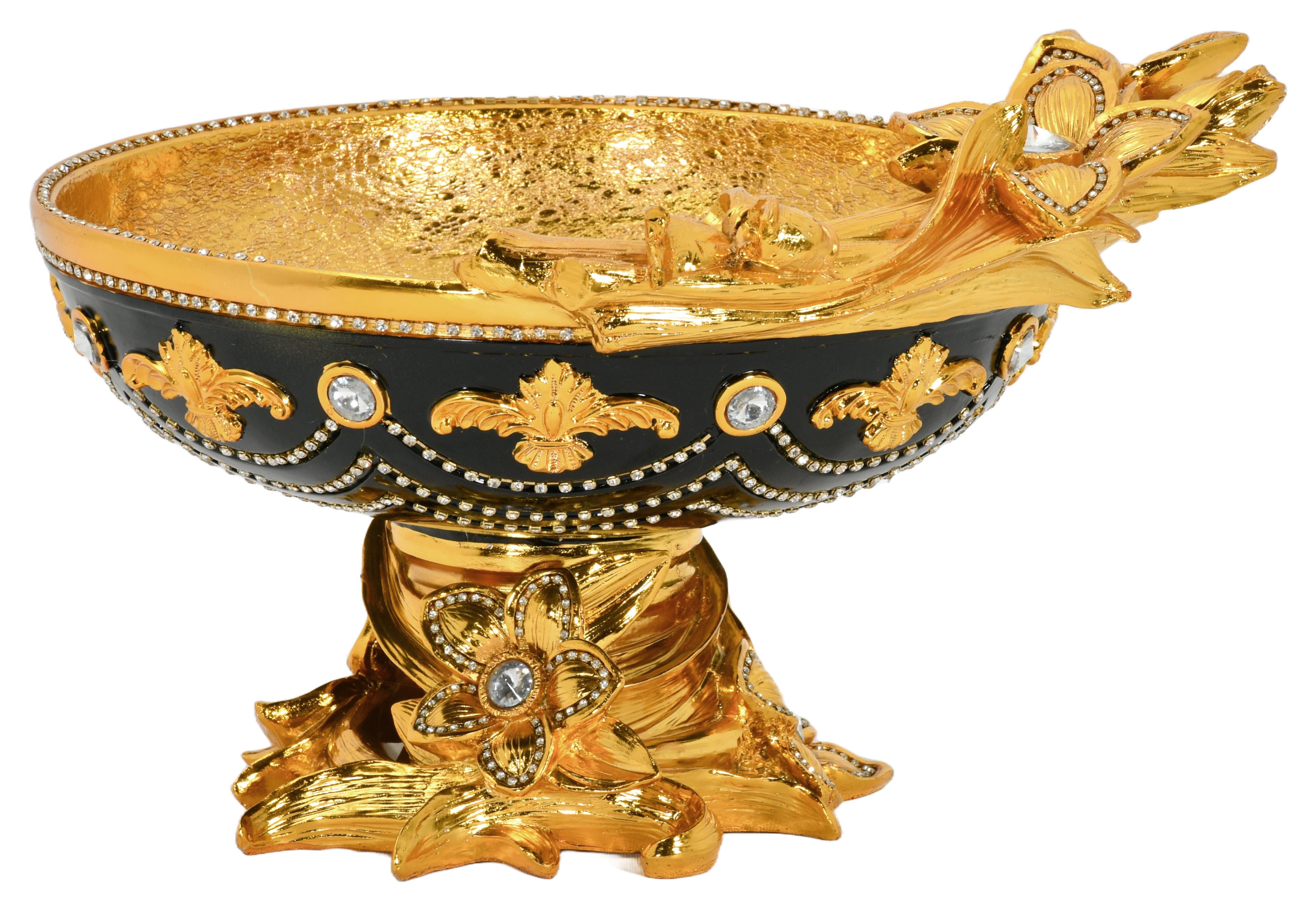 Discover the European Elegance Czar Azalea Centerpiece Bowl, an exquisite masterpiece adorned with sculpted azaleas. Rhinestone crystals in a swag design add a touch of sparkle to the bowl, while fleur de lis accents enhance the field of the bowl. Embrace the allure of European elegance with this stunning centerpiece that effortlessly exudes sophistication and beauty. Elevate your decor with the opulence of this timeless showpiece, perfect for adding a touch of grandeur to any room.