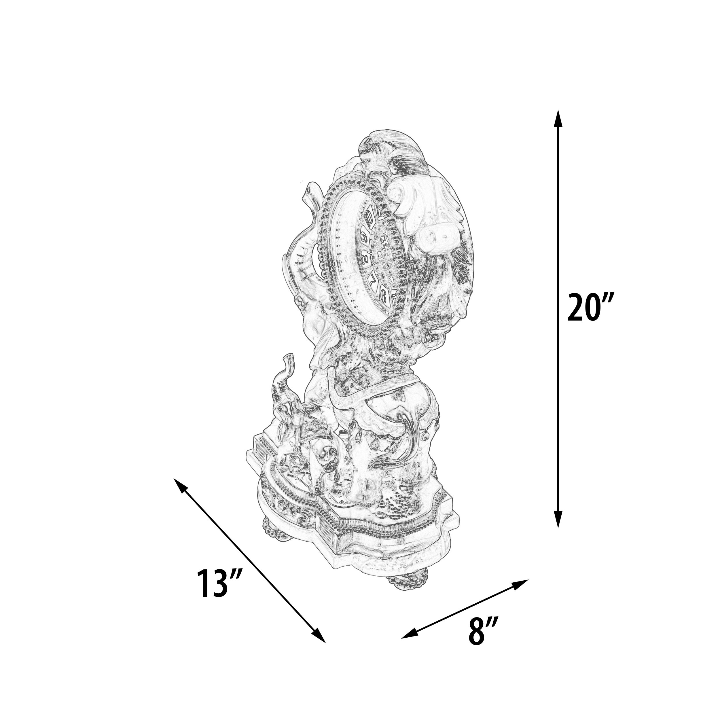 The European Elegance Elephant Mantle Clock stands at a height of 20 inches. Finished in elegant gold with French White accents, this functional and charming timepiece exudes sophistication, making it a perfect addition to any mantle. Delicate emerald rhinestone crystals adorn the Howdah, adding a touch of elegance and sparkle to the design. Elevate your decor with the allure of European elegance and let this exquisite Elephant Mantle Clock become a cherished focal point, gracefully captivating your home or office.