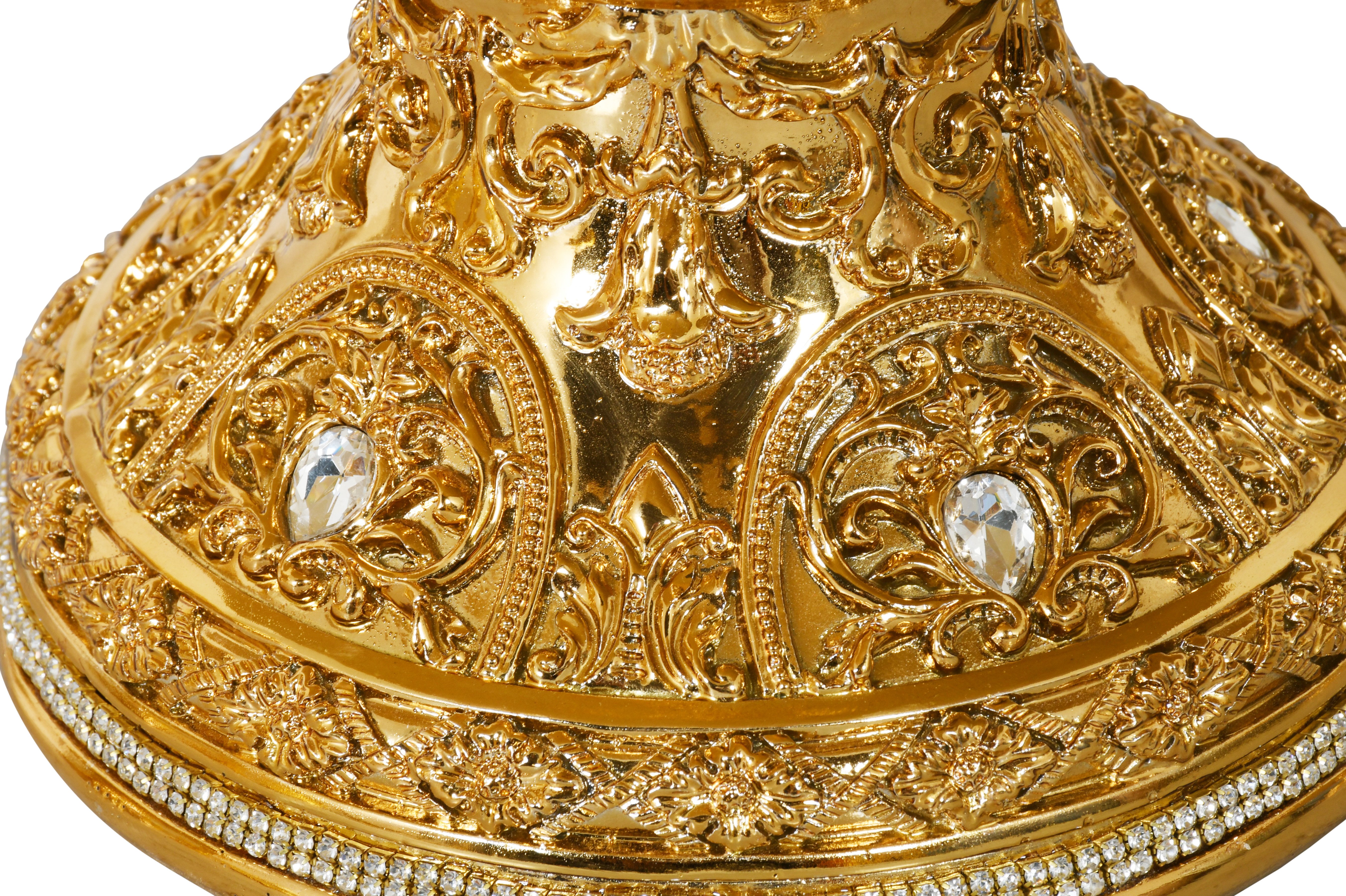 The European Elegance Grand Palatial Pedestal Bowl is a truly stunning masterpiece finished in beautiful gold, radiating a brilliant shine. Its exquisite detail is evident throughout, with rhinestone crystal trim accentuating the base, bowl field, and inside. The entire piece features sculpted floral scrolled detail, adding an elegant touch to its grand design. Elevate your decor with the allure of European elegance, and let this remarkable pedestal bowl become a captivating centerpiece that adds a touch of opulence and sophistication to any room. Perfect for displaying or showcasing your treasured items in a luxurious and artistic manner.
