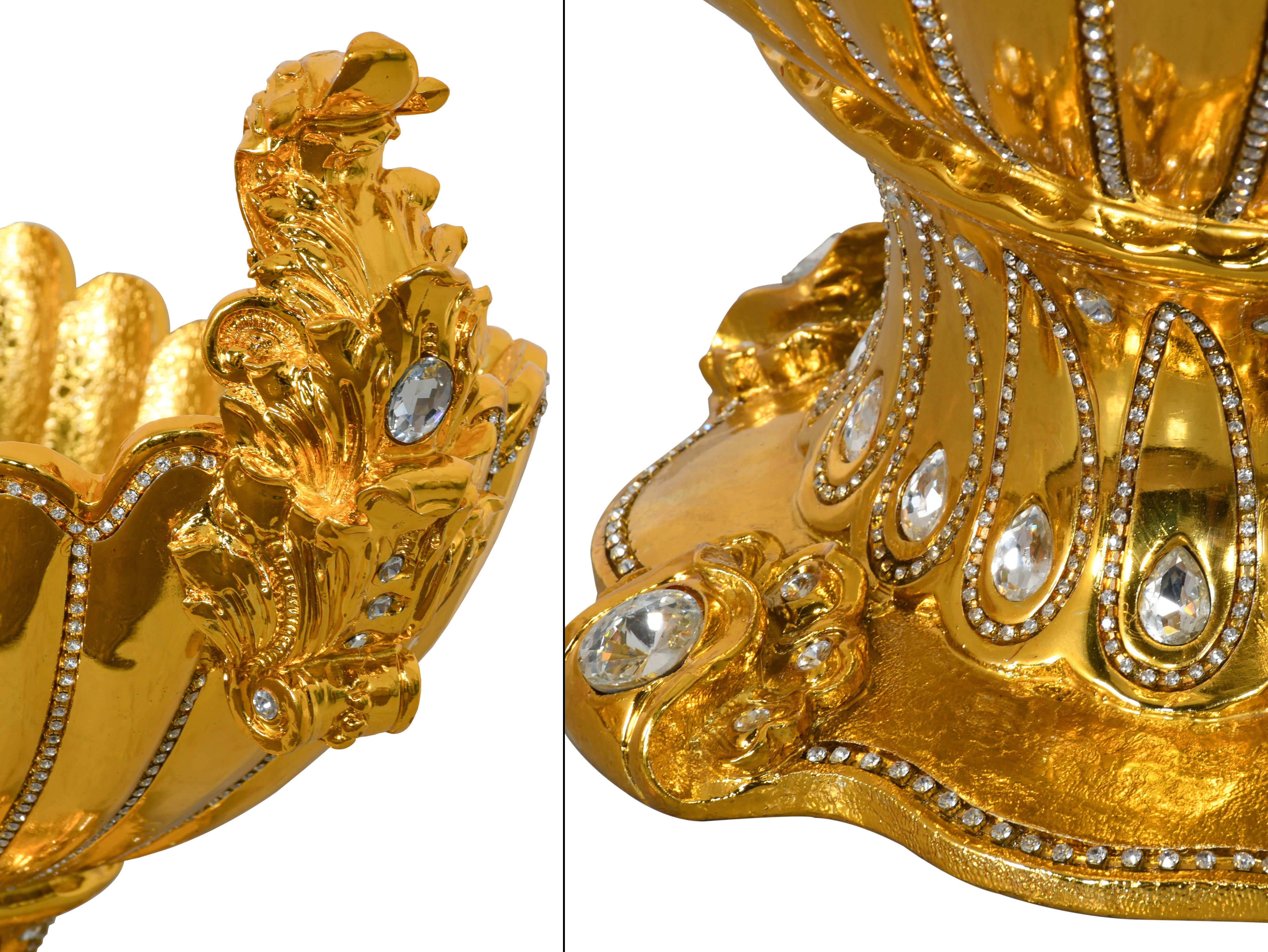 The European Elegance Grand Golden Centerpiece Bowl is a powerful and unique piece that exudes opulence. Its shiny gold color and rhinestone crystal accent the festoon shaped bowl making it a standout centerpiece. This longer and narrower bowl is perfect for a dining table or console, adding a touch of grandeur to any setting. Embrace the allure of European elegance with this striking bowl that commands attention with its grand scale and big look. Elevate your decor with this impressive and versatile centerpiece, perfect for showcasing faux flowers or standing tall as a captivating statement piece on its own.