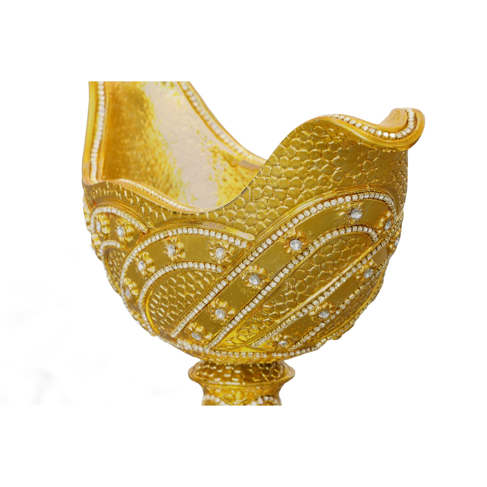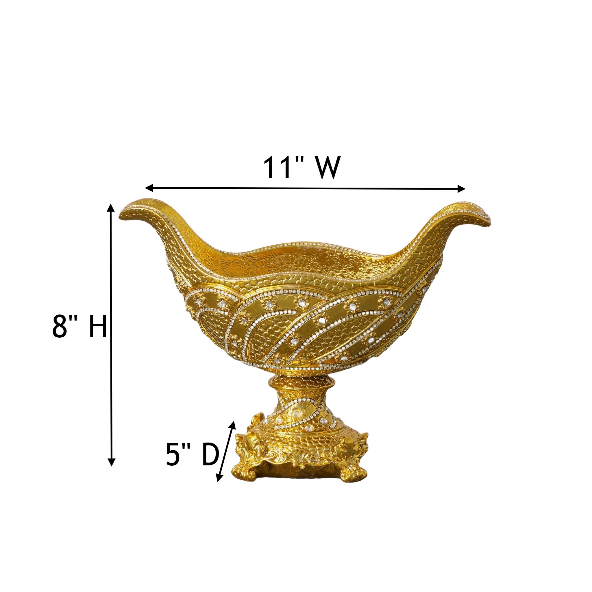 The European Elegance Small Centerpiece Bowl is a stunning piece dripping with opulence. Its golden finishing and dimpled textured surface add an elegant touch. Adorned with rhinestone crystals, this bowl exudes sophistication and glamour. Elevate your decor with the allure of European elegance and let this exquisite centerpiece bowl become a captivating focal point that adds a touch of luxury and grandeur to any room. Perfect for showcasing your refined taste and creating a striking statement with its impressive design.