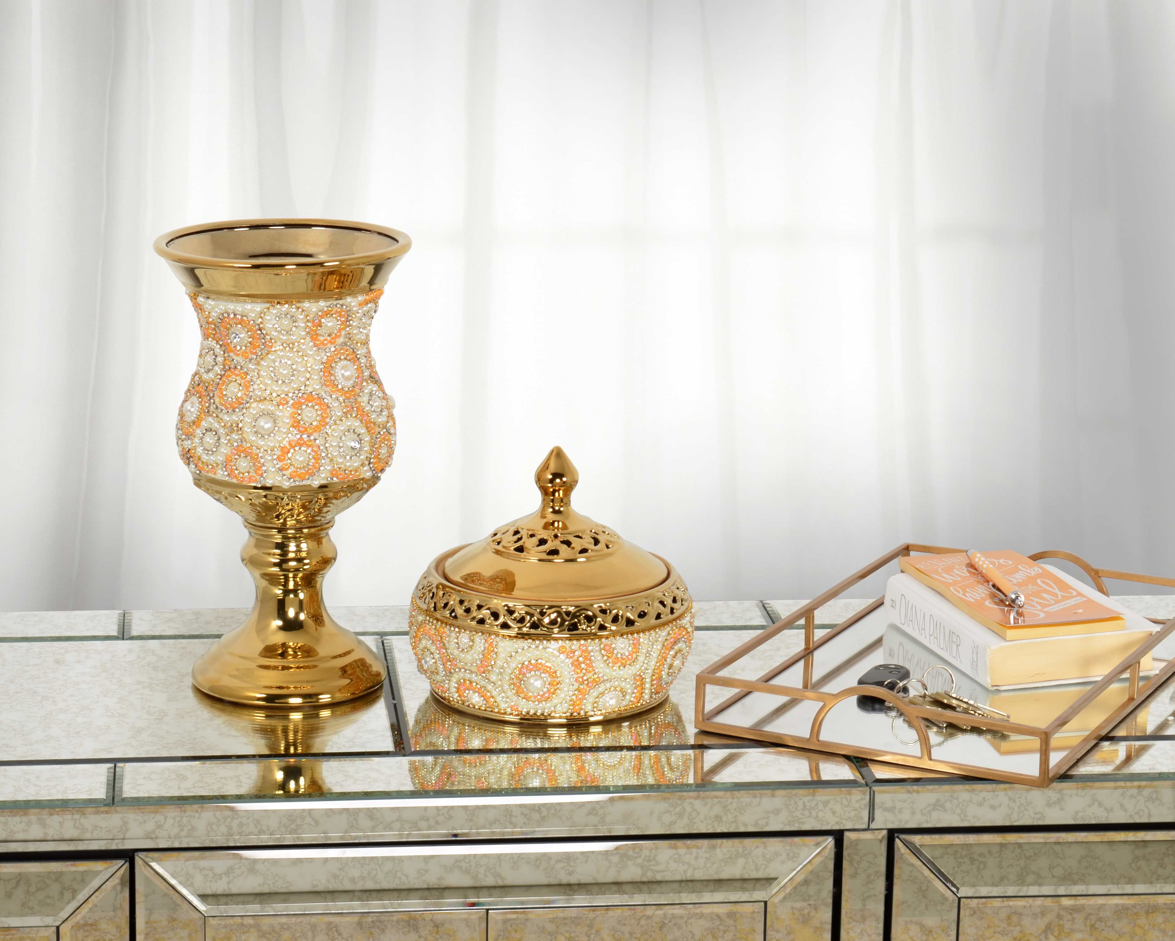 The Radiant Pearl Box with removable lid for keepsake or jewelry storage 8.25 inch diameter. An attractive holding solution for a ladies desk, dresser, or vanity. Hand cast in Porcelain. The finish is a strikingly beautiful gold plating then further enhanced with a circular pattern of intermittent rings of faux pearls in hues of white and peach tones. The contrast and design create a radiant effect on this unique hand crafted functional decor item. Makes a great gift, consider combining this item with the matching Radiant Pearl Vases.