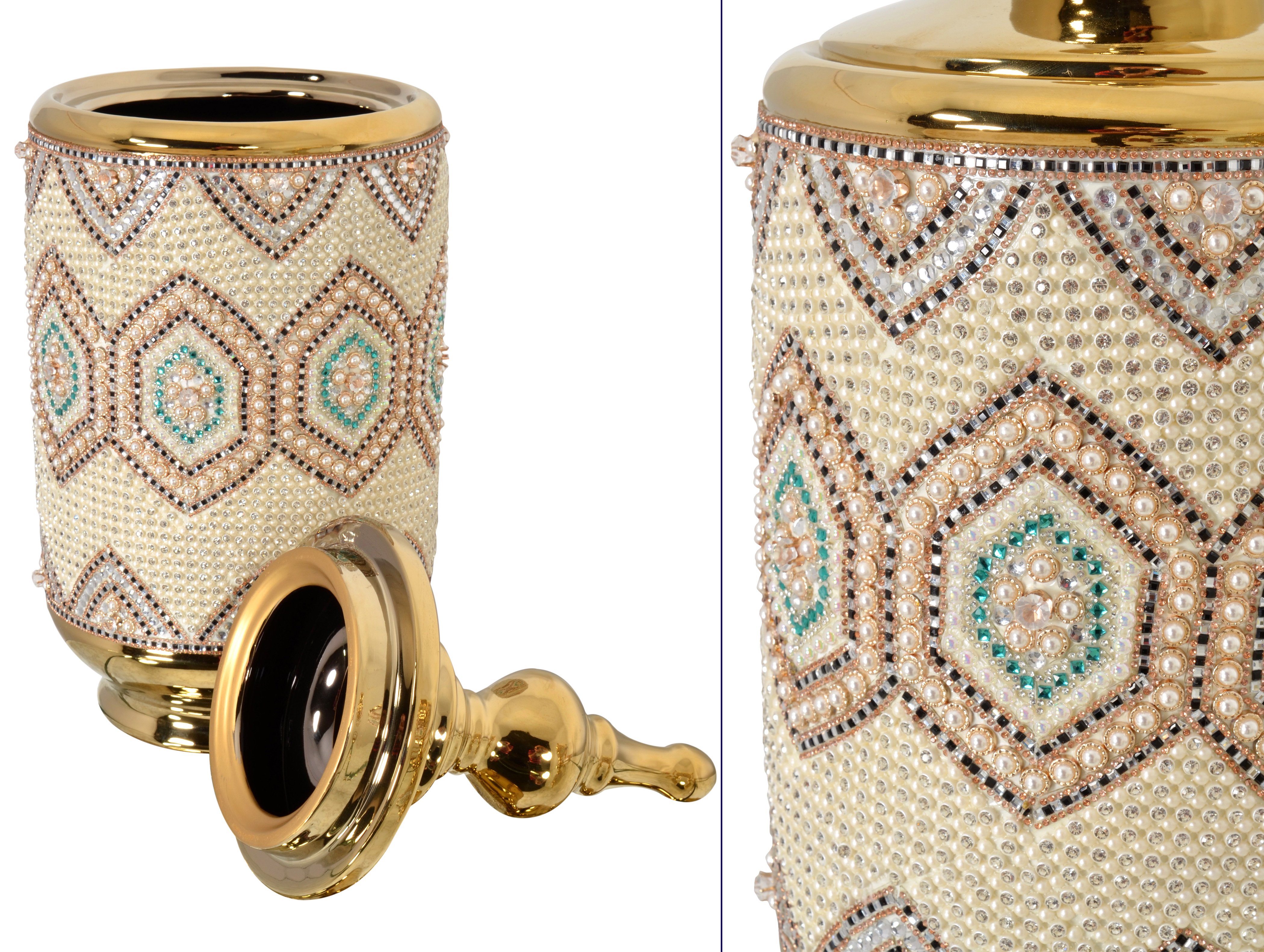 A Moroccan Palatial Cannister with Removable Lid standing 22.8 Inches Tall. A contemporary designed standing Object of Art that also offers versatile uses. The item is crowned with a removable lid that allows this item to be used for storage or to be removed for enhancing as a flower arrangement. The color combination is rich looking. It is a fresh and pleasing combination offering a modern vibe to traditional elements of design. Hand Cast in porcelain with Gold Plating. The canister is adorned with thousands of hand applied Rhinestone crystals and faux pearls arranged in striking colors of ivory, blue, clear, further contrasted by black accents and a striking gold base. Sold separately but often ordered in pairs for balance. Combine with other beautiful items from the new Moroccan Series for a larger collection. No Assembly Required.