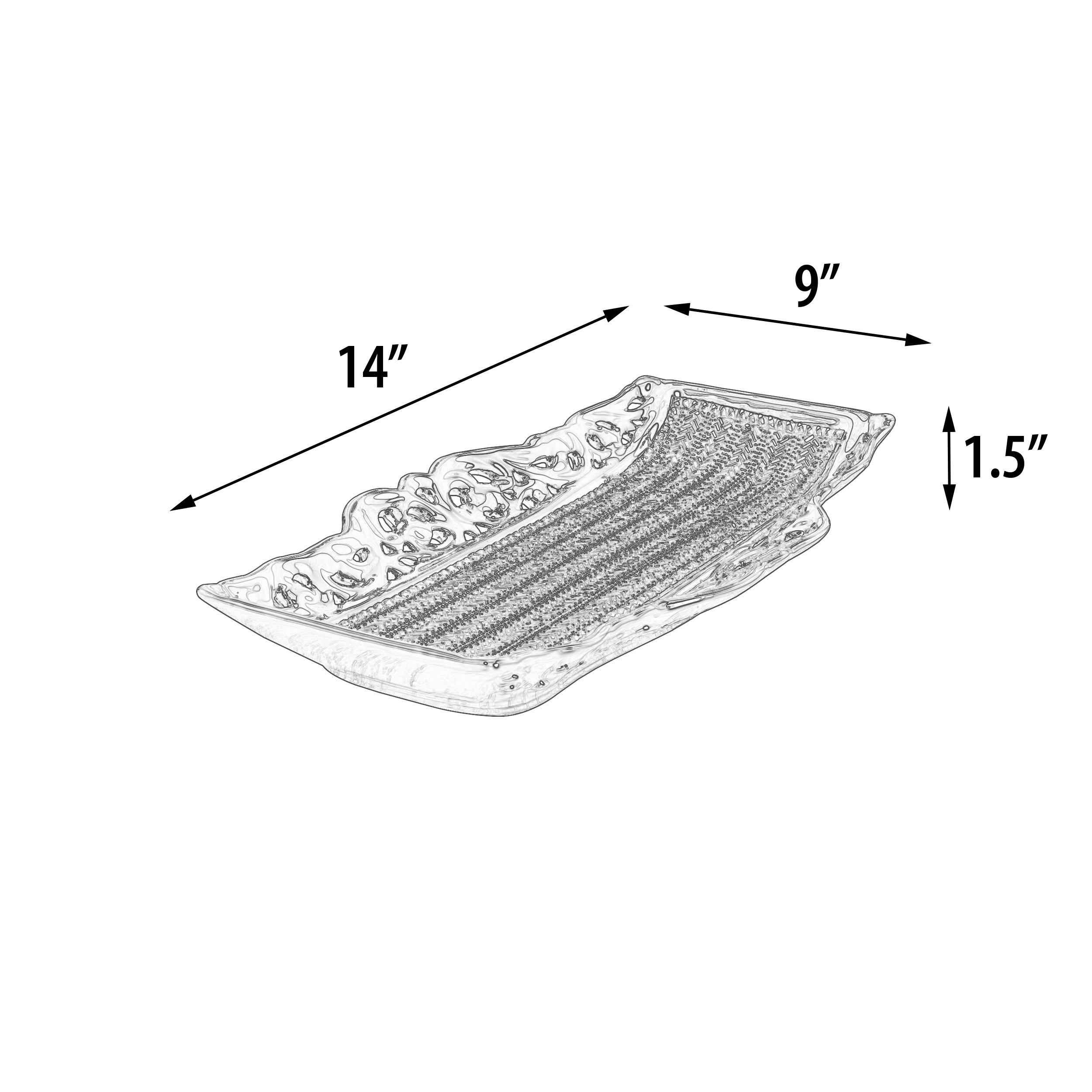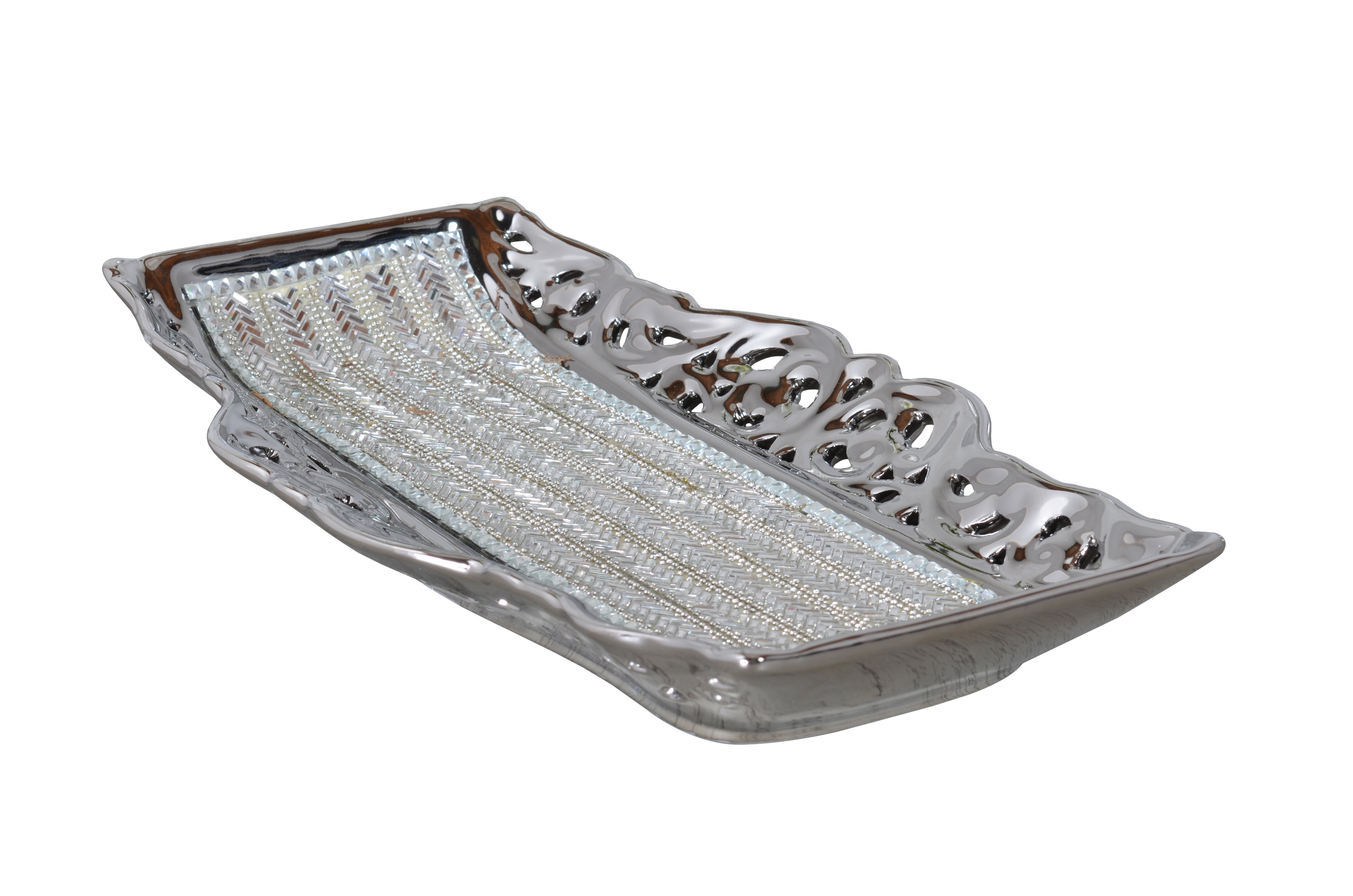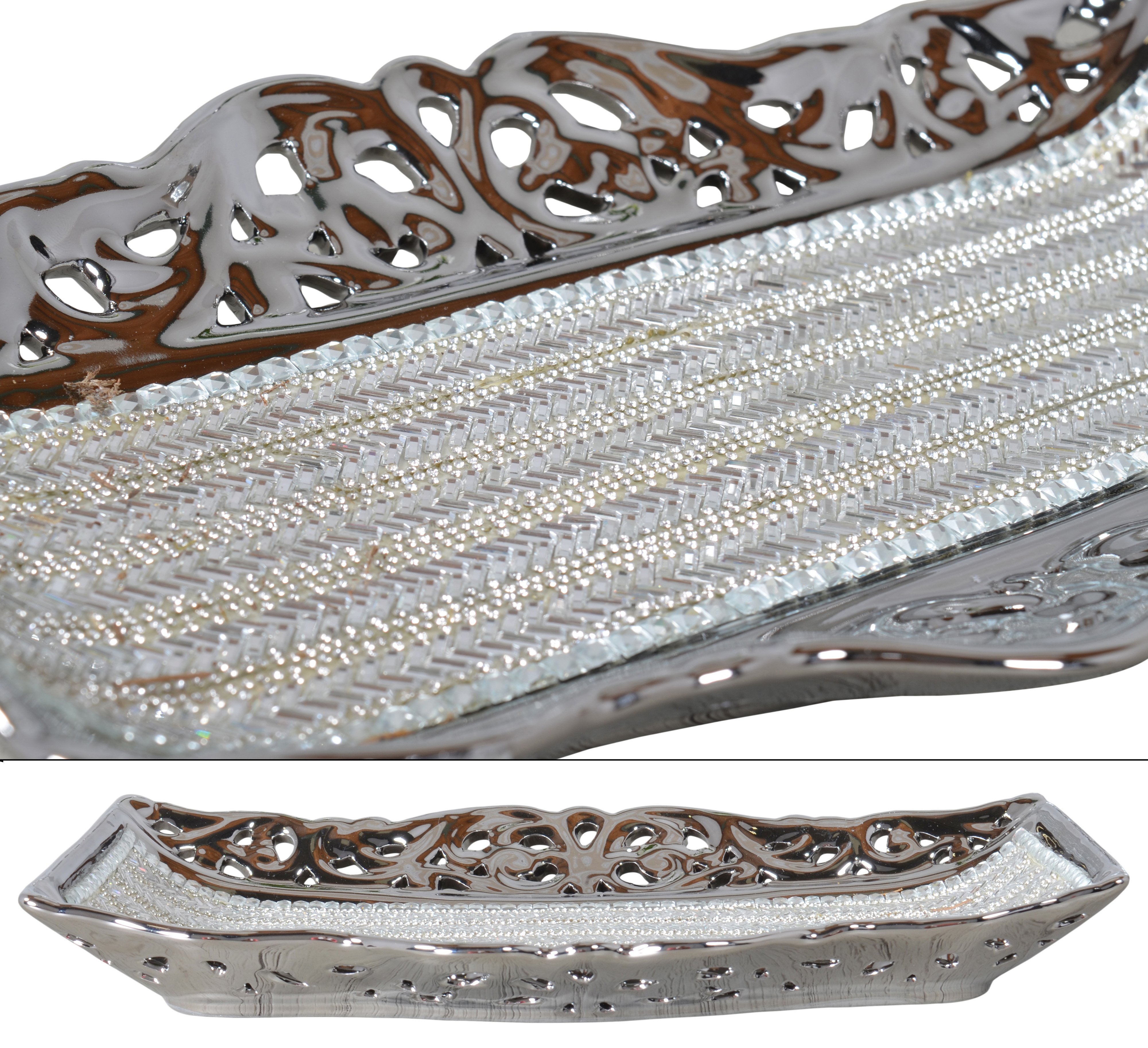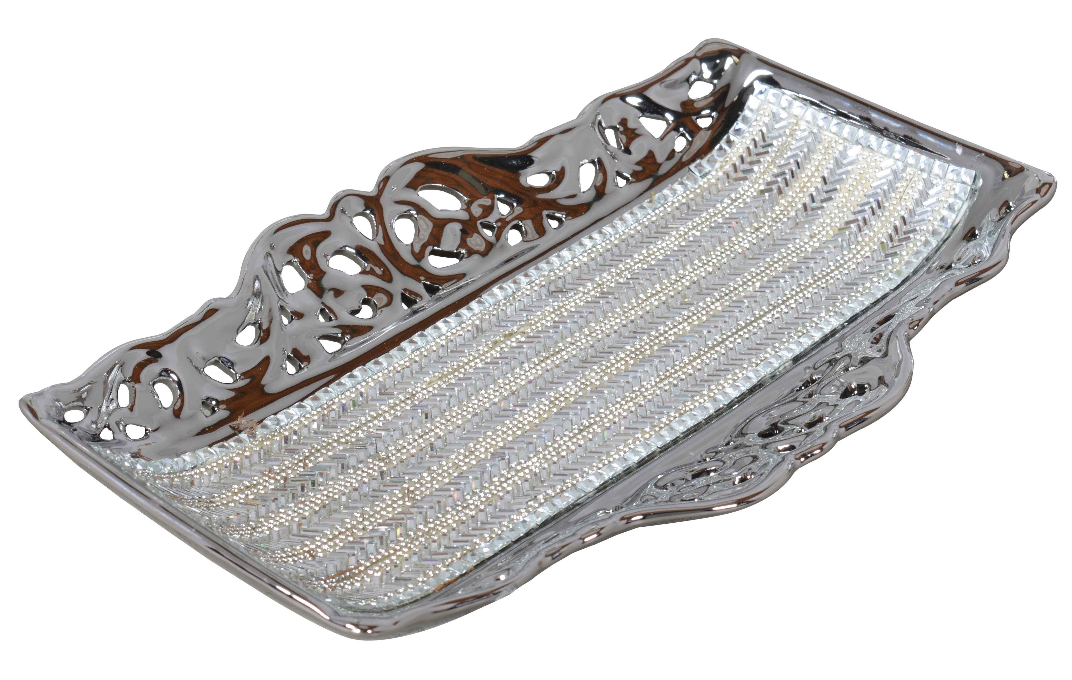 A 13.75 inches wide Princess Vanity Tray from our Princess Crystal series the collection embodies todays trending tones of silver and offers sparkling Glam with is an abundance of crystals for a dressing table, dresser, desk wherever a little sparkle and organization may be desired. This item is cast in porcelain with a plated silver body and features hundreds of individually applied clear Rhinestone jewels in an attractive zipper cut pattern intermittently spaced row by row over the exposed surface. Consider mixing it up with other Princess Series items for a larger display affect. No Assembly required. Makes a great Gift.