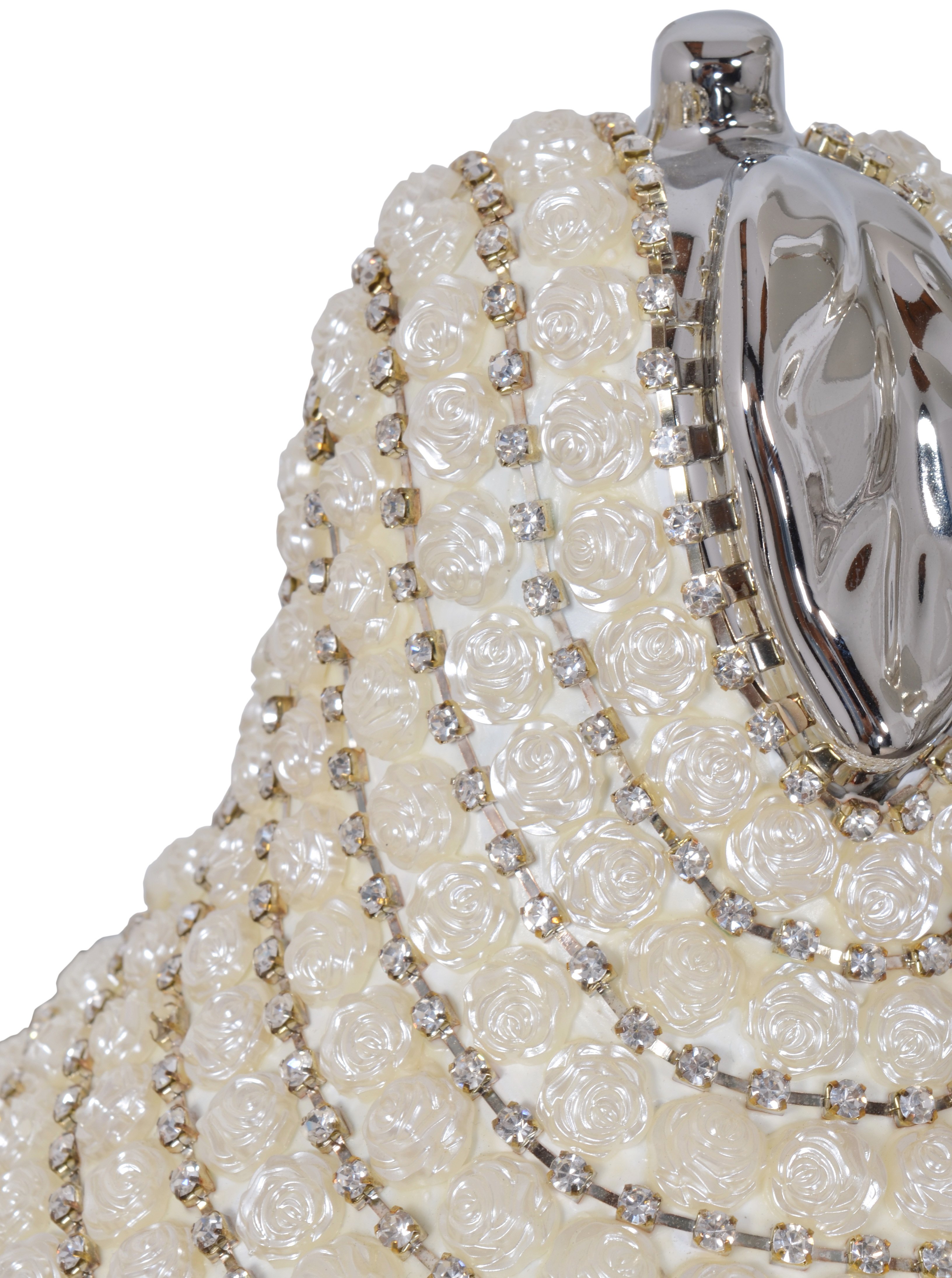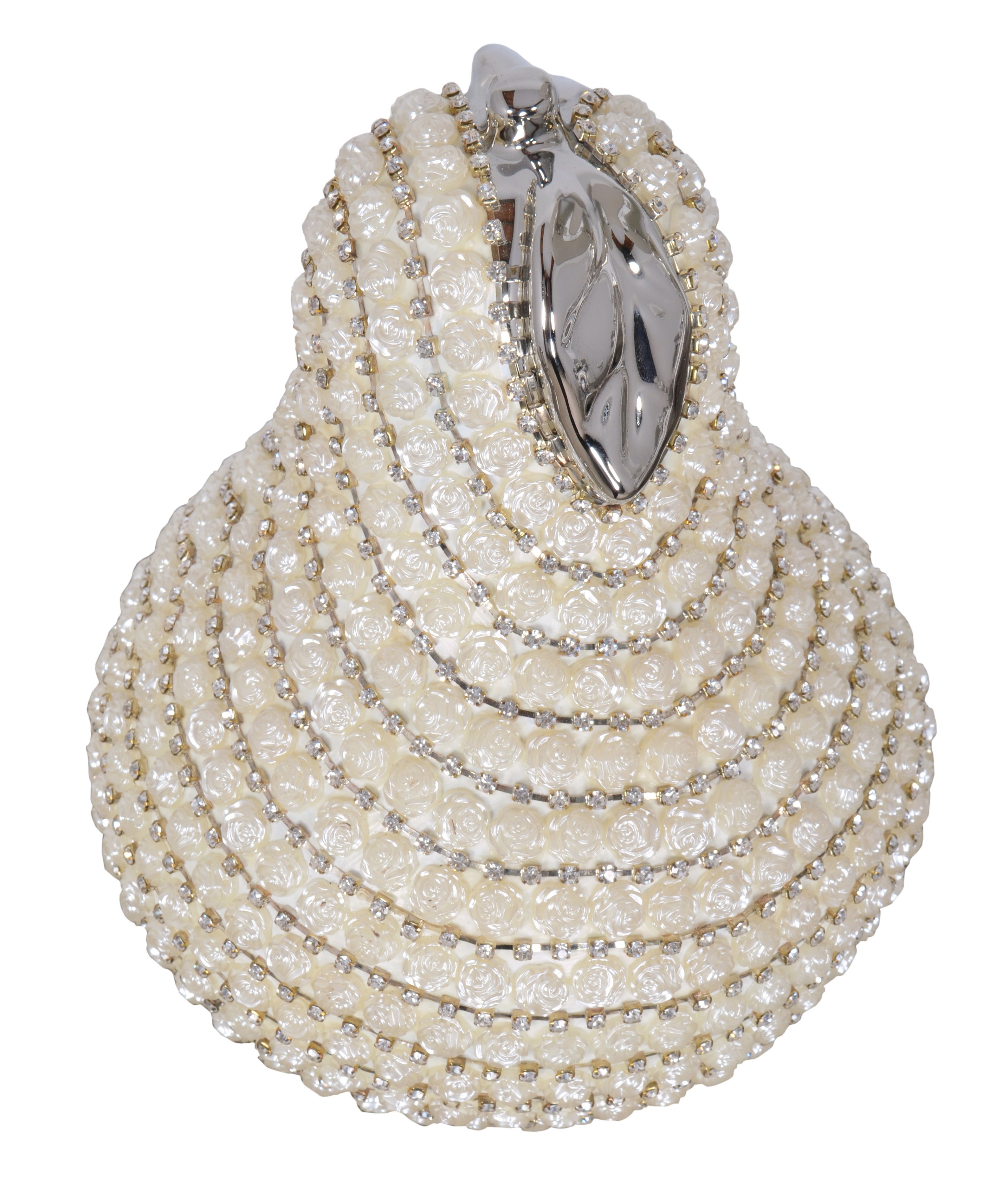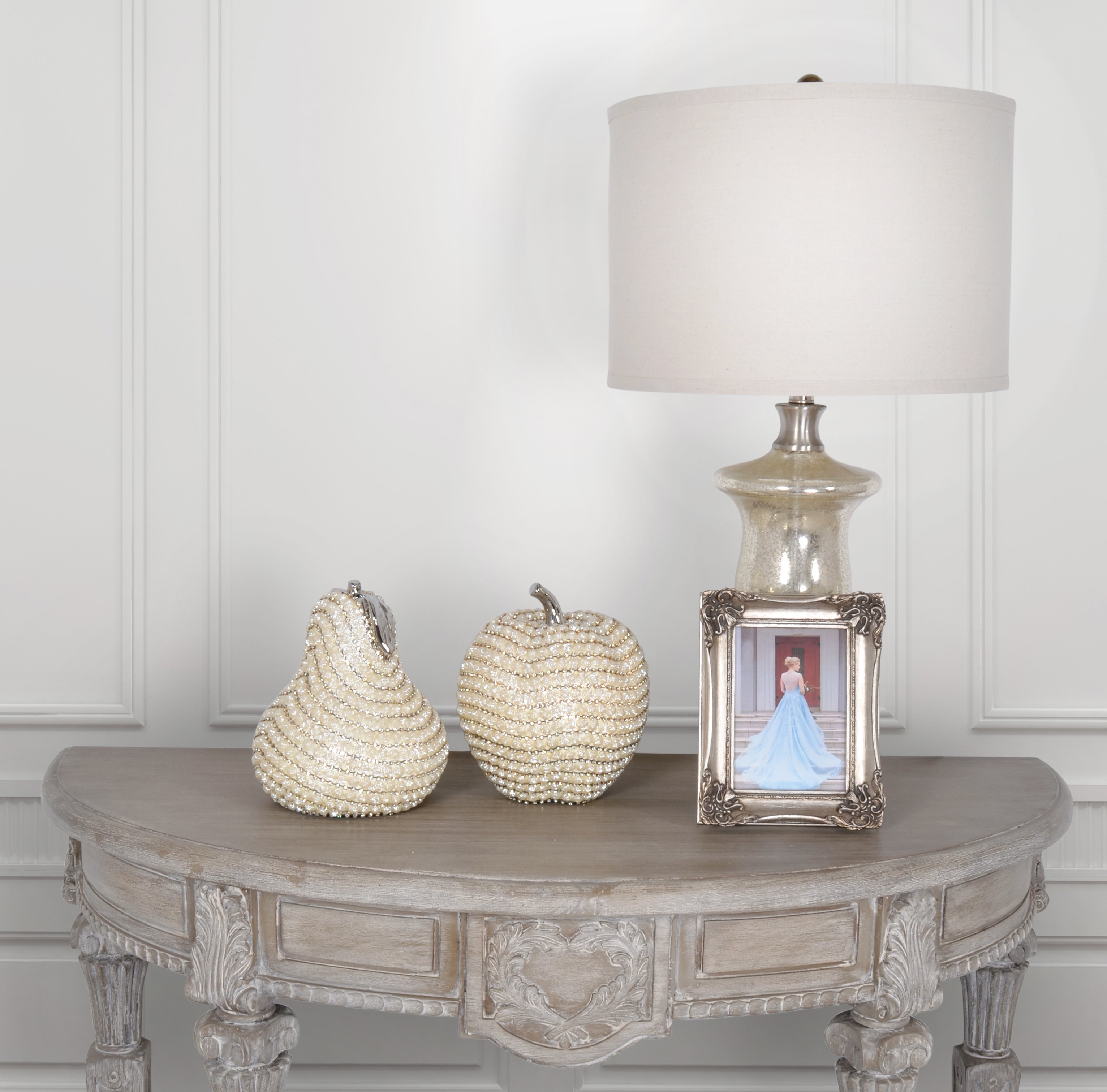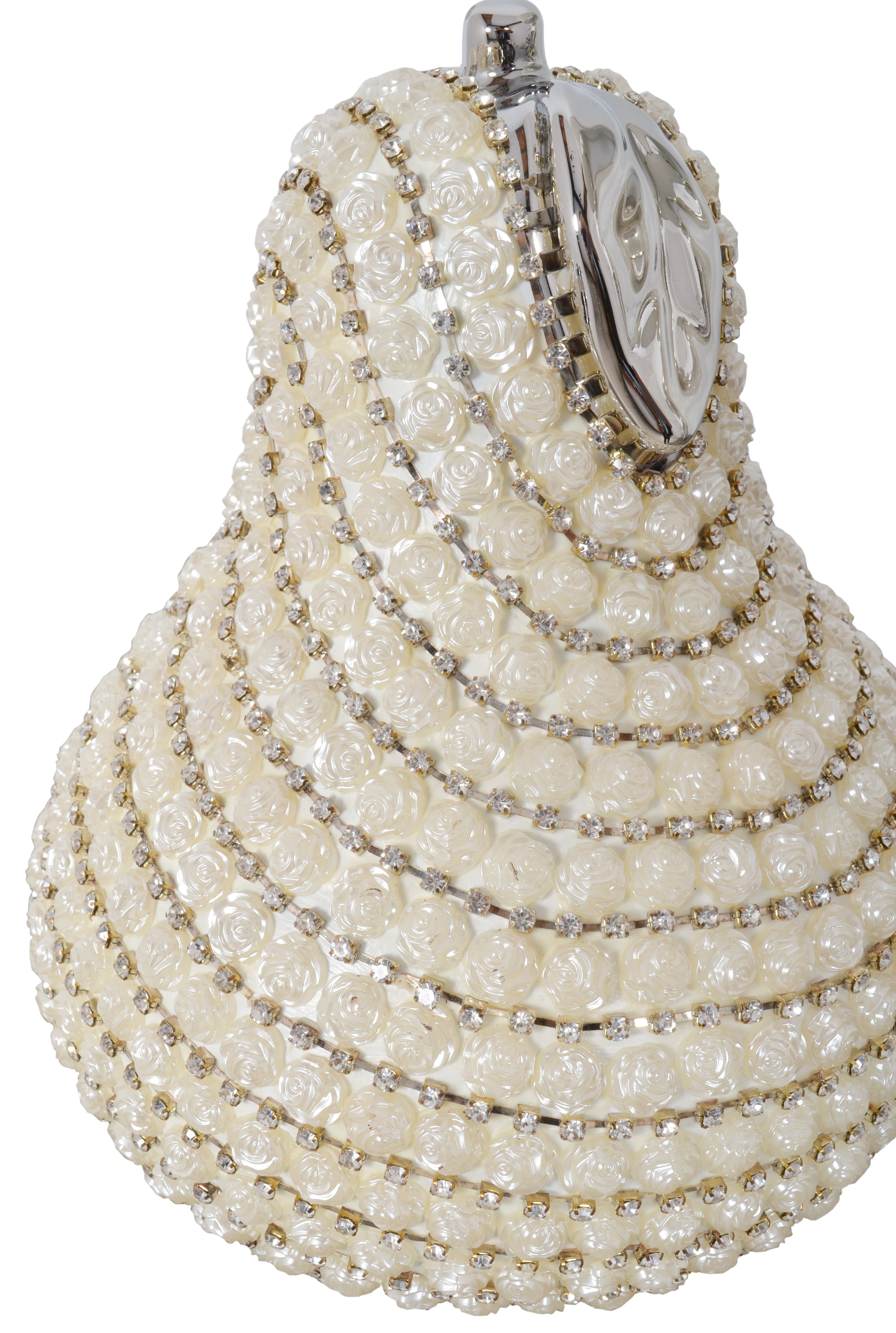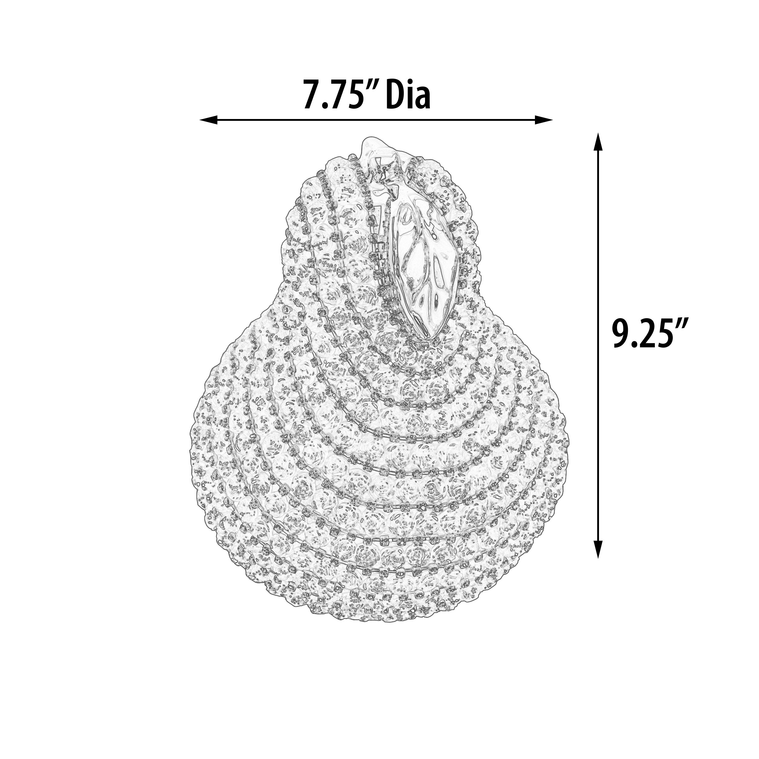 An unusually adorned 9.5 inches tall decorative Crystal Pearl Pear. This larger then life Pear is hand cast in ceramic with silver plated accents. It features hundreds of individually hand applied elements of opaque and clear rhinestones. The contrast and design create a very stunning effect on this hand crafted decor item. Sold separately but often purchased with the Crystal Pearl Apple CS-CQ7238-9-CA-from the same collection for a group affect.