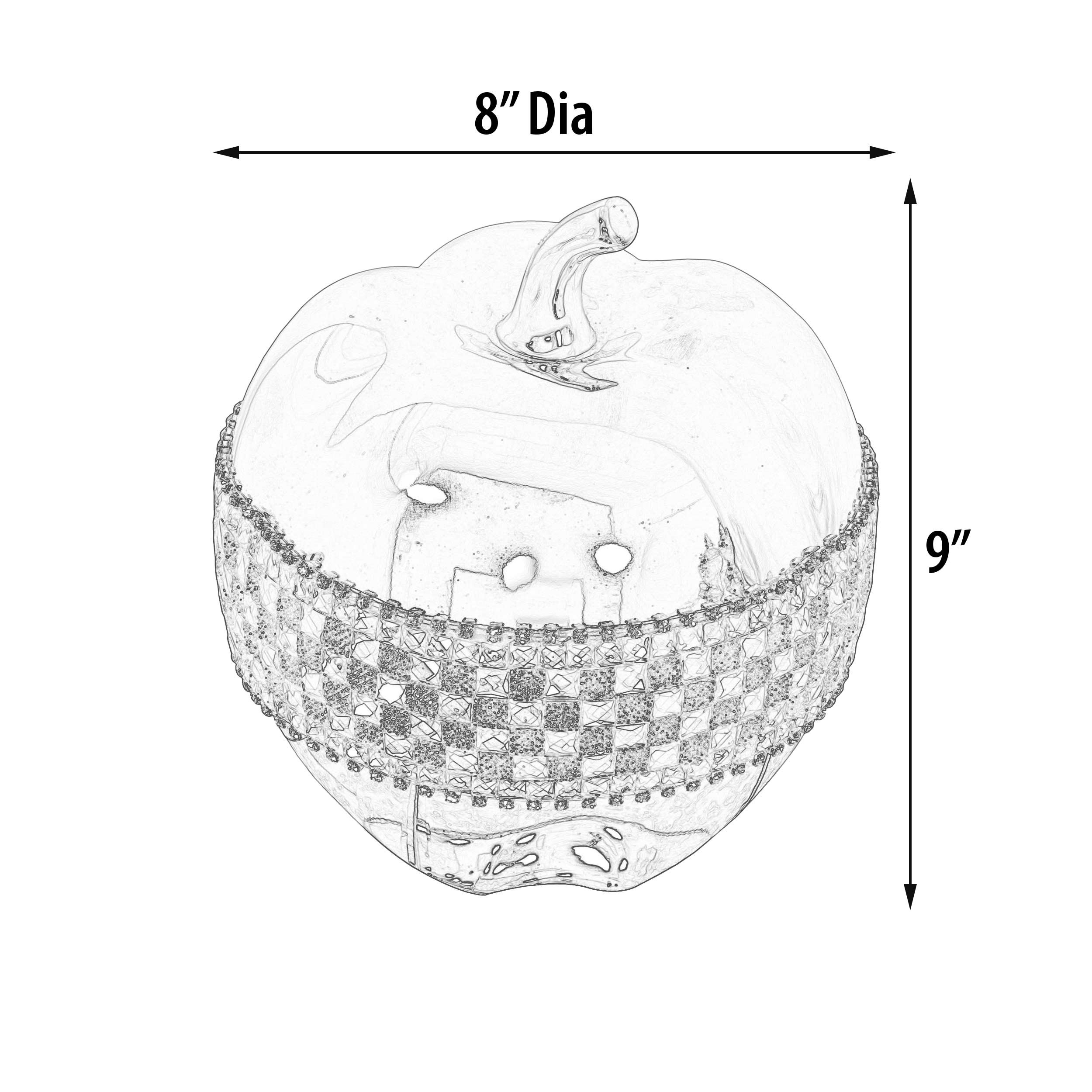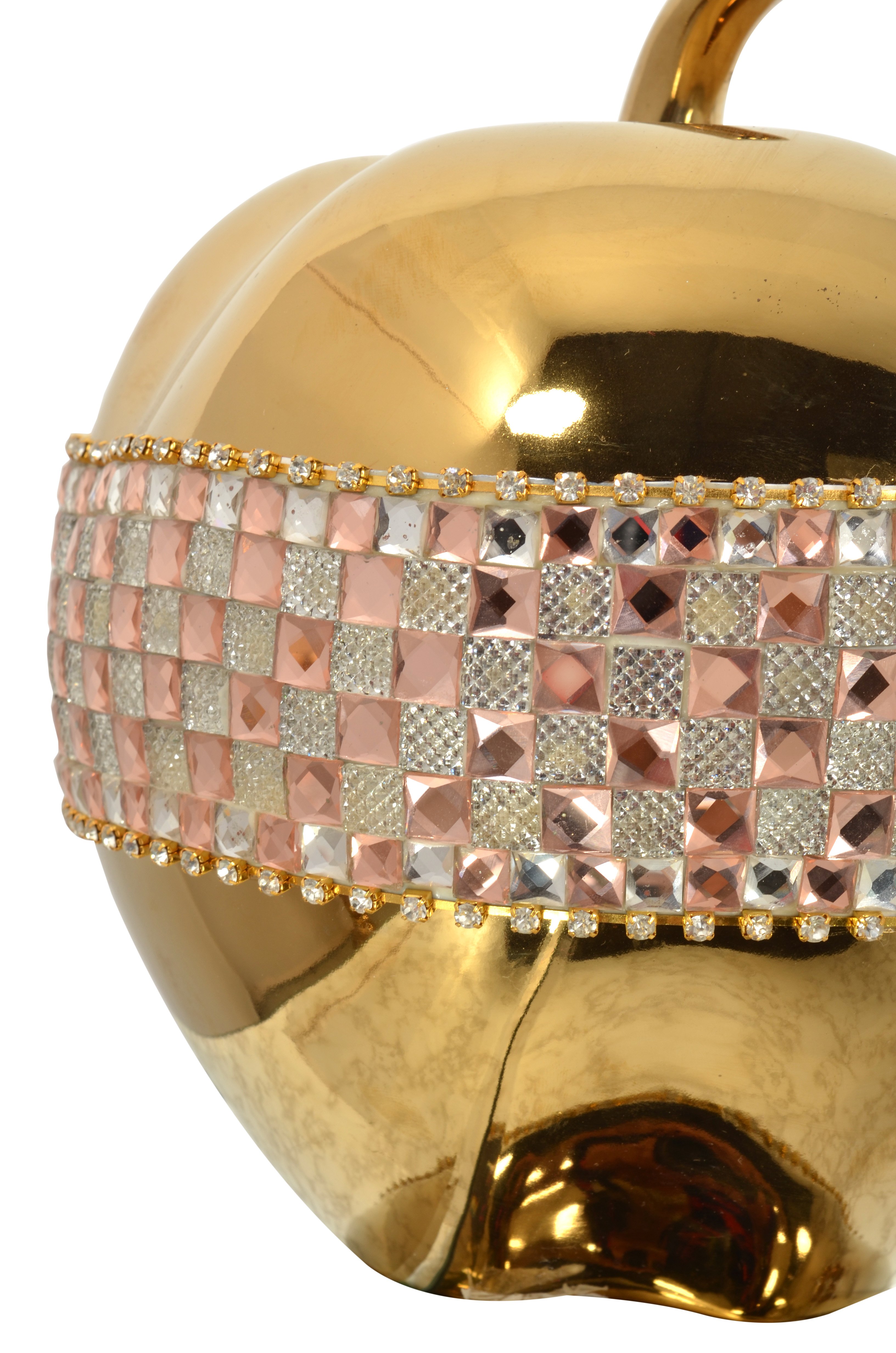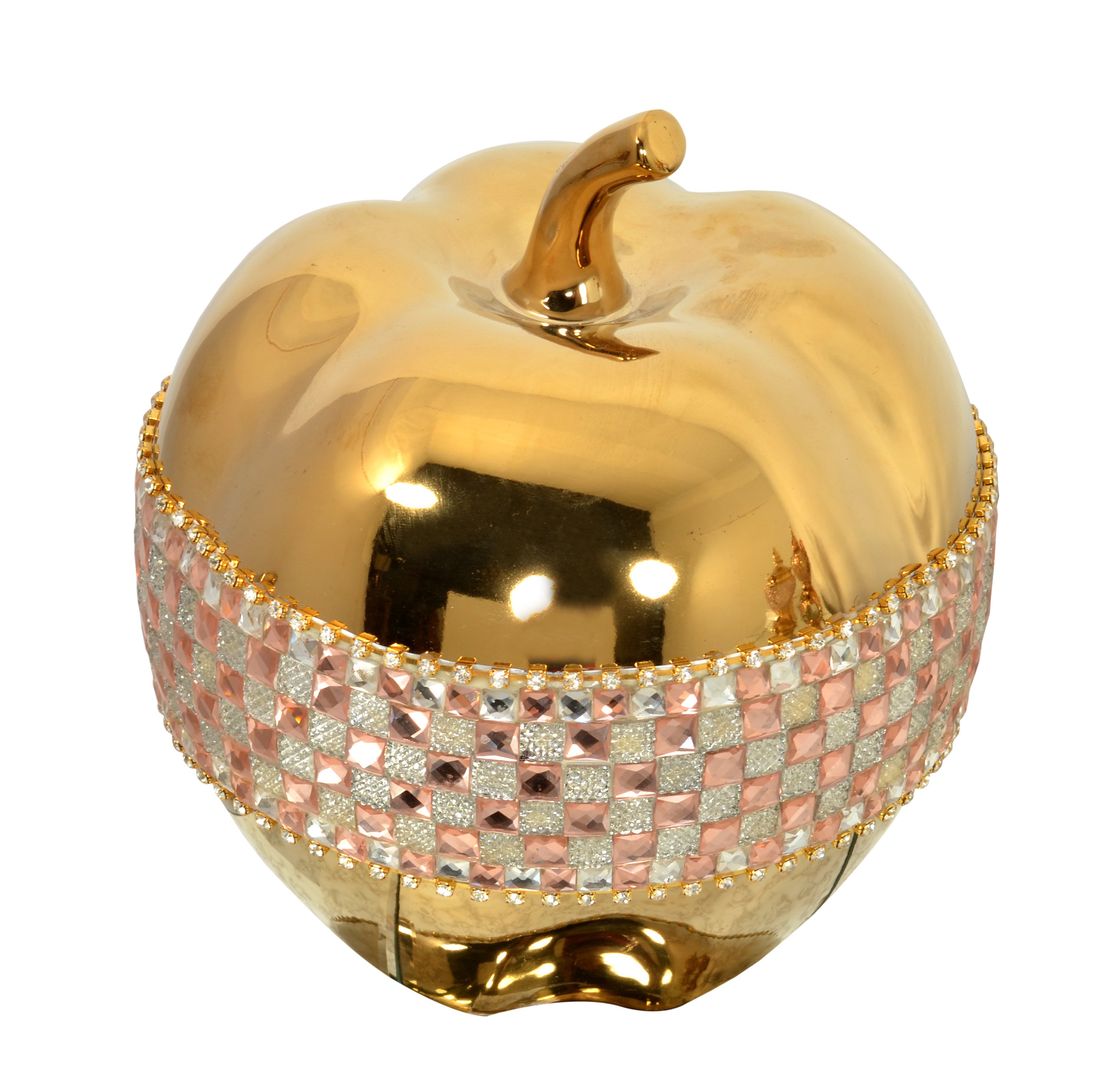 The Rose Crystal and Gold Apple is a very nice decorative object of art. The larger then life apple is hand cast in porcelain with a striking gold plated body and accents. Featuring a band of hundreds of individually hand applied elements of rose and clear rhinestones. The contrast and design create a very striking effect on this popular creation. Consider combining other beautiful items from the Rose Crystal and Gold Series for a variety of larger Decor Applications.