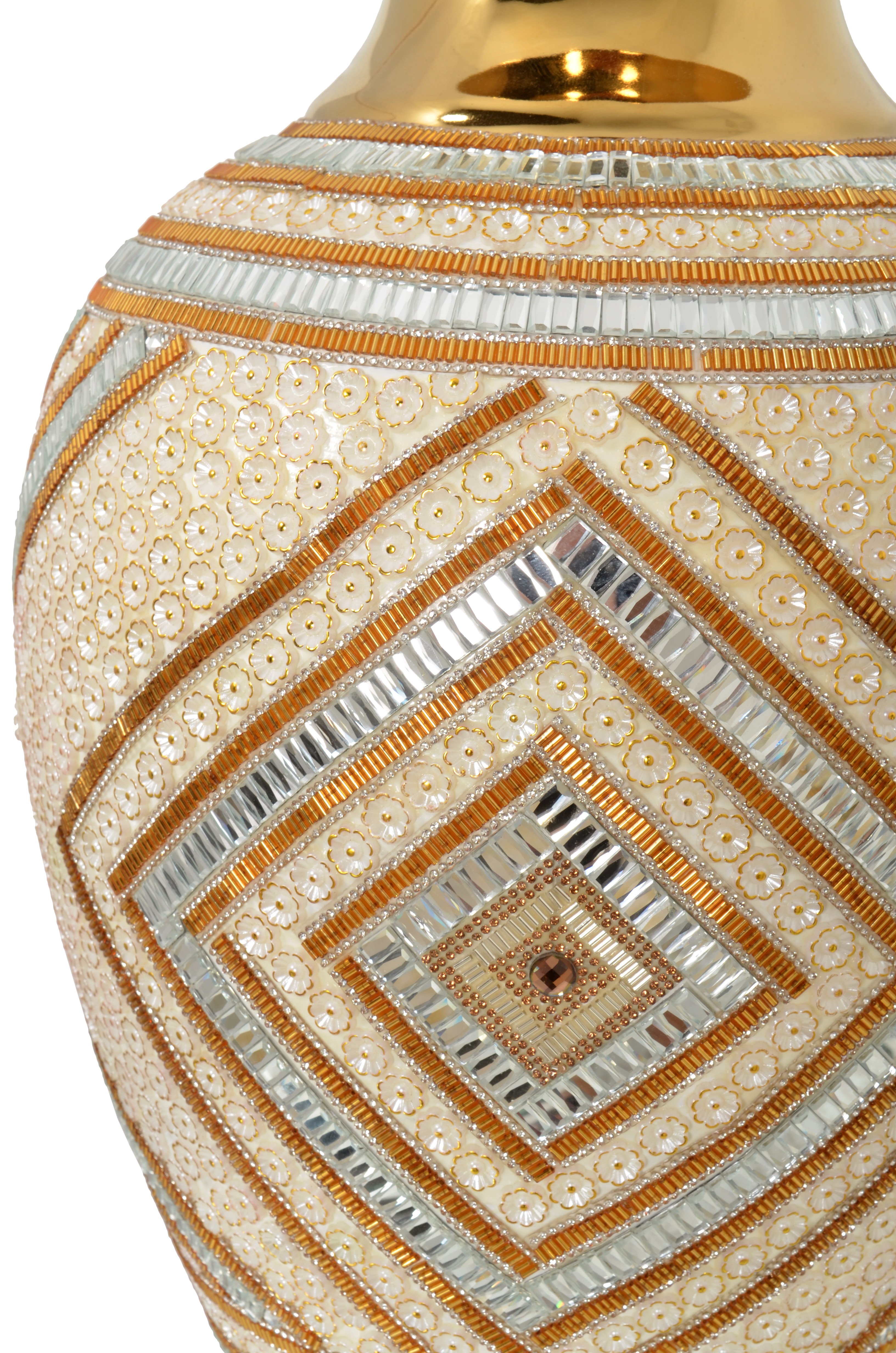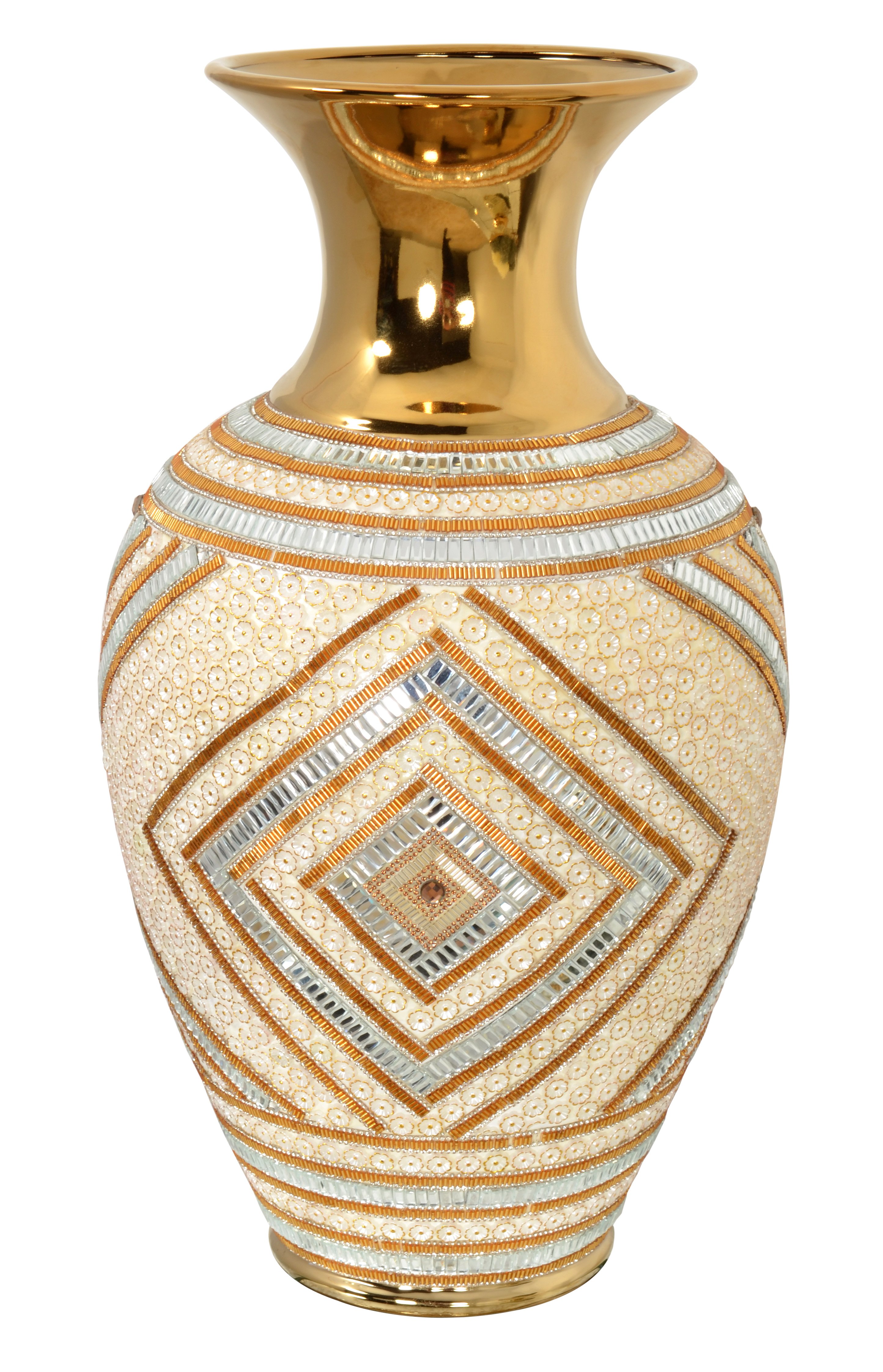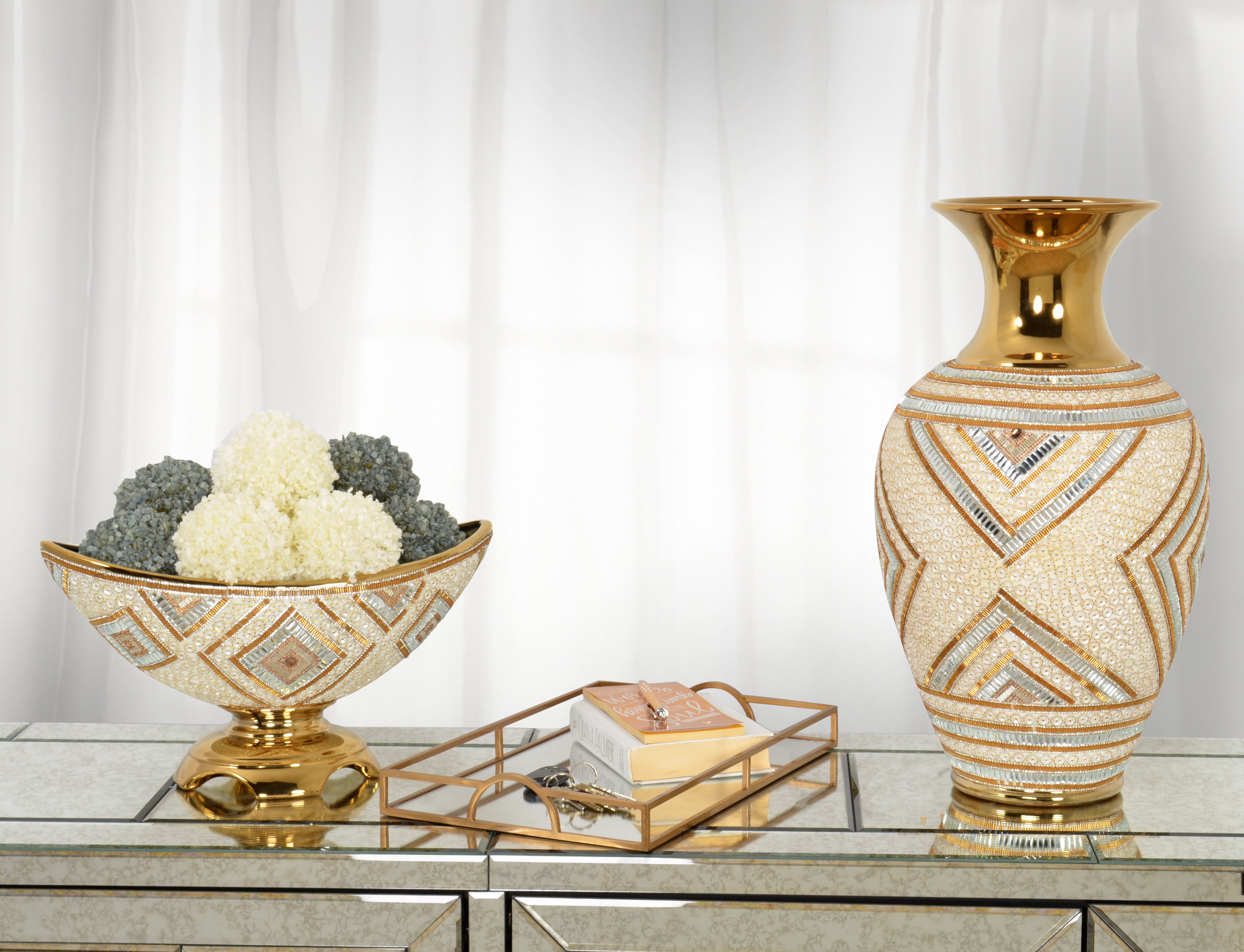 The Golden Reflections Vase offers an impressive scale with its 11.5 inch diameter and 20 inch height. A very attractive design that adds a special level of opulence to a fine interior setting is Hand Cast in Porcelain. Features a stunning gold plated body with a beautiful pattern and mixture of shapes and colors of thousands of hand applied rhinestones in White, Silver, and Gold. This Vase offers the beauty to be a stand alone object of Art or enhanced with flowers or Fruits. Sold separately but often ordered in Pairs for Balance and Symmetry. Also, consider combining with the Golden Reflections Center Bowl 16.5 Inches Wide. No Assembly Required.