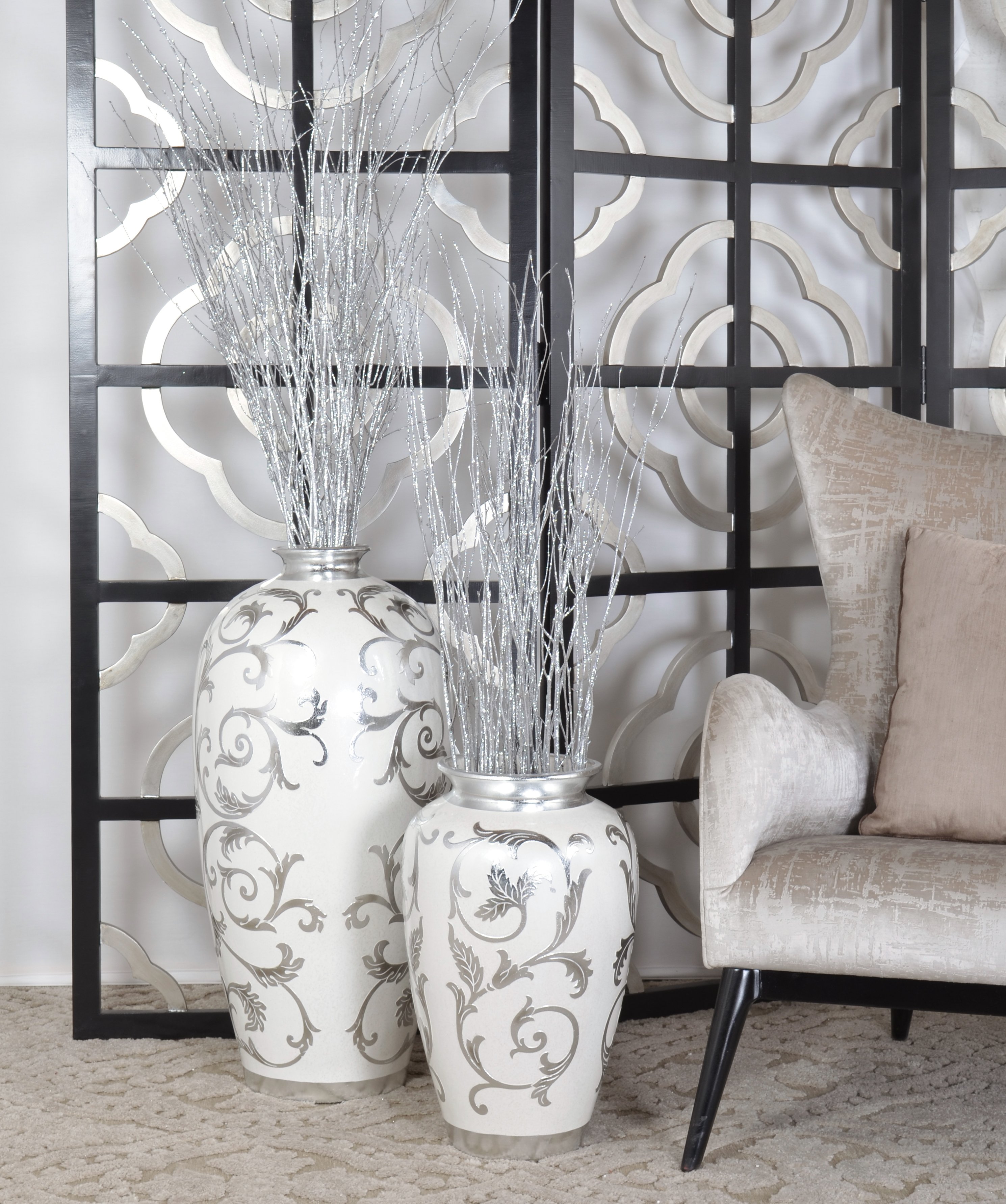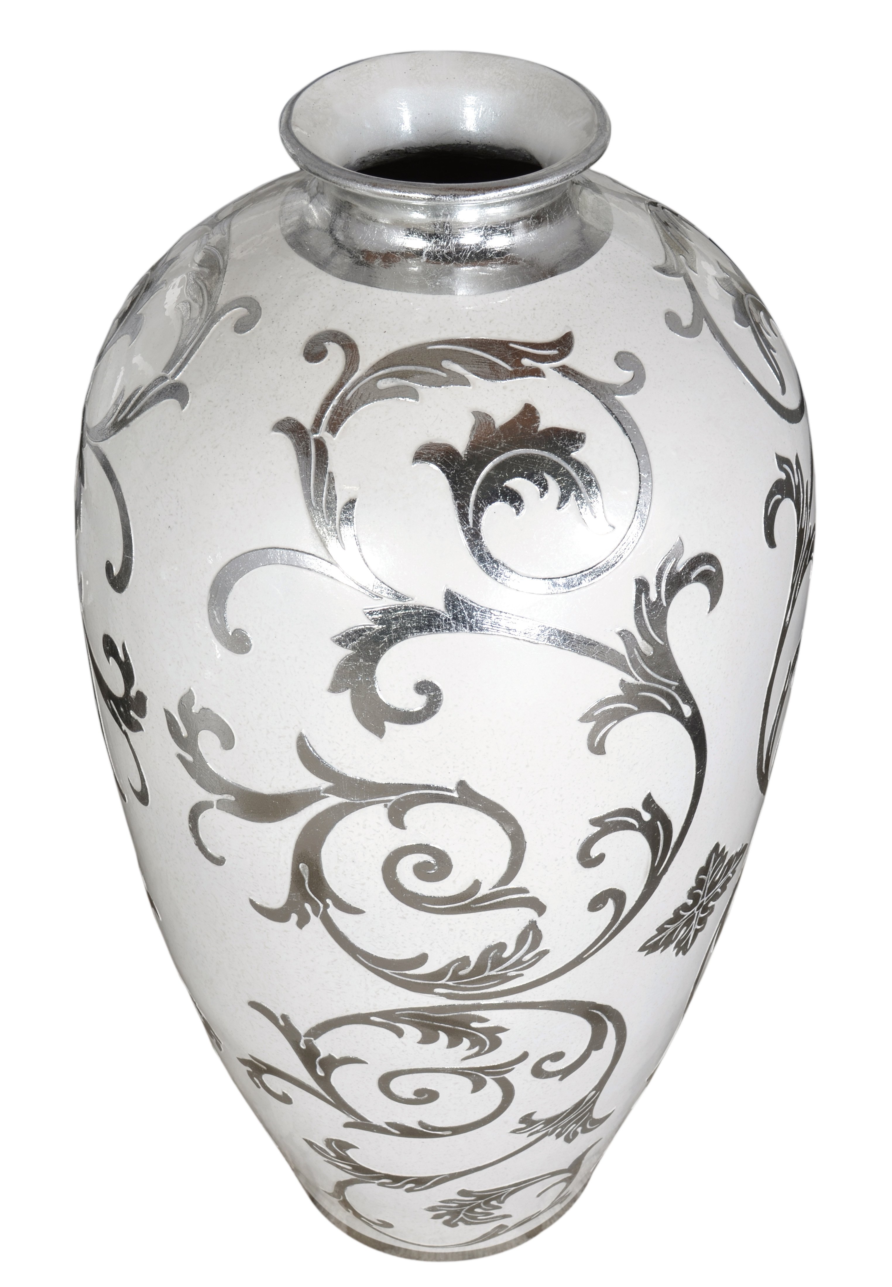 The Sophie Silver Antique White Large Vase 31.9 Inches Tall. A good selection for many interior designs. The Largest vase from the popular Silver Sophie Collection. It can be used as a floor vase with reeds or enhanced with flowers. It is hand Cast in a durable polyresin. The design features classic scrolls and leaves. The finish is wonderfully hand finished with silver metal leaf against a softly antiqued white base tone. Consider ordering a pair for balance.