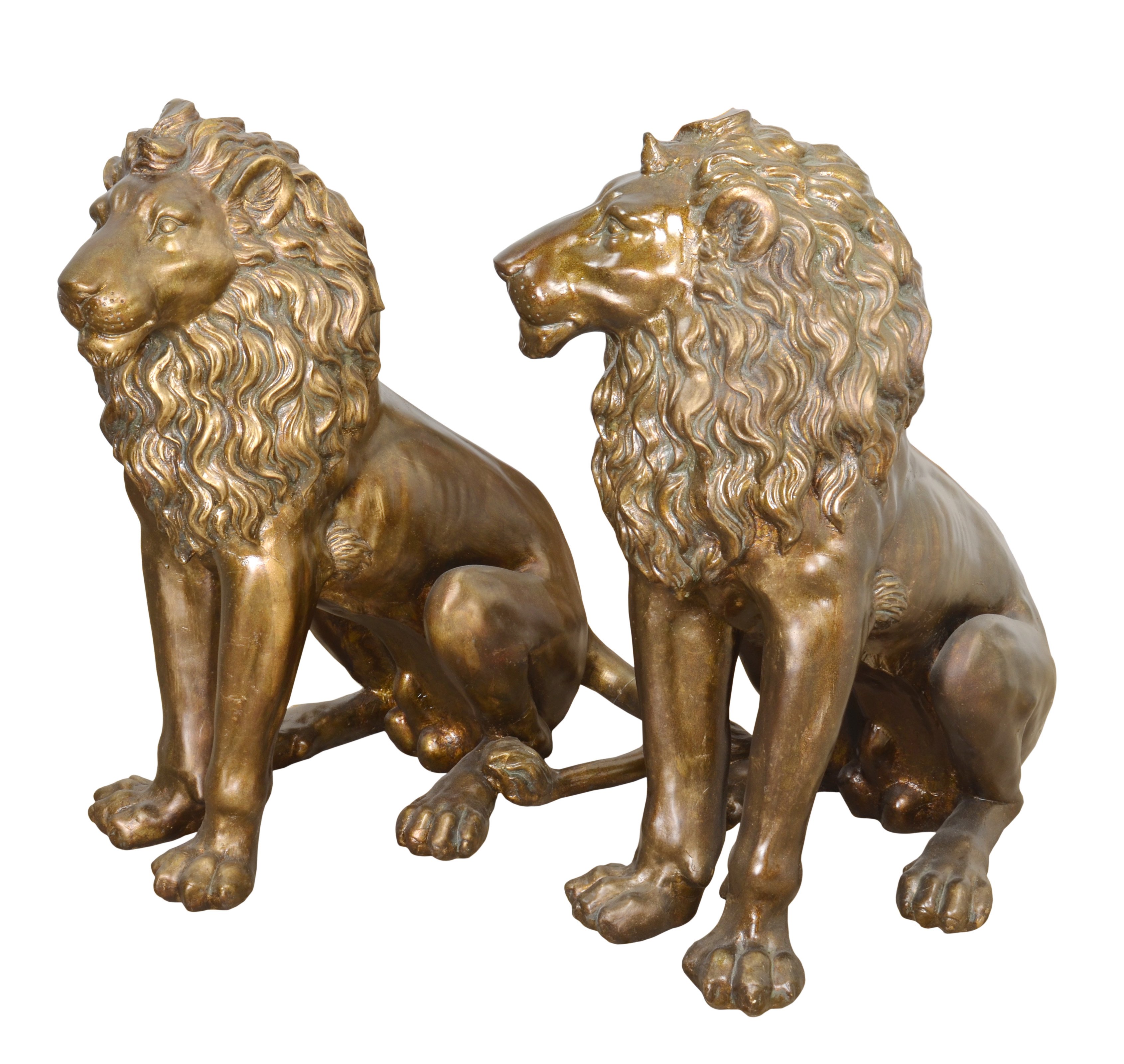 A 33 Inch Tall Burnished Sitting Lion Set of 2. Hand finished in an antiqued burnished finish with hand waxing that brings out highlights from the details of the sculpture. The pair is hand cast in a durable Fiberglass Resin. This set is recommended for interior use because of its finer finish. However, the casting will hold up in outdoor use. We do recommend that for outside long lasting use, the customer should provide lacquer top coat on an as needed basis depending on conditions.