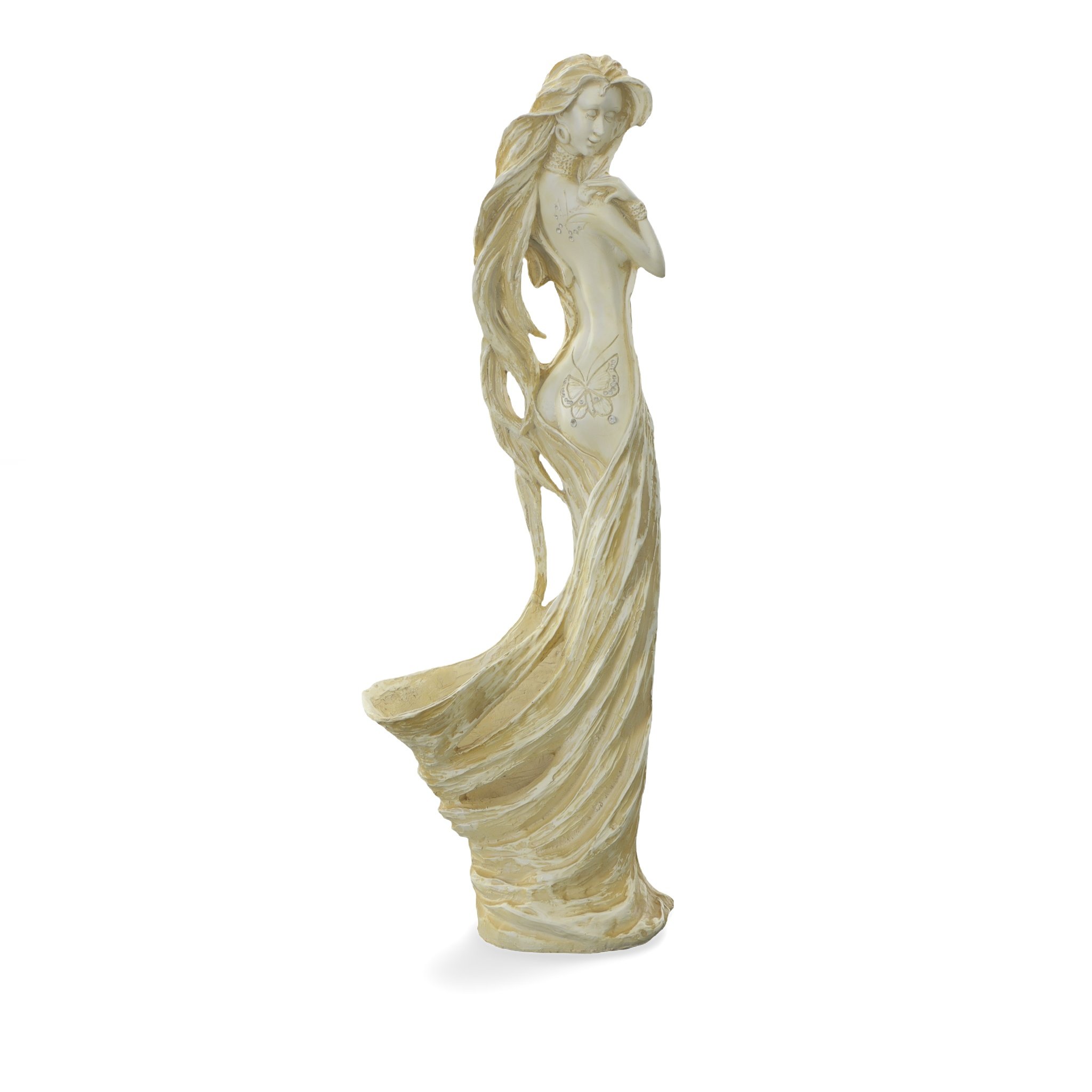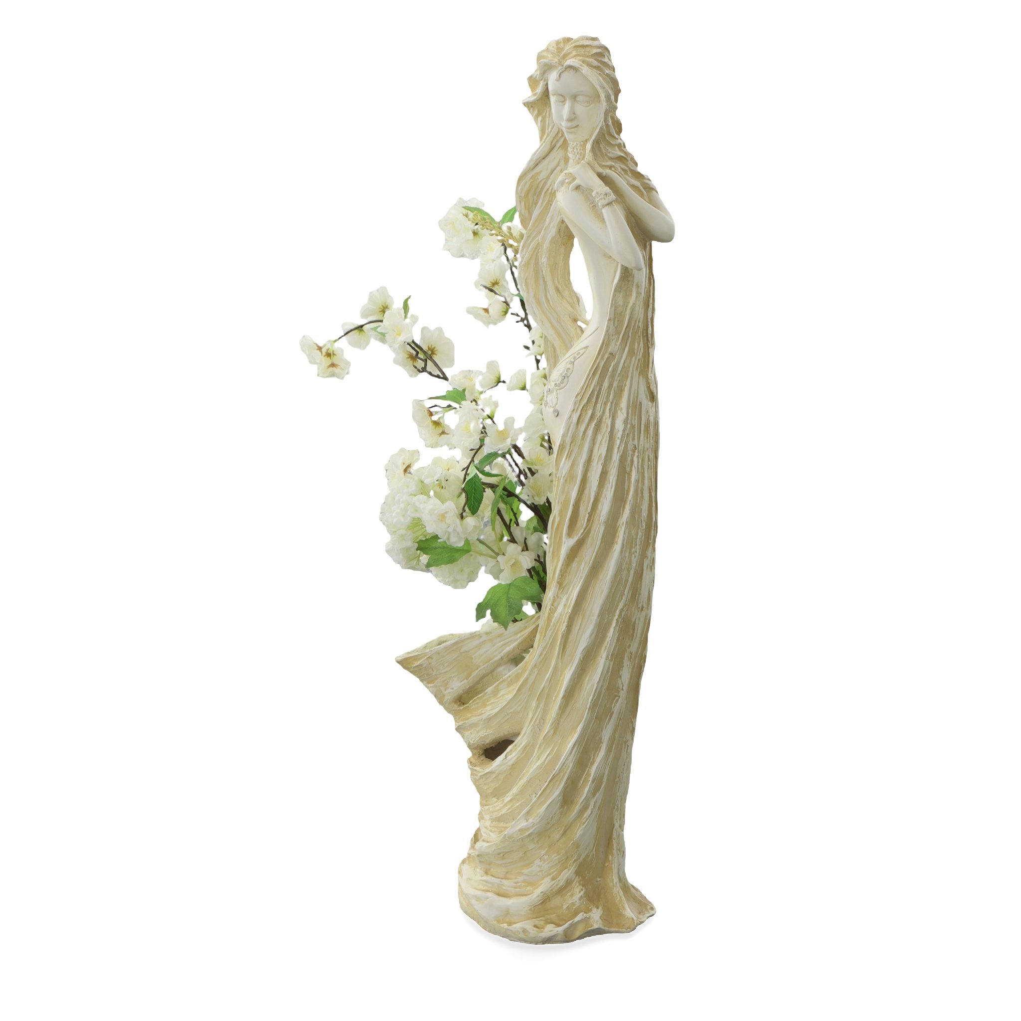 A 35.5" tall figural vase of an elegant lady with flowing hair and gown. From our Louis Palace collection, our Louis Palace collection is a collection of unique accessories encompassing designs from the House of Versailles. The royal residency of King Louis with his wife Marie Antoinette, who moved his royal court from Paris to Versailles, and the palace became a symbol of absolute monarchy and wealth around the world. This functioning art sculpture offered is hand cast in resin and features a hand finish of silver and soft golden hues over a ecru white background. Flowers shown are not included in this offering. However a customer can contact a customer service representative and have our floral artists quote creating a custom floral arrangement. Catalog:DTL-14061720 Dimensions:13.50 x 8.00 x 35.50