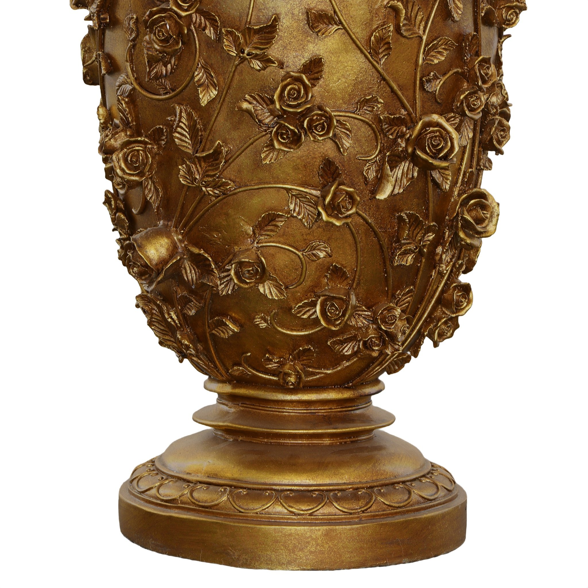 At 14.5 " diameter and 26.5" tall this is largest and most dramatic vase offered from our popular Golden Garden Collection. This item is artist designed and carved with beautiful and dramatically raised all over details of roses and vines resting on an attached base for added strength and stability. The finish is done in an antiqued gold leaf with hand applied contrasts and antique rubs to the details creating beauty and depth. Hand cast in resin. Often ordered in pairs for balance and a larger symmetrical decor application. This item also pairs beautifully with either the matching set of candleholders, jewelry box, charger or smaller vase from same collection. Catalog:DTL-14091001 Dimensions:16.25 x 16.25 x 26.75