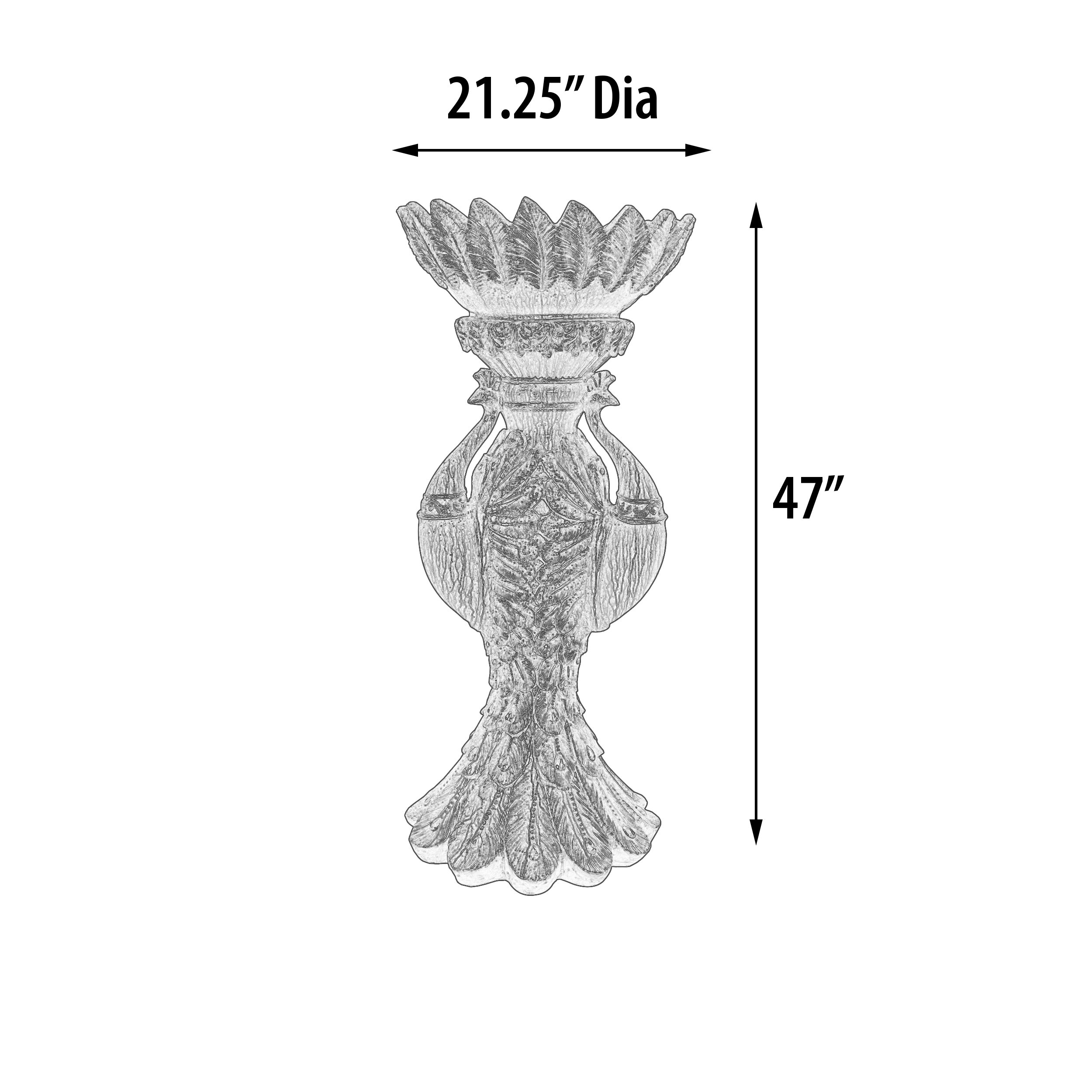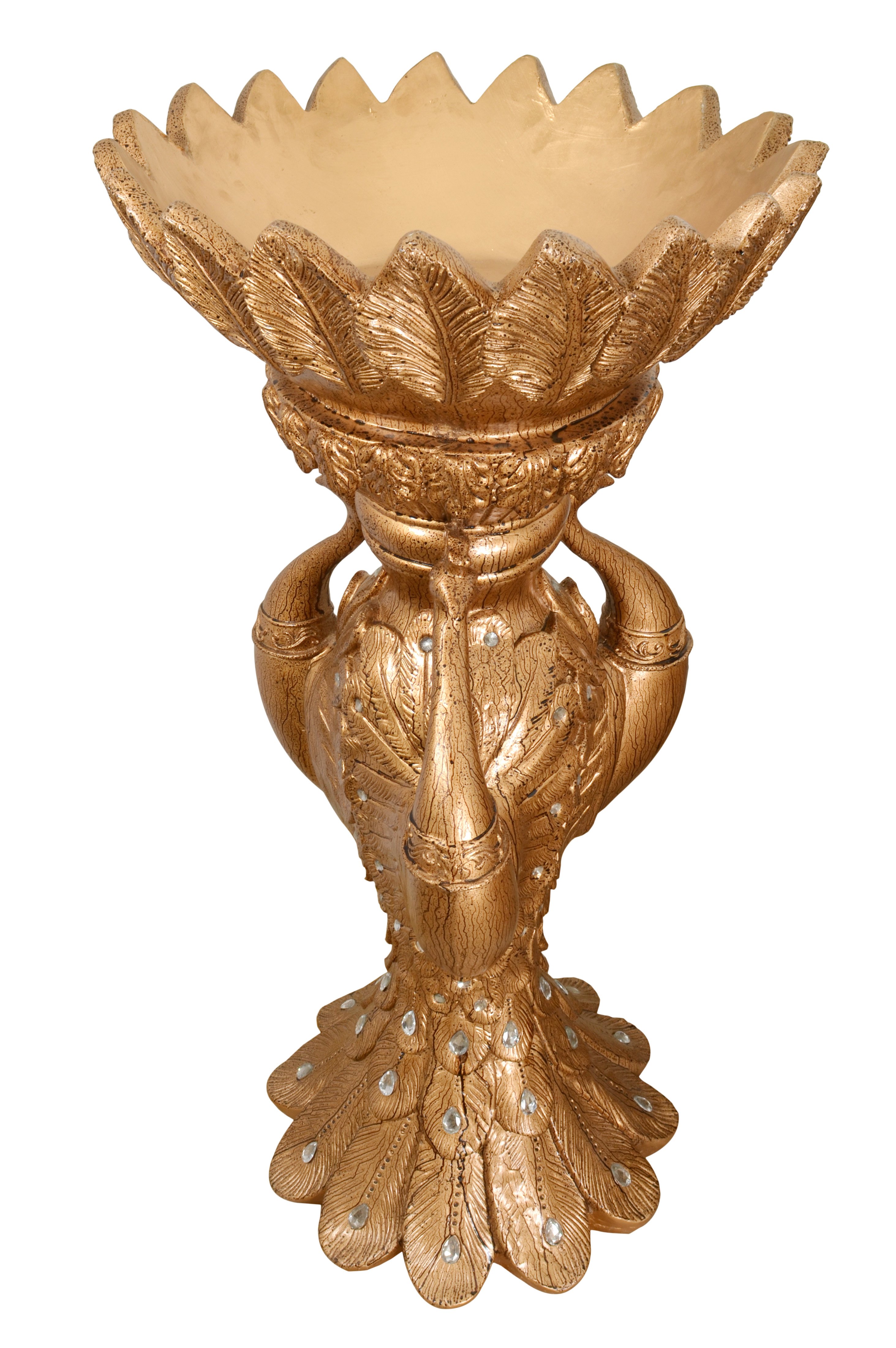 Our popular and a very unique Copper Drizzle Large Peacock Vase at 21" diameter x 47.5" tall. Featuring a rich hand applied copper drizzle finish with embedded jewels, from our Copper Drizzle Collection. The drizzled affect created uses a dark contrasting umber over a copper base and is further enhanced with a lustrous lacquer top coat. Sold separately but often ordered in pairs for balance and symmetry. This vase is also available in a smaller size consider pairing with the Copper Drizzle Peacock Vase. The vase is hand cast in a fiberglass resin which is durable and can withstand outdoor applications. The finish however is not recommended for outdoor use unless maintained with protective lacquer top coatings. The frequency of which will depend on your specific conditions.