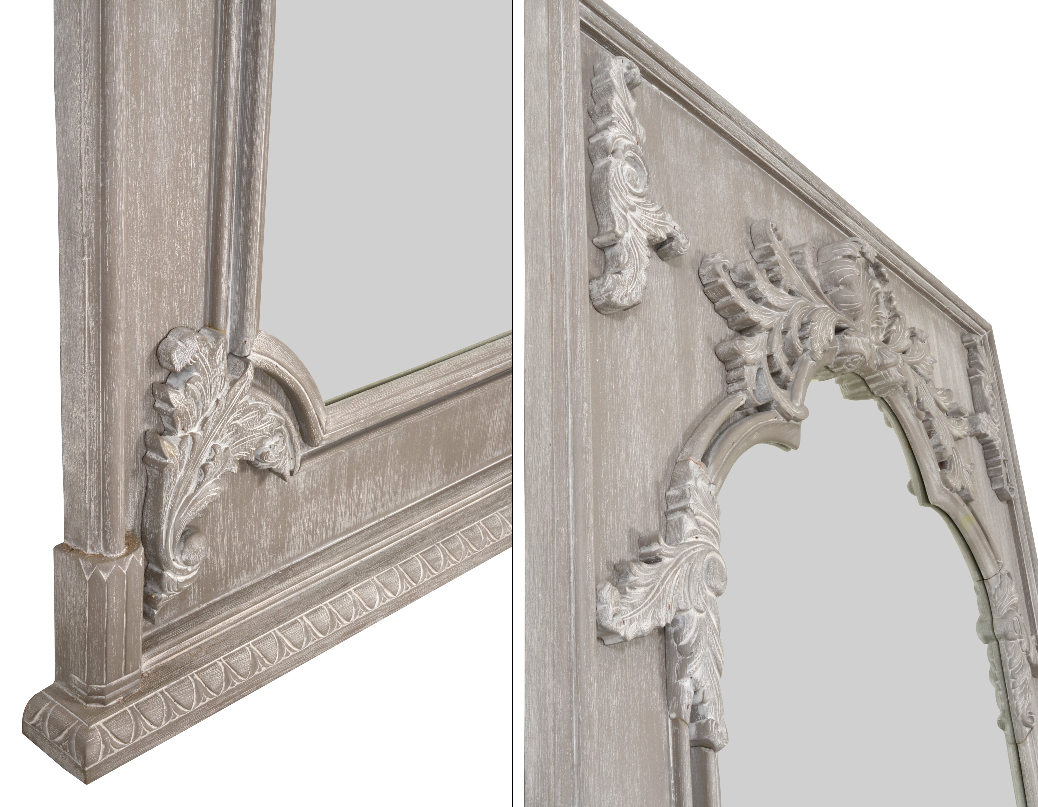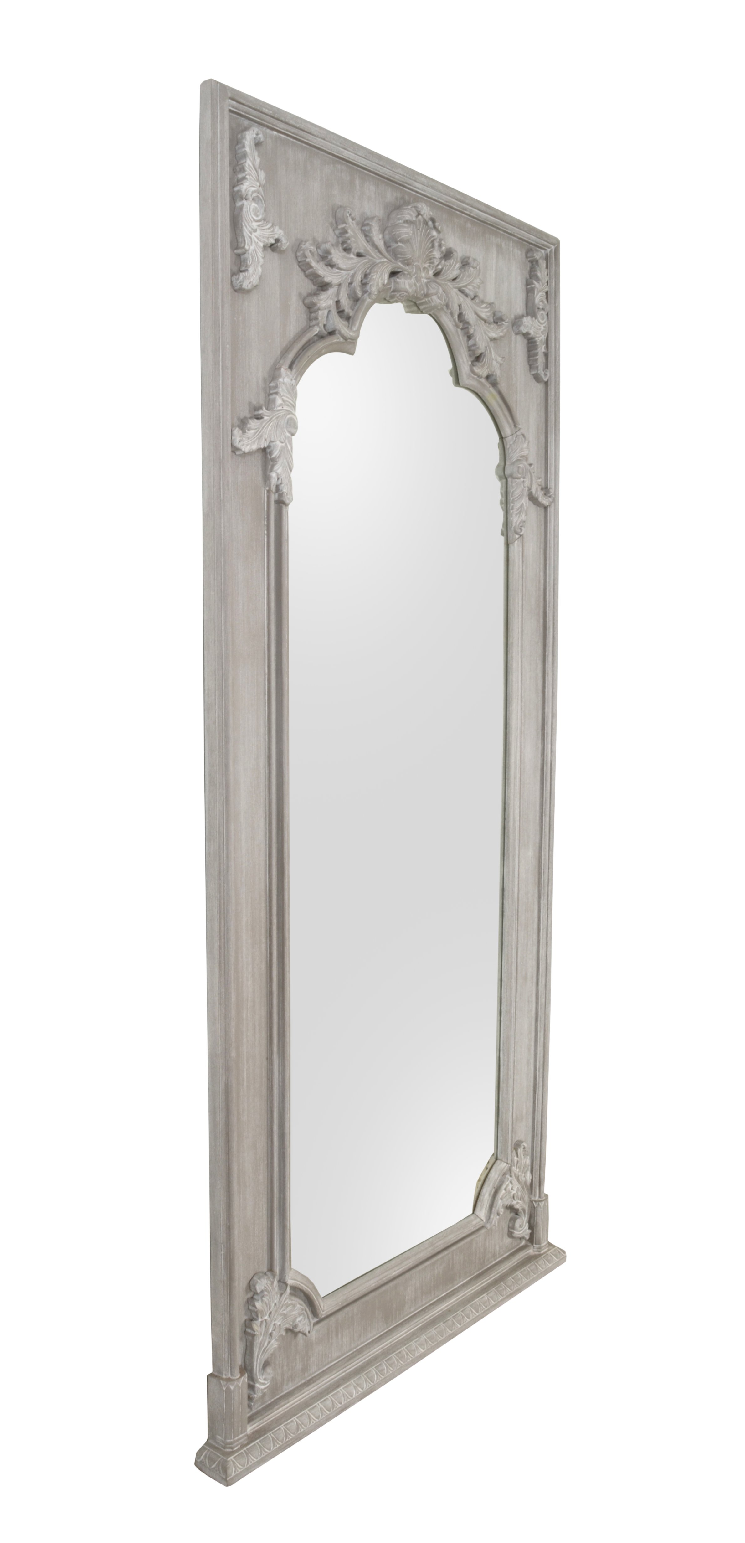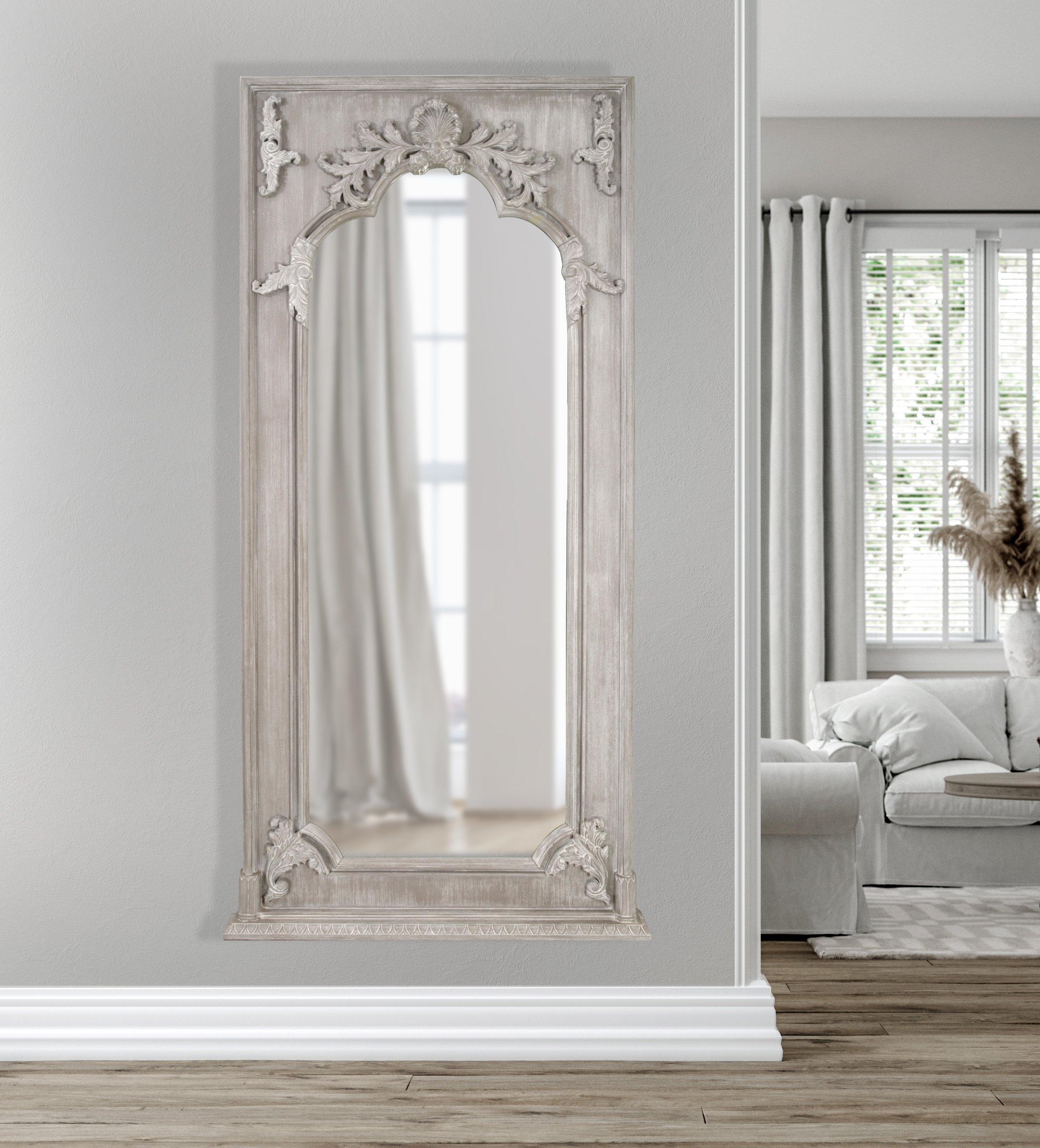 With a touch of modern sophistication, the Grand Carved Floor Mirror in the Mystique Gray Finish is a distinguished piece. Standing at an impressive 95 inches tall and 45 inches wide, this floor mirror is not only a practical addition to your room but also a significant style statement, bringing contemporary elegance and refined beauty to any setting. This exquisite mirror is meticulously crafted from kiln-dried mahogany, ensuring its structural integrity and longevity. The mahogany is carefully selected for its quality, then subjected to a detailed kiln-drying process to prevent any potential warping or cracking. Following this, each piece undergoes extensive stress and pressure testing, affirming its durability and readiness to stand the test of time. The Mystique Gray Finish is what truly sets this mirror apart, offering a sleek and modern aesthetic that complements a variety of interior styles. This finish provides a subtle yet impactful gray hue, enhancing the mirror's intricate carvings and adding depth and character to the piece. The sophisticated color palette of the Mystique Gray Finish allows it to integrate seamlessly into both contemporary and traditional decors, providing a versatile and chic option for your home. Heritage Furniture stands behind this beautiful mirror with a 5-year warranty, showcasing their confidence in its quality and craftsmanship. Furthermore, the Grand Carved Floor Mirror is available for customization in any Heritage finish, giving you the flexibility to tailor it to your personal taste and interior design. Whether used as a striking accent in a living area, a statement piece in an entryway, or a functional accessory in a dressing room, this mirror in the Mystique Gray Finish brings a sense of modern grandeur and timeless style to your home.