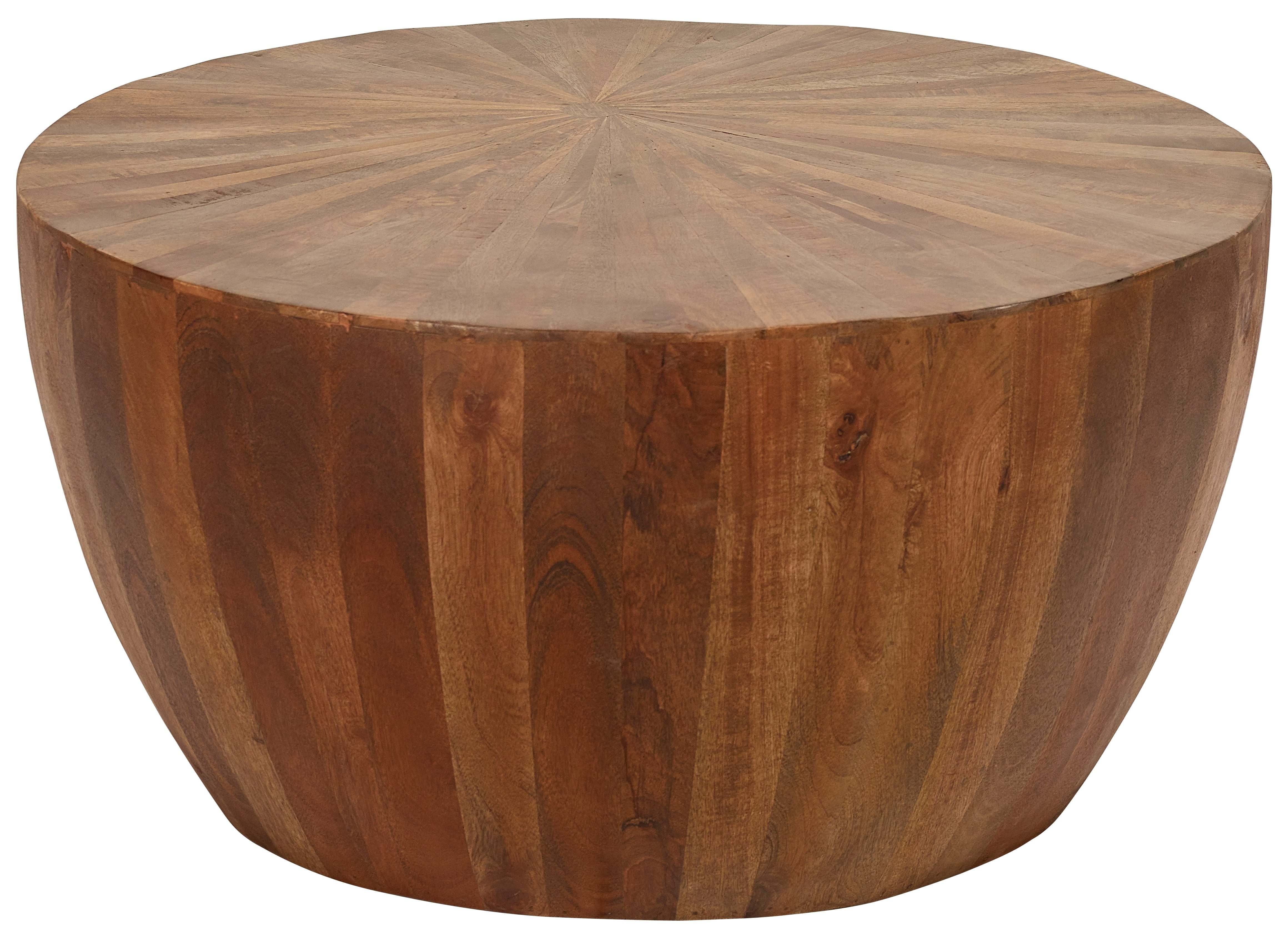 Mango Wood Solid Parquet Round Coffee Table 36 Inch Diameter offers a pleasingly shaped Round coffee table built using Solid Mango hardwoods in an artistic parquet design. Perfect for a more contemporary Rustic Decor. Naturally finished with a satin sheen that protects and enhances the wood for long term use. The grain of the Mango Wood offers beautiful variations of natural color with rich depth and tone. Sold Separately but often combined with the matching Mango Wood Solid Parquet Round Side Table 18 Inch Diameter for a complete set. Hand Made in India for AFD Home. No Assembly Required
