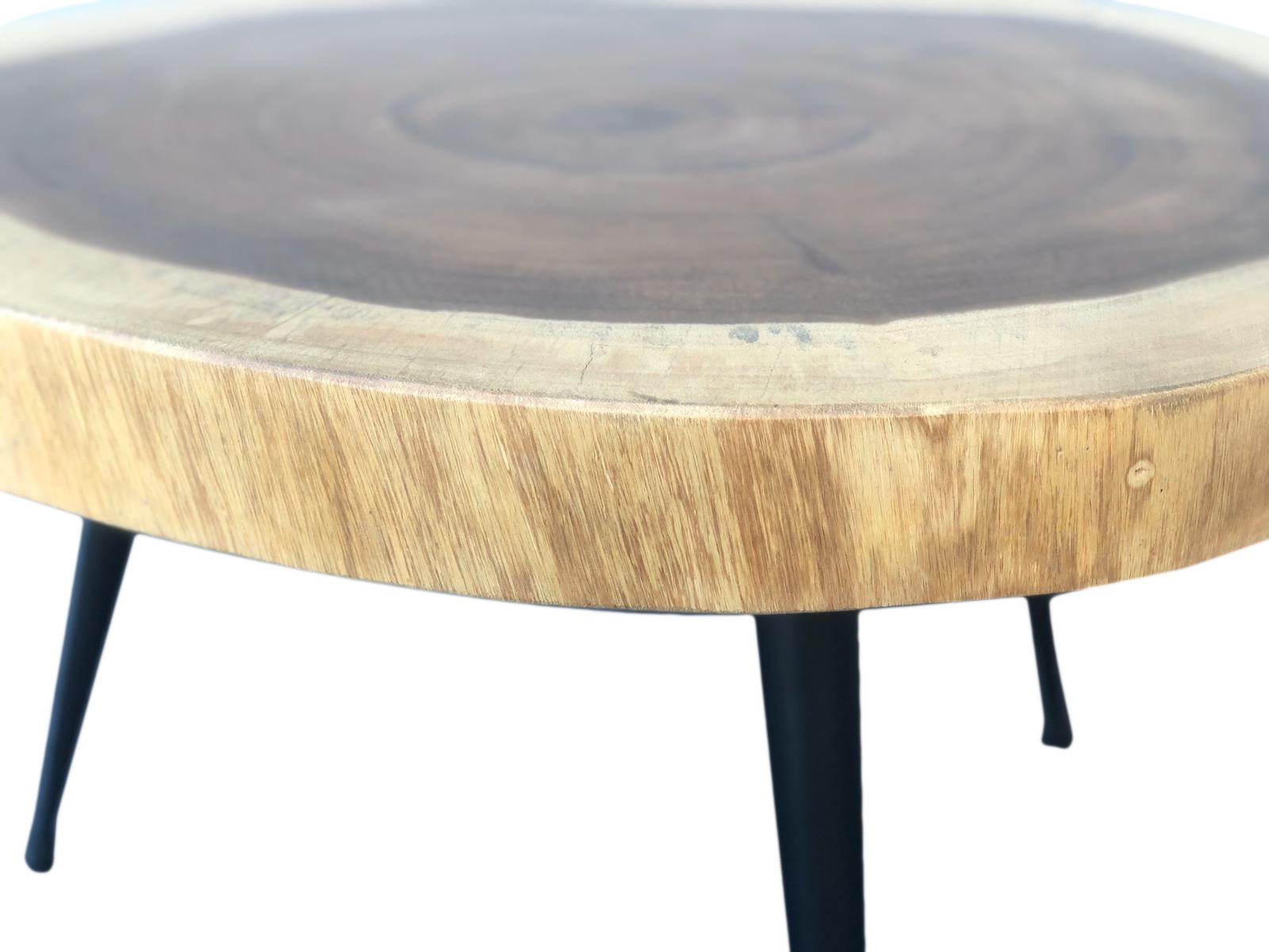 A natural Slab of Suar wood suspended with 3 modern iron legs a perfect height for a Cocktail Table or Occasional Table. The sizes and shape will vary slightly but we select specimens that fall within the 27' to 31.50" width and depth. Suar Is A beautiful Natural Wood And each specimen will vary Slightly In Grain, Texture And Finish Color. A Natural Hand Product Of This Type will come with all the Natural Inclusions Which Makes The table Beautiful. Suar Wood Aka Monkey Pod Wood Is Strong, Very Durable, And The Color And Grain Of The Wood Is Pleasing As You Will See Tones From Light Yellow Sapwood To Rich Dark Chocolate-Brown Tones Of The Heartwood. The Rich Color And Beautiful Grains Of The Heartwood, Resemble Black Walnut. Suar Wood Only Requires Basic Maintenance Such As Soap and Water To Maintain. For Environmental Concerns Suar Is Not On Any Endangered species List And It Is Eco-Friendly. The Suar Tree Is Aptly Nicknamed Monkey Pod Wood For Its Beautiful Crowning Arbor Sometimes Reaching Heights Of Up To 80' Tall And As Such A Favorite Yet Bountiful Play Tree For These Local Residents. Enjoy!