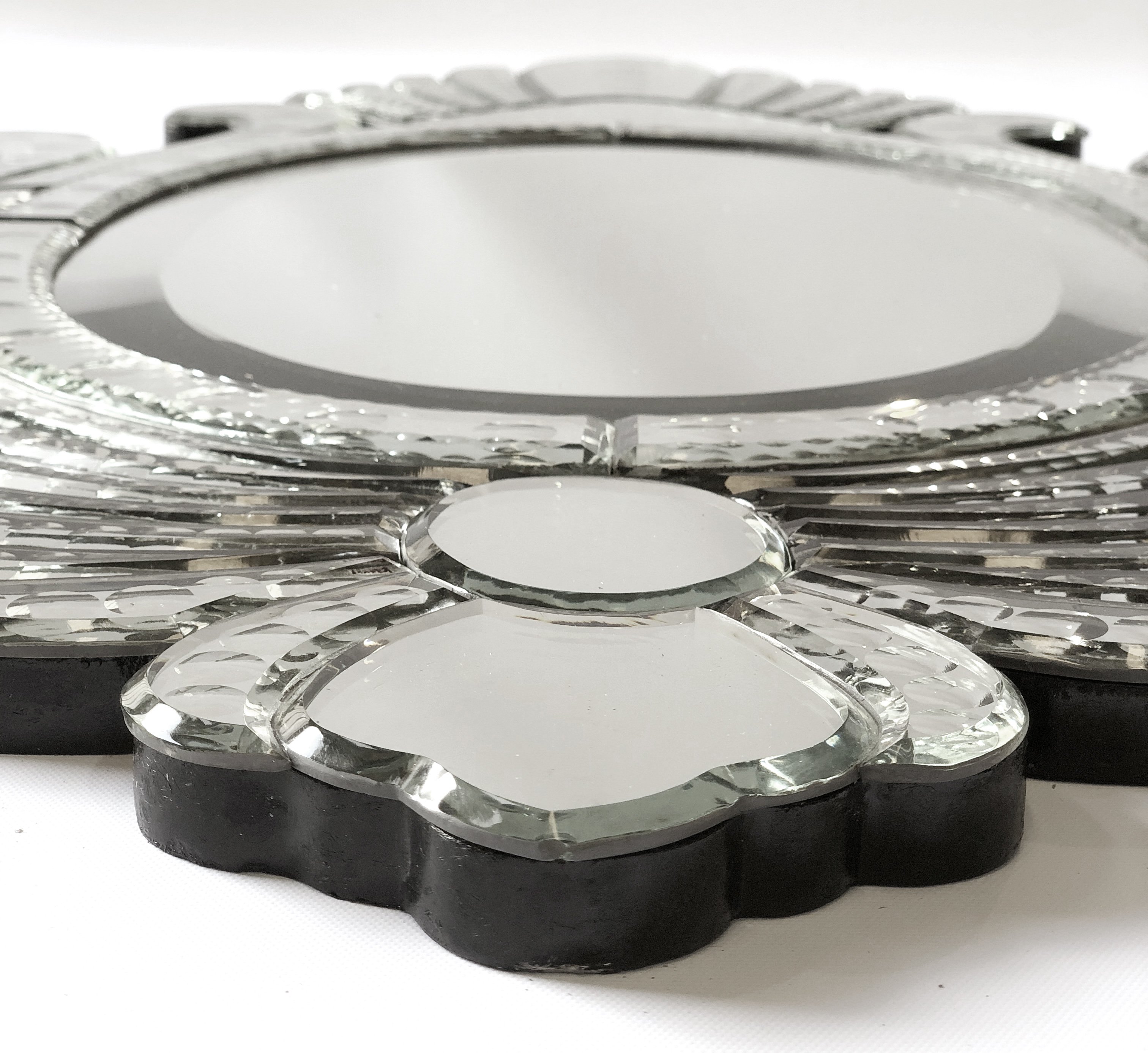 A unique Artistic perception of the Royal Peacock in Venetian Style Prismed Mirror. Peacocks for their Royal Beauty have been used in Design dating back to Opulent Royal Courts of India, carried on through generations, Beloved and favored by Tiffany during the Opulent Art Nouveau Era and still popular Today. The Artist Interpreted the beauty in this unique modern designed Hand Made Venetian Style Royal Peacock Mirror standing 36 Inches tall. Normal Glass Cleaning is fine. The item comes fully assembled and can be simply hung with the Hanging Hardware Attached to the back. The right mirror surely makes a big difference in making a room setting more beautiful. Venetian Mirrors are considered amongst the most elegant and beautiful mirrors made and they will become a cherished treasure for future generations to come. While a Venetian Mirror is always a functional Artistic Focal Point they also serve to enhance elegant living spaces. Interestingly a well placed Venetian Mirror with its highly reflective light qualities also serve to increase the amount of interior light in a room and will brighten up your room. Today as has been for 100's of years before Venetian glass craftsmen still use time-proven hand crafted, artistic techniques often handed down from generation to generation From techniques of hand cutting, hand beveling, hand polishing and hand etching and the smaller the pieces the more pieces the finer the finished work. So congratulations on your selection of this fine Venetian Style mirror you have purchased amongst The Best The World Has To Offer.