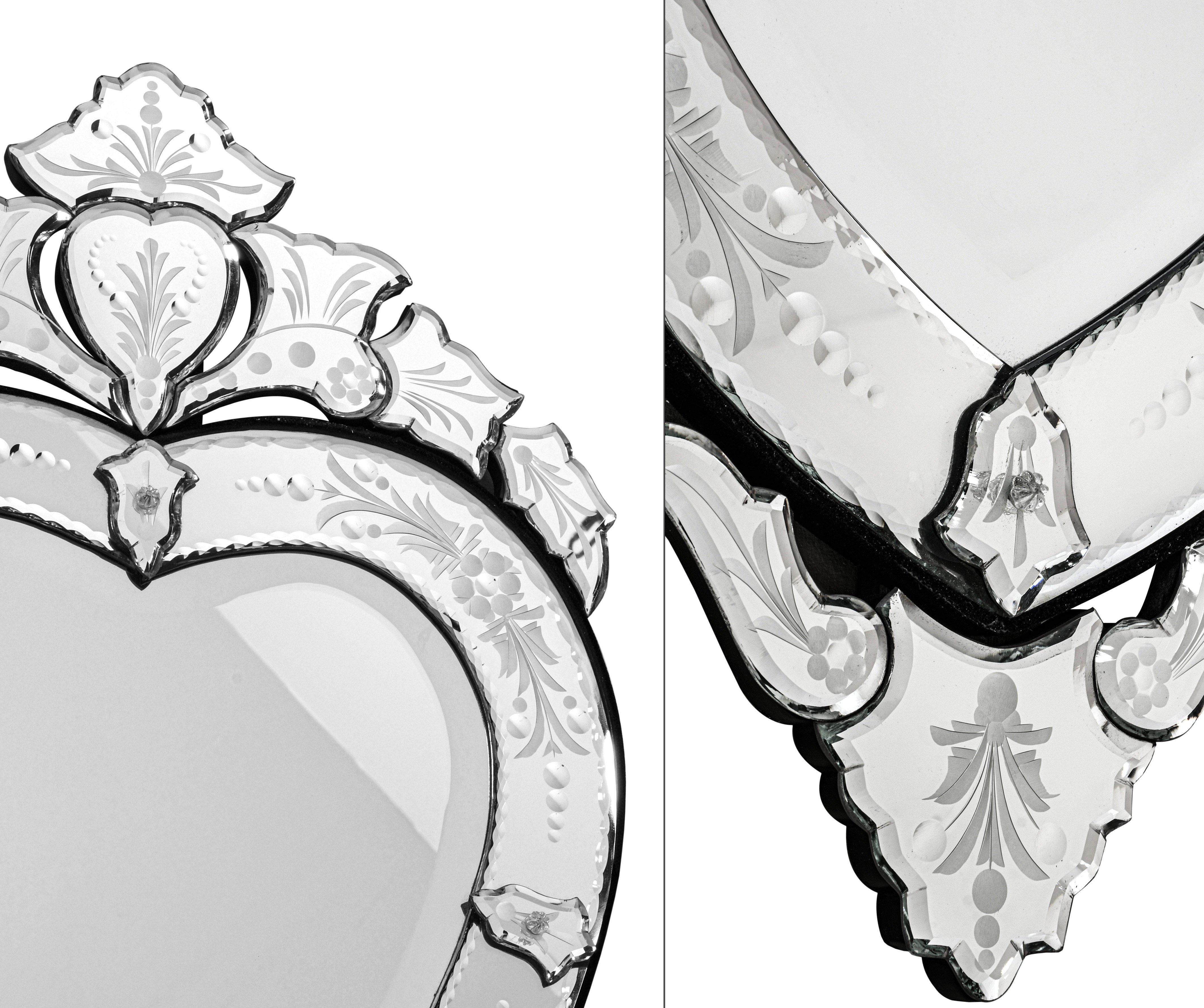 For the love of your life or just for love the elegant traditional Venetian Glass Heart Mirror by Timeless Reflections is simply beautiful. Individual pieces of mirror glass are hand cut and then etched by hand capturing the classic Venetian design. The etched mirrored glass is then attached to a strong wood back to support the delicate beauty of the mirror. Nearly 32 inches high the Venetian Glass Heart Mirror is a timeless design everyone is sure to treasure.