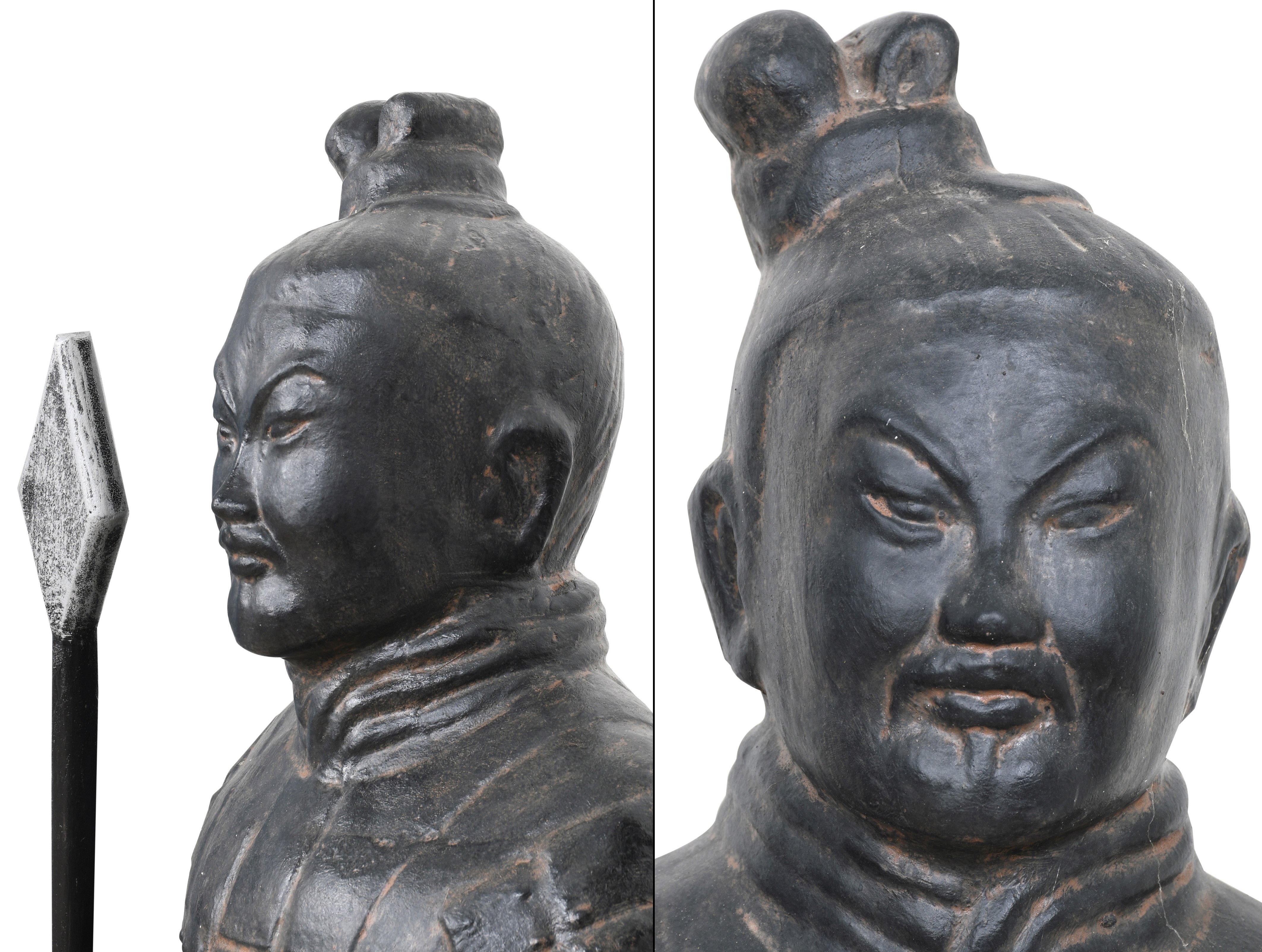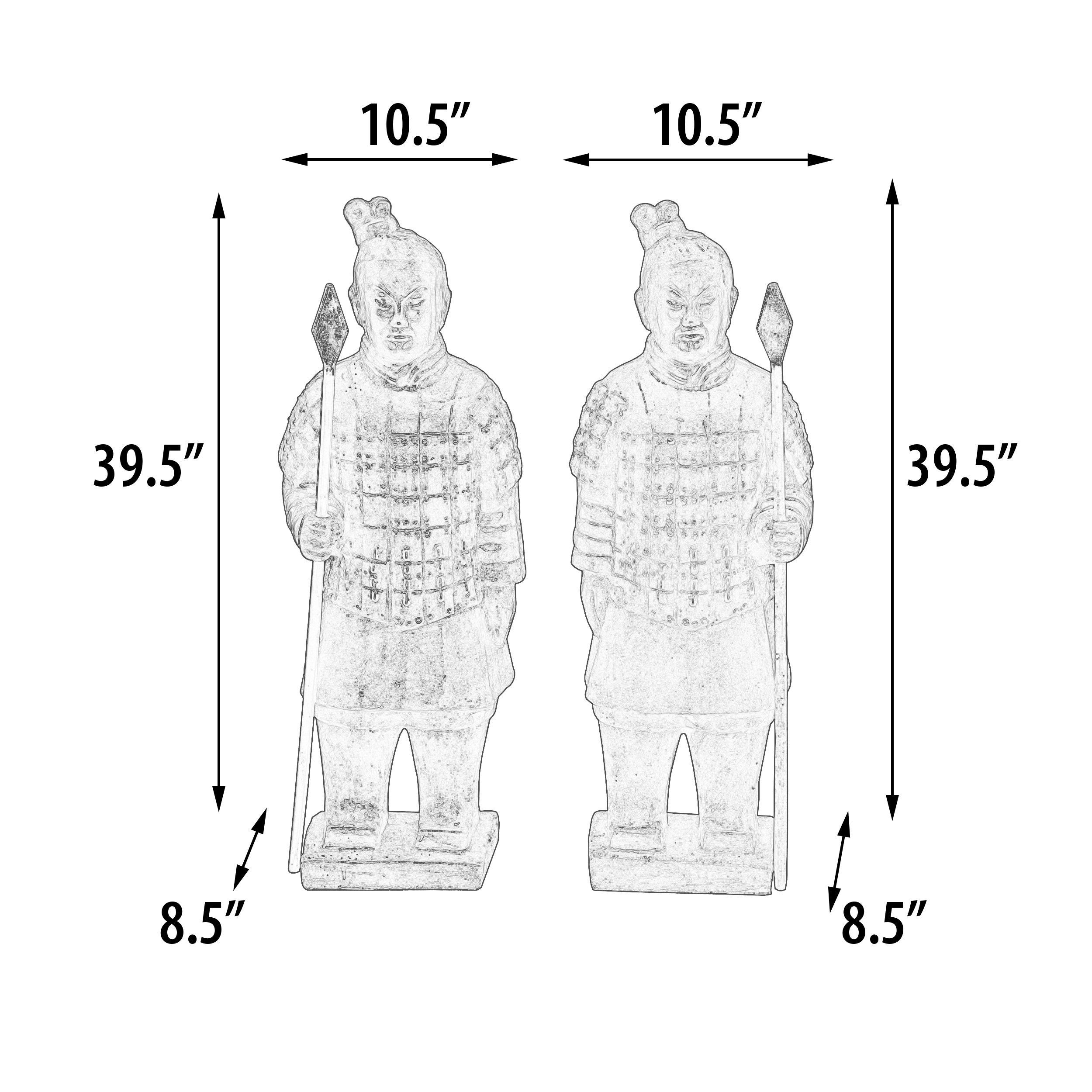 The left and right standing pair of standing terra cotta warriors comes in our black earthy finish 42" tall. The sculptures are individually hand cast and hand finished in a durable fiberglass and cast stone reinforced material. The black earthy finish is durable and offers an authentic antique quality and richness. These recreations of todays' famous terracotta army depict the bravest and most loyal of soldiers from the guards of qin she Huang, the first emperor of China and creator of the qin dynasty. It is said qin, in order to have the same military power and protection in the after life, was buried with 1000's of these soldiers in 210–209 bce who for centuries to come protected the emperor buried, the tomb was discovered in the 1970's by a farmer. These 41" tall smaller sized sculpture are suitable for outdoor or indoor use and could be displayed proudly on the floor or a table top. The set of 2 arrives individually crated and completely assembled with Chinese spears of war mounted in each warriors raised hands.