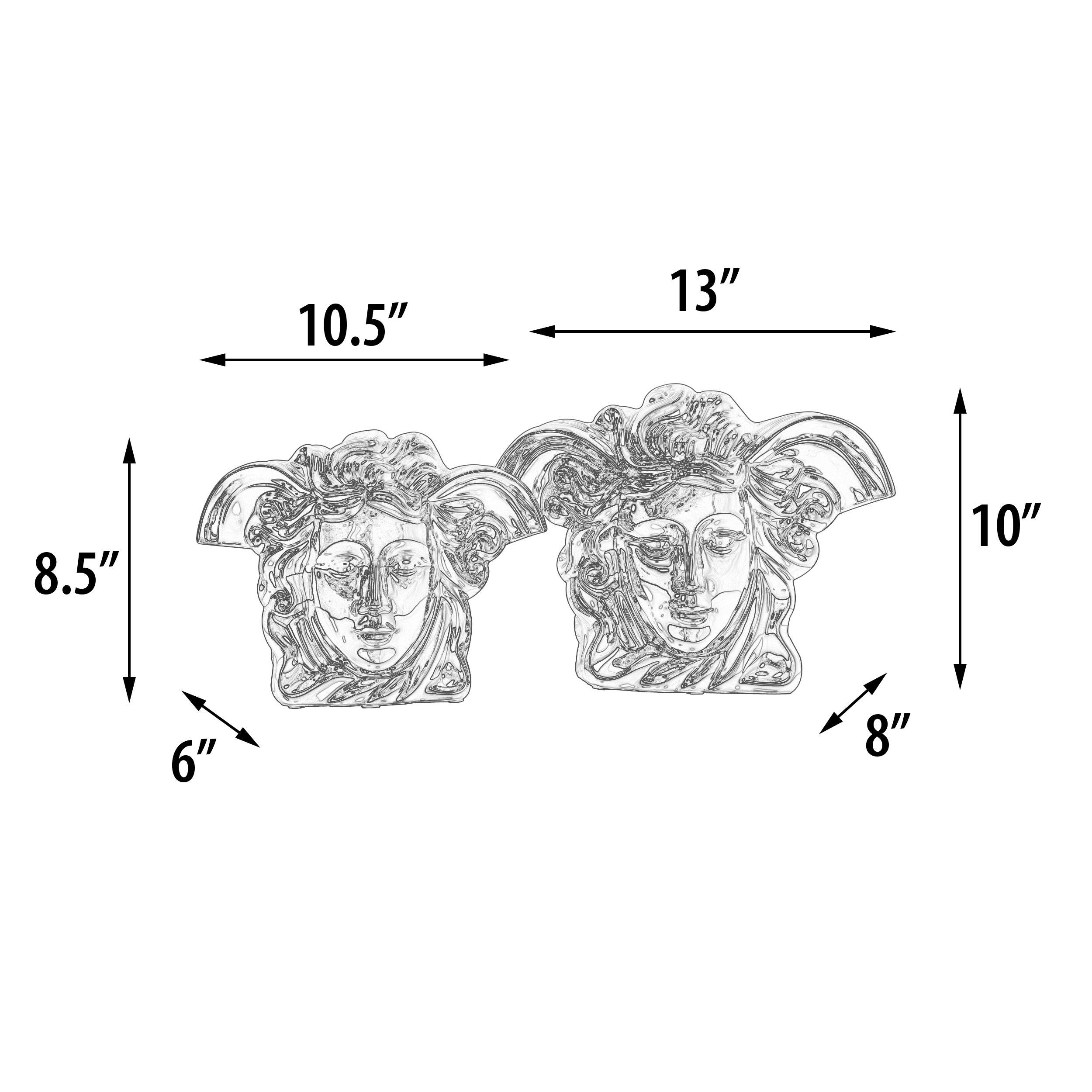 The Medusa set of 2 vases are finely cast in ceramic and hand finished. Each table vase has been cast using hand carved molds with attention to detail in capturing the essence of Medusa. Reflections from the mirrored finish dance over the surfaces highlighting shadows that enhance the three-dimensional depth of the vases. Suitable for use with faux flowers, each vase has an opening large enough for a small house plant. Even if not used as flower vases the Medusa vases are beautiful when used alone. The sleek silver mirrored finish and clean design are appropriate for use in either contemporary or modern design spaces.