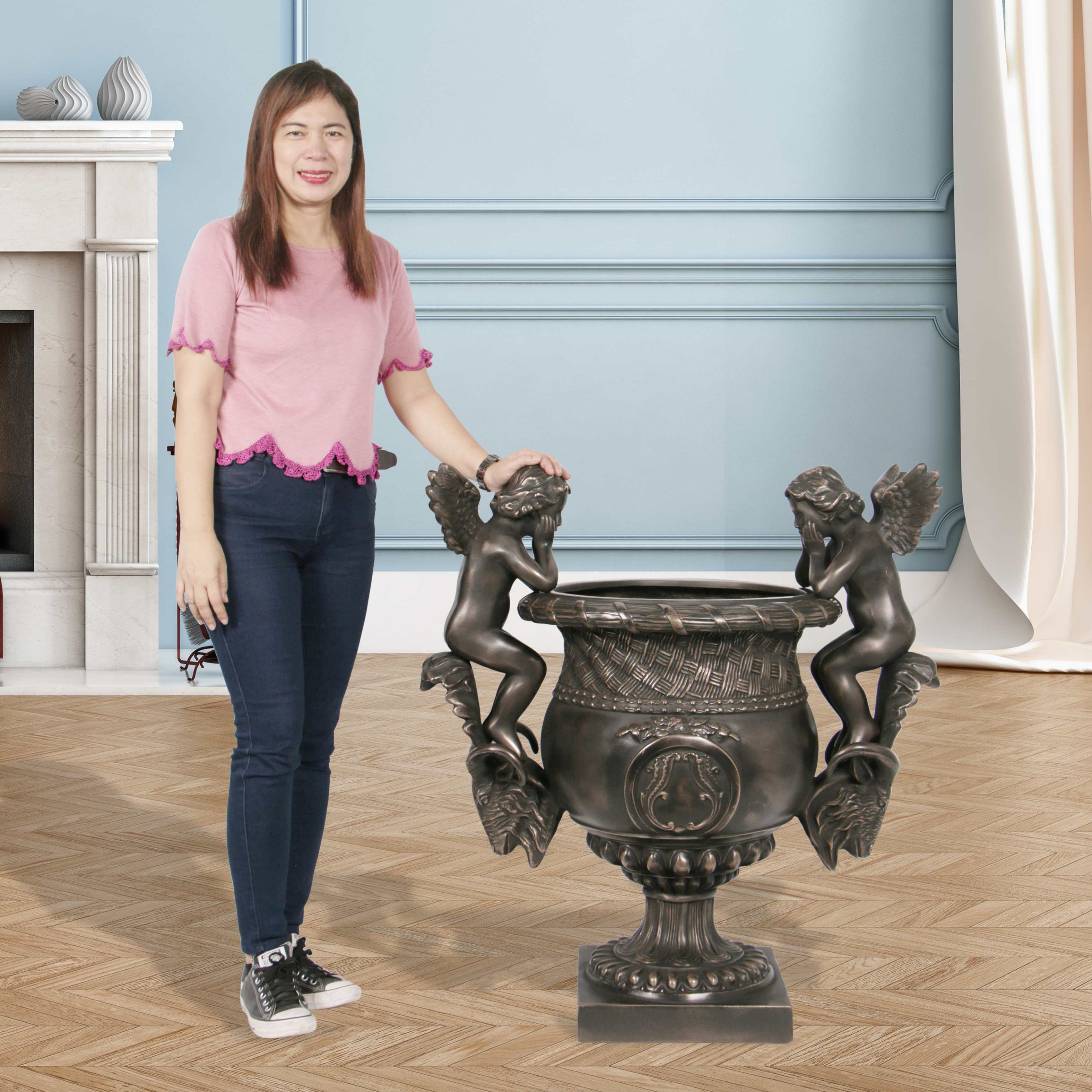 The Angels Urn Imperial Bronze Finish is a beautiful planter, suitable for holding flowers, bushes, or trees. It offers an elegant solution for an interior application of a fine home or business. Angelic pondering Cherubs flank this Neoclassical designed urn. It sits 38 Inches Tall and is finished in an amazingly authentic looking Bronze finish. The Imperial Bronze finishing used actually uses metal in the finish and has been polished, giving it a rich luster and a hard to achieve a real Bronze effect at an affordable value for the creation. The item is Hand Cast in a durable Fiberglass. It is sold separately but often ordered in pairs for a balanced presentation. Hand made exclusively for AFD Home Collection in the Philippines.