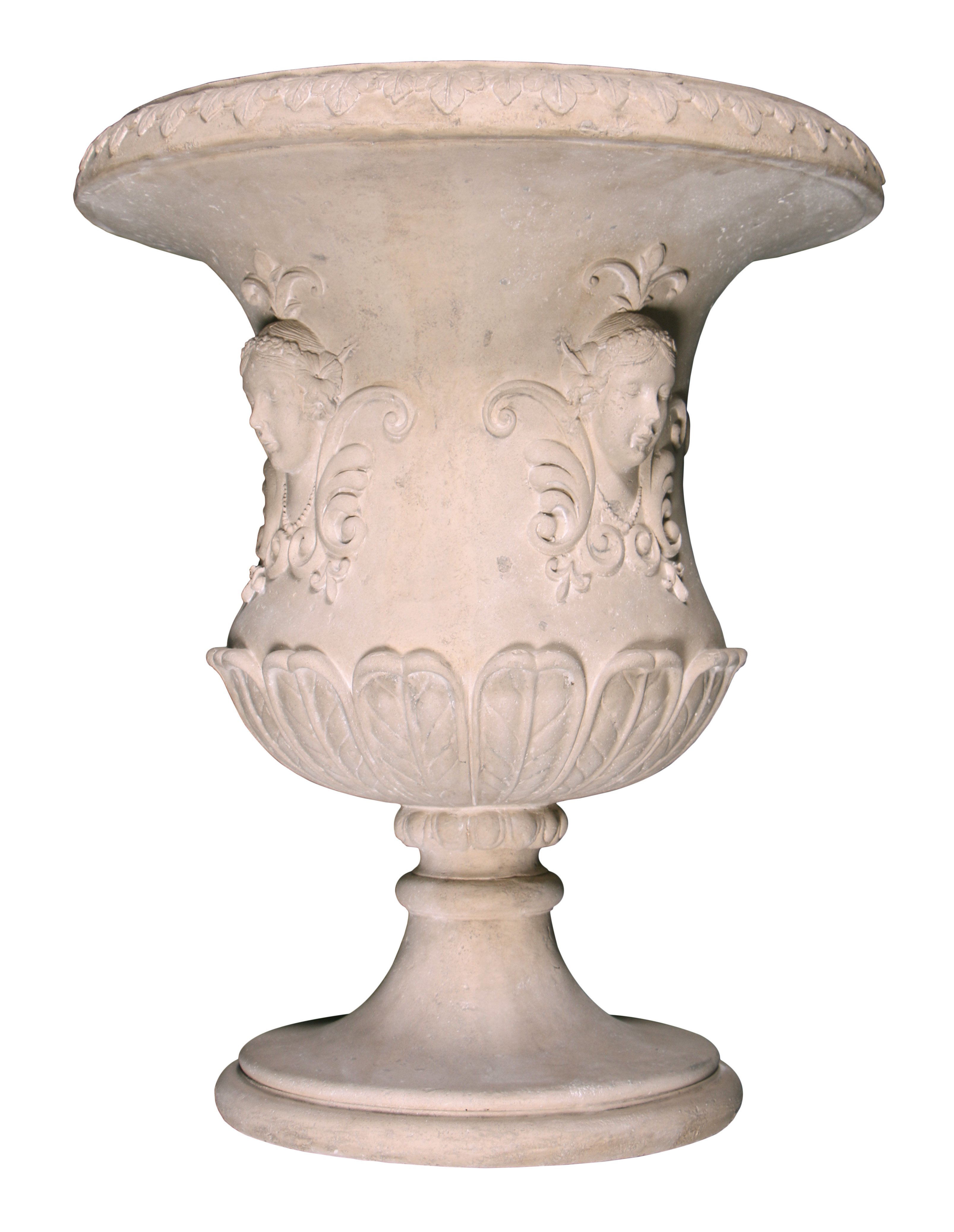 The Classic Lady Mask Urn Stone Cast is a beautiful planter, suitable for holding flowers, bushes, or trees. It offers an elegant solution for a defining home or business garden. This Traditionally designed urn is surrounded on all 4 sides with classical lady mask motifs. The item stands an impressive 36 inches tall. The urn is Hand Cast in a durable Fiberglass reinforced Stone Resin. The finish is weather resistant for extended use outdoors or suitable for a stone effect for interior use. It is sold separately but often ordered in pairs for a balanced presentation. Consider the option of using the Plinths separately. Hand made in the Philippines.