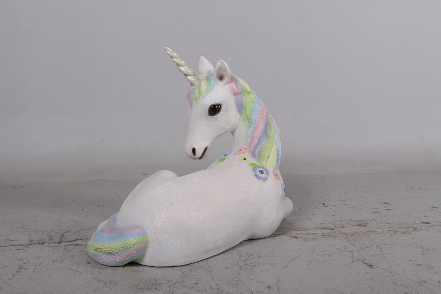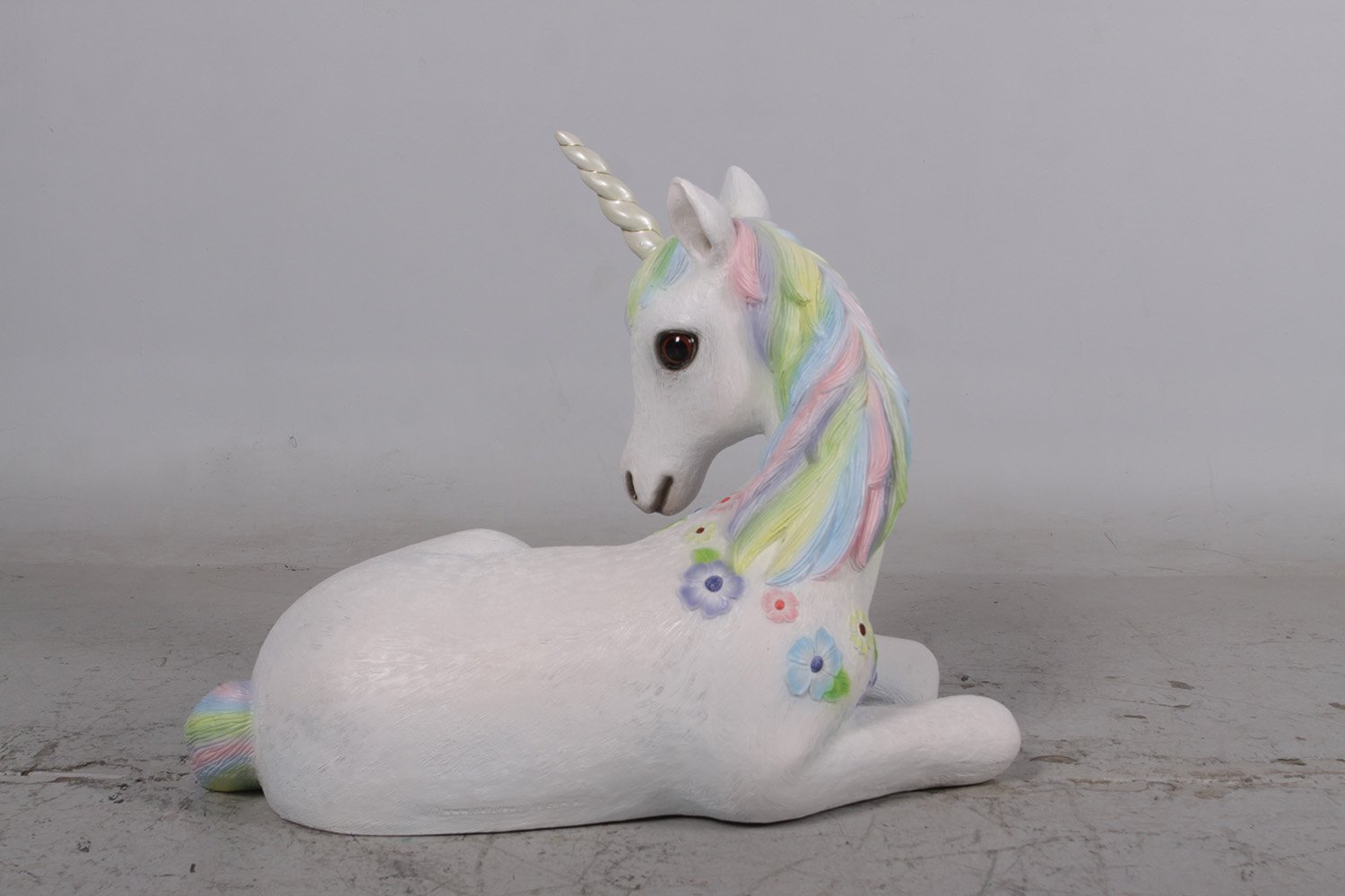 Our Unicorn Foal Resting Rainbow is 26" long. It is a fanciful creation that will bring smiles and pleasant dreams to young and old. The unicorn also the symbol of Scotland is a legendary horse-like creature described since antiquity with its pointed, spiraling horn and said to possess magical powers and heal sickness. The item is hand cast in durable Fiberglas and Hand painted beautifully in white with a rainbow of colors softening its mane.