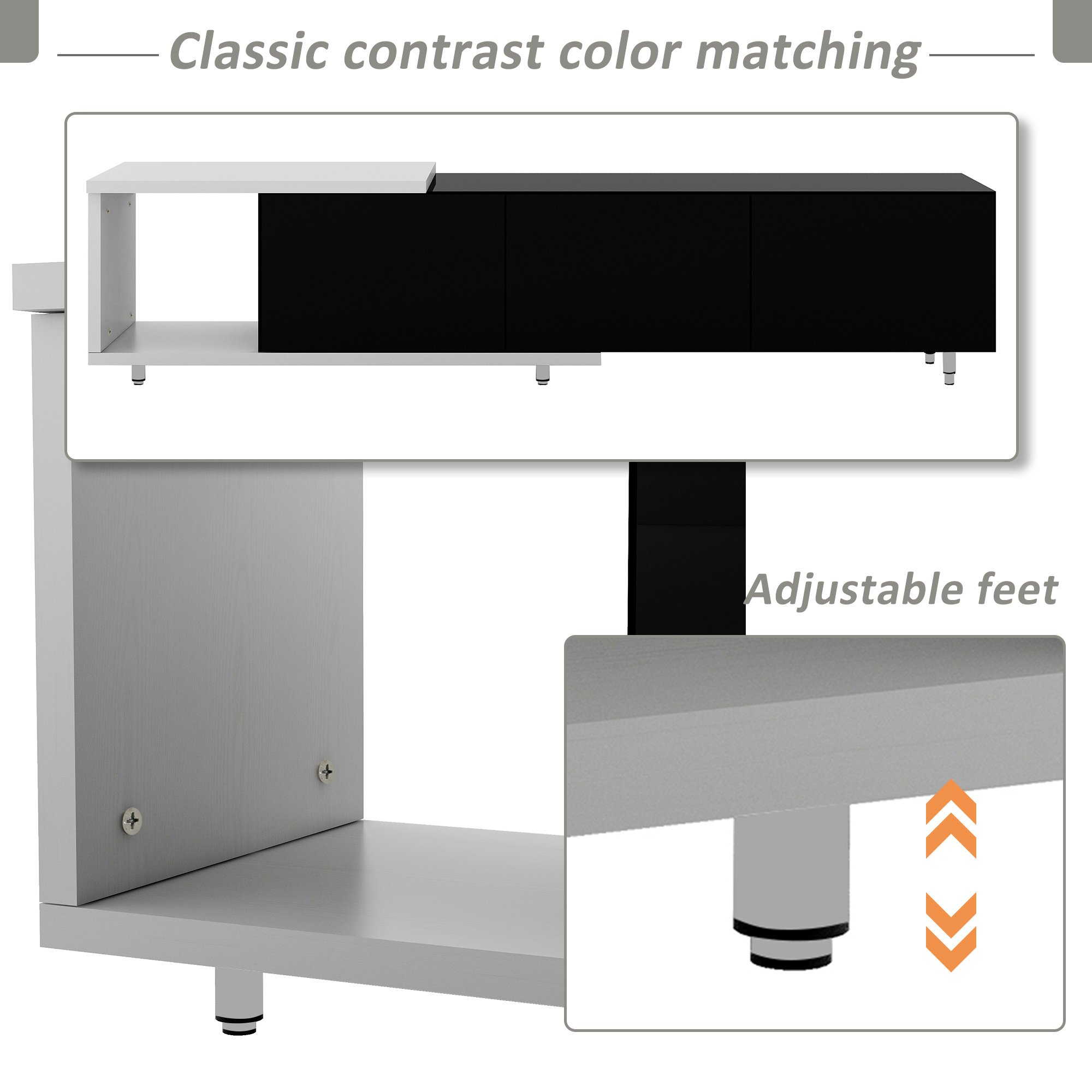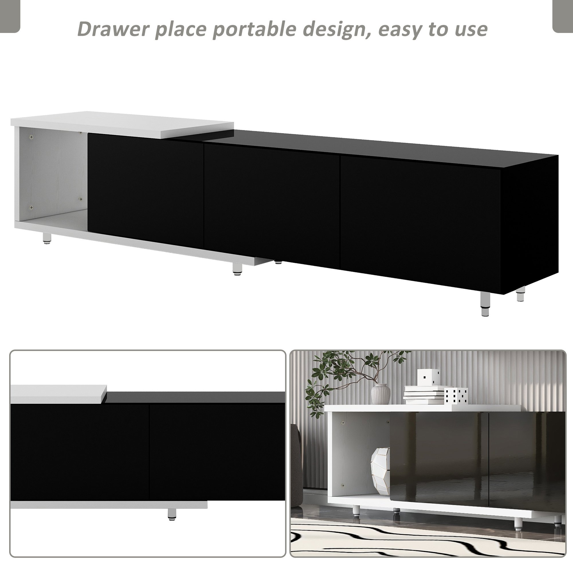 This TV stand brings elegance and modernity to your living room. Particle board with a clean-lined silhouette in black & white lacquered hue fits into your existing arrangement easily. Designed with a smooth and wear-resistant tabletop, this functional TV stand provides plenty of space for the TV screen and decorative accents, while it features 3 large drawers for internal storage. And offers extra and flexible storage space. Stylish, functional, and high-quality, this TV stand is a wise choice for your home furnishings needs.