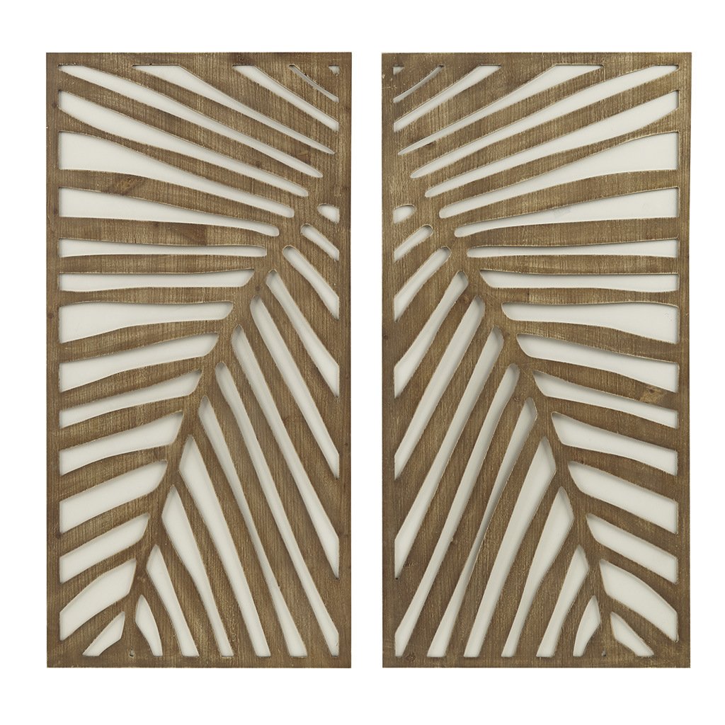 Dimensional wall art panel set with palm leaf design in a natural wood tone on on a contrast white ground