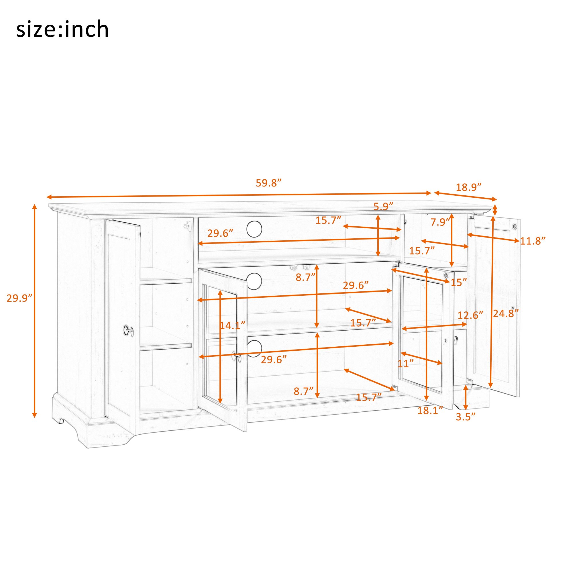 TV Stand29.9'' H x 18.9'' D x 59.8'' WTop Weight Capacity75 lbsShelves Capacity30 lbsCabinets Capacity20lbsTable Top Thickness1.18''Clearance-Floor to Bottom1.18''