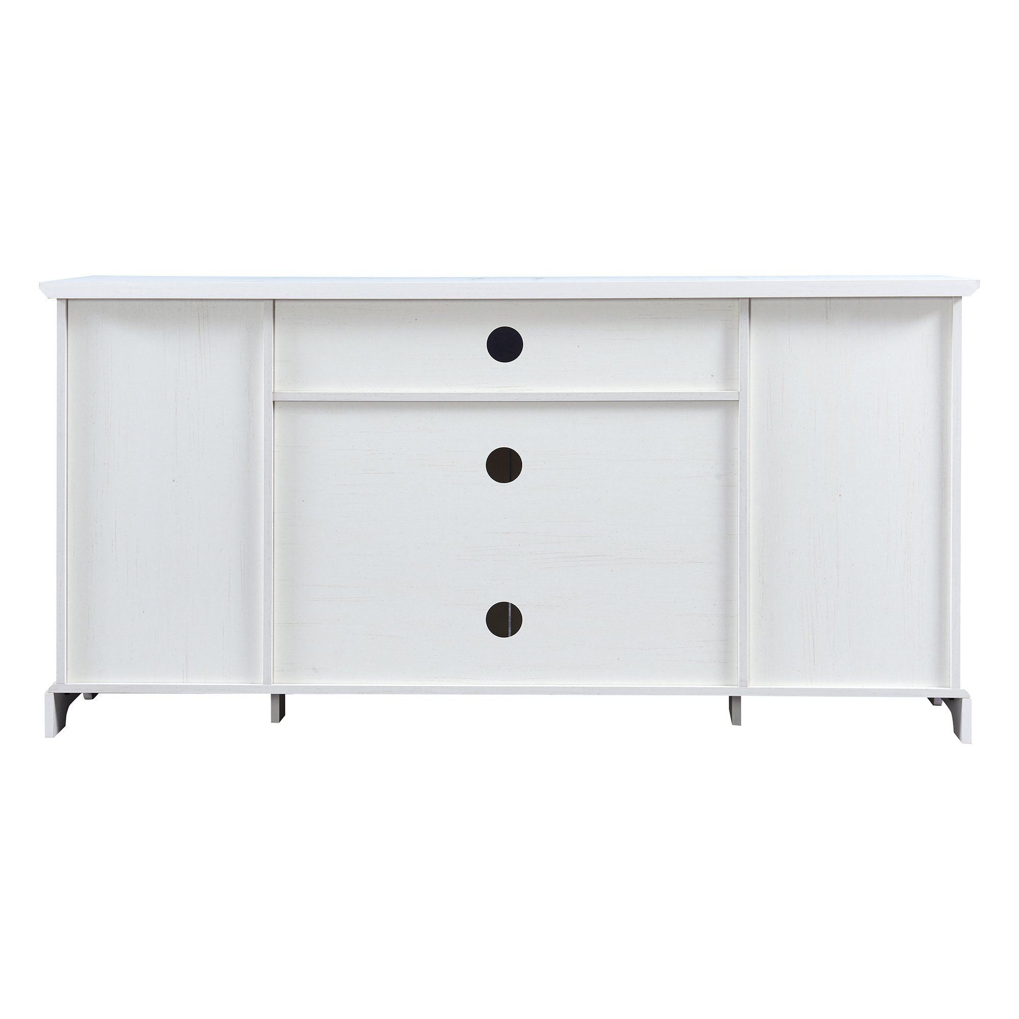 Integrate a transitional feel into your living room with this highboy console. This console is a practical piece ideal for storing room essentials, from your movies to your books and decor, as it has open and closed shelving.Functioning as a TV stand and entertainment center, this media console can accommodate most flat panel TVs up to 65 inches and have three cable managements feature in the back for a tidy appearance.Side cabinets feature adjustable shelving so you can easily fit your items inside, with tempered glass doors for a stylish look.